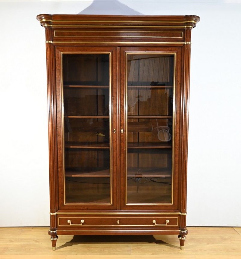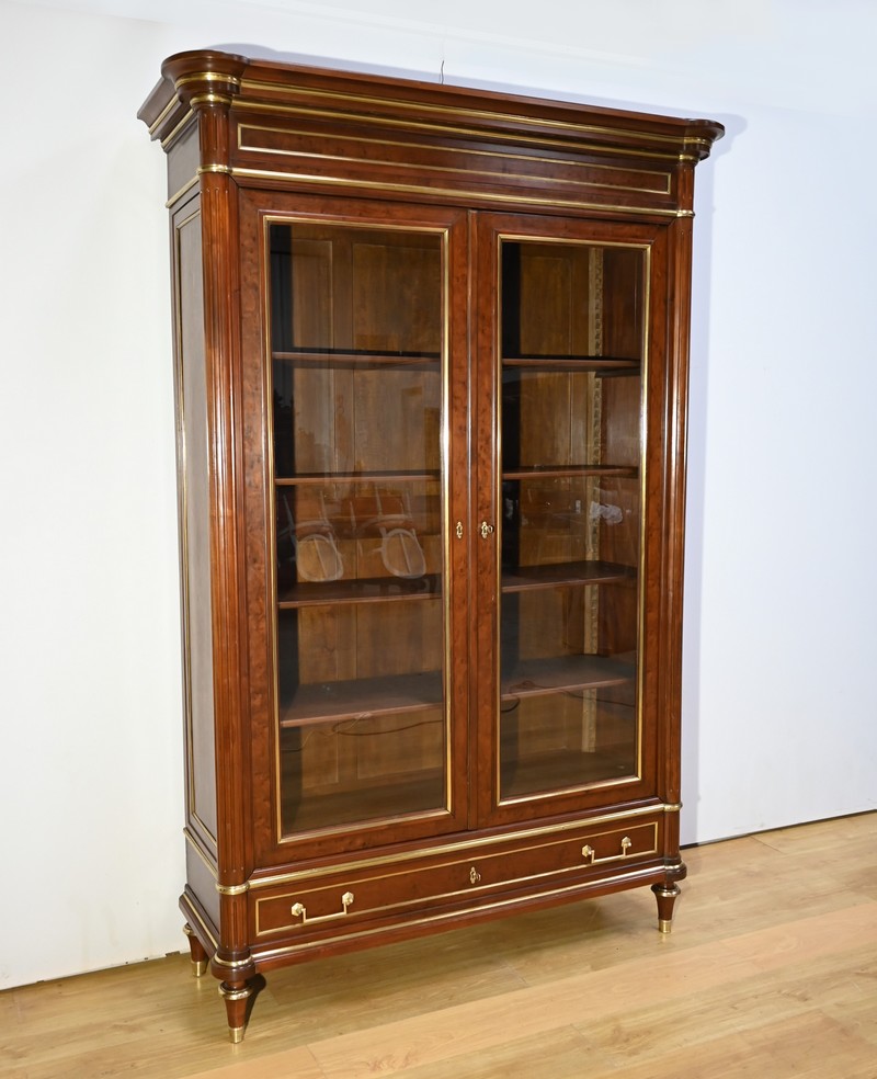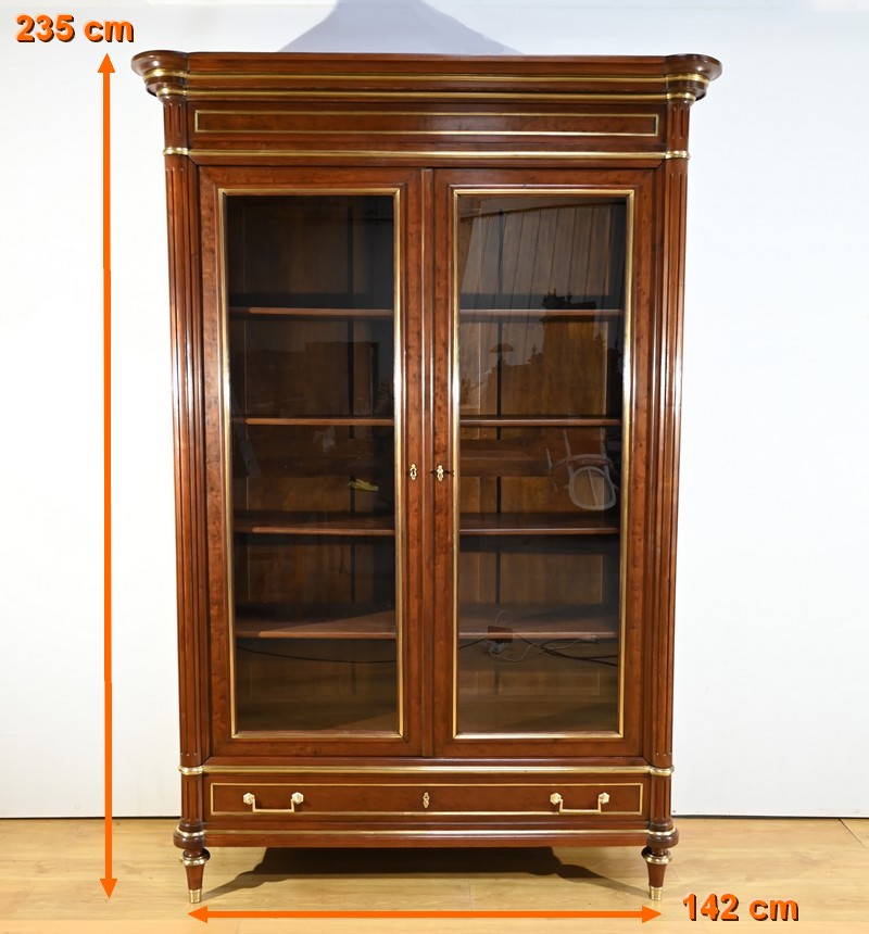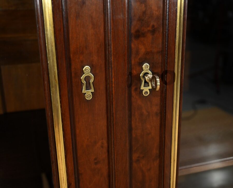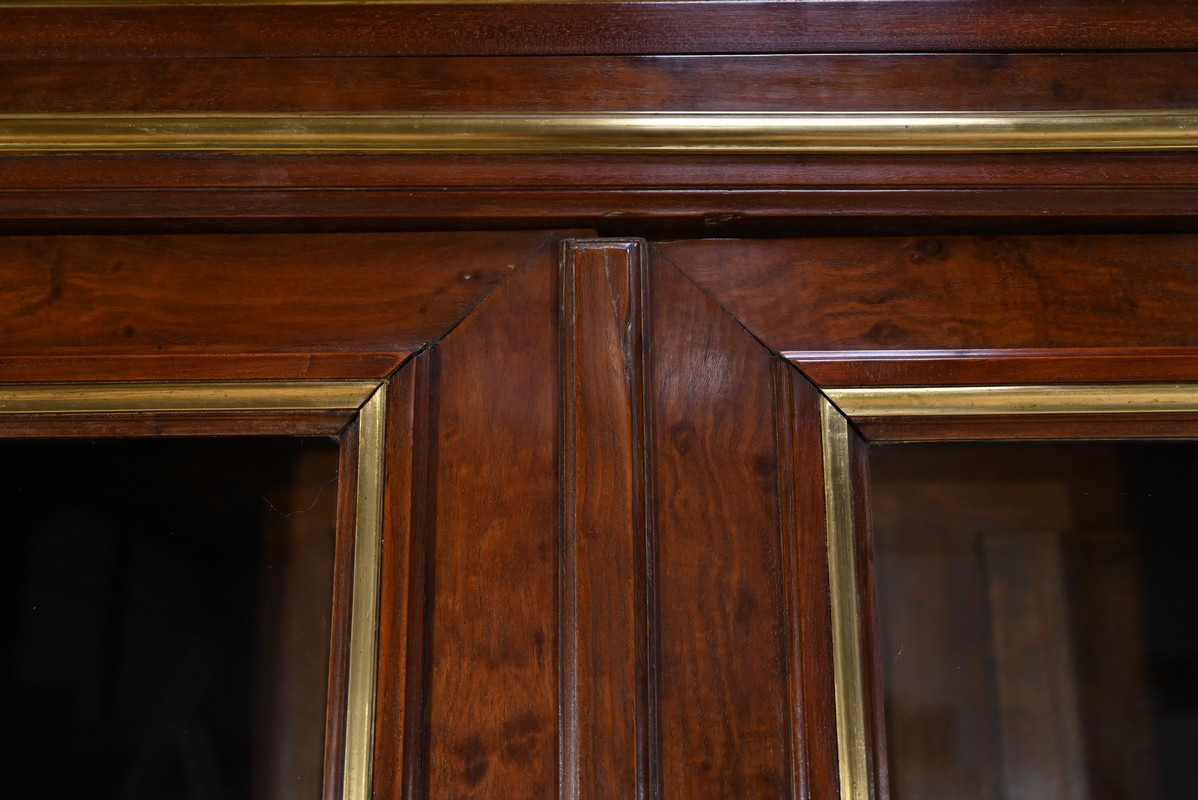Cette grande bibliothèque en acajou massif et plaqué ouvre par deux portes vitrées à cadre à coupe d’onglet en placage d’acajou moiré soulignée de baguettes moulurées à gorges en laiton.