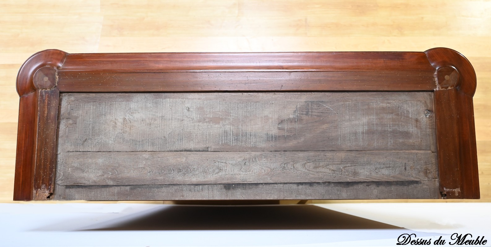 Les côtés, à cadre à coupe d’onglet, sont chacun garnis d’un panneau en acajou moiré.