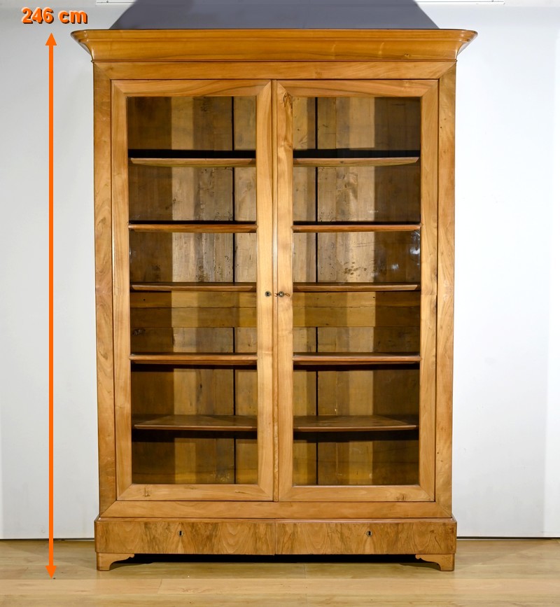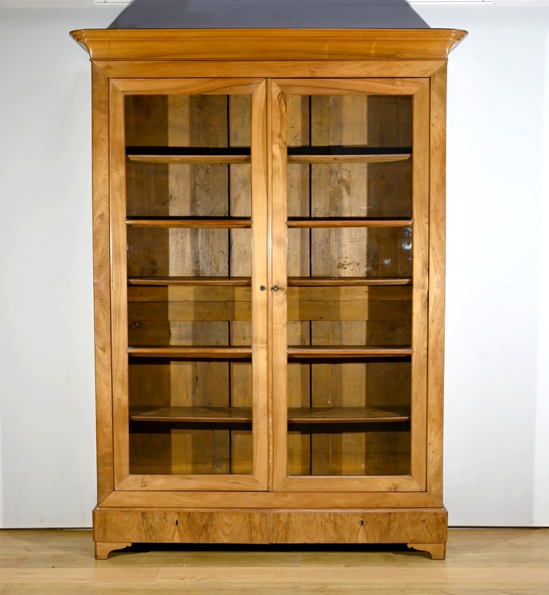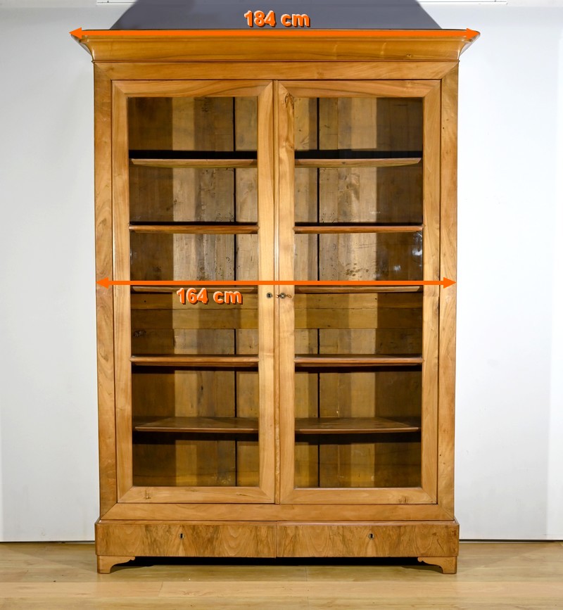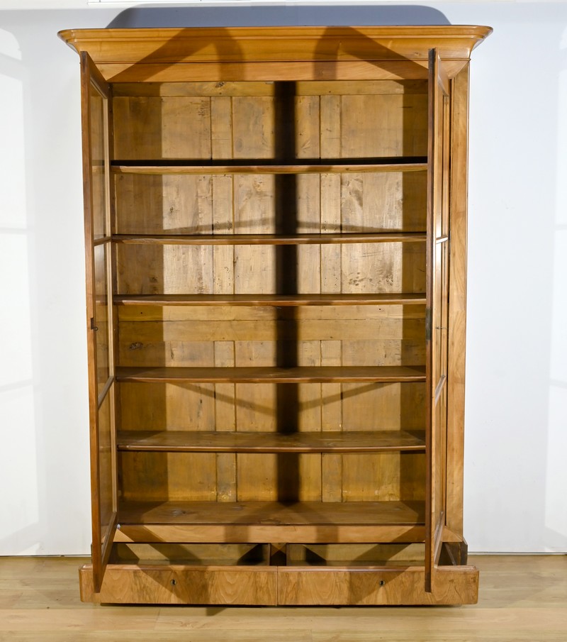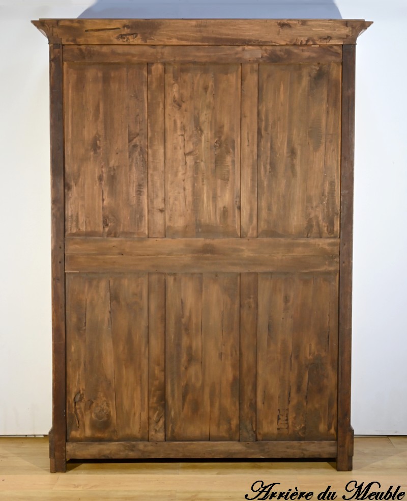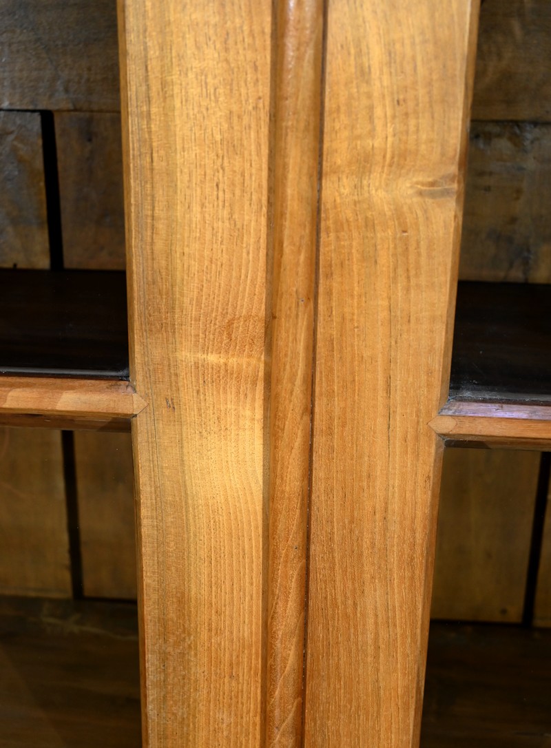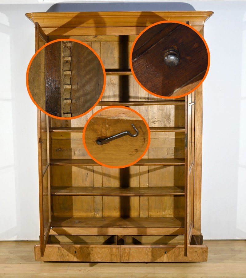 Cette importante bibliothèque en noyer massif ouvre par deux larges portes à encadrement à coupe d’onglet chanfreiné par l’intérieur agrémentées de barreaux horizontaux soit trois vitres en tout.