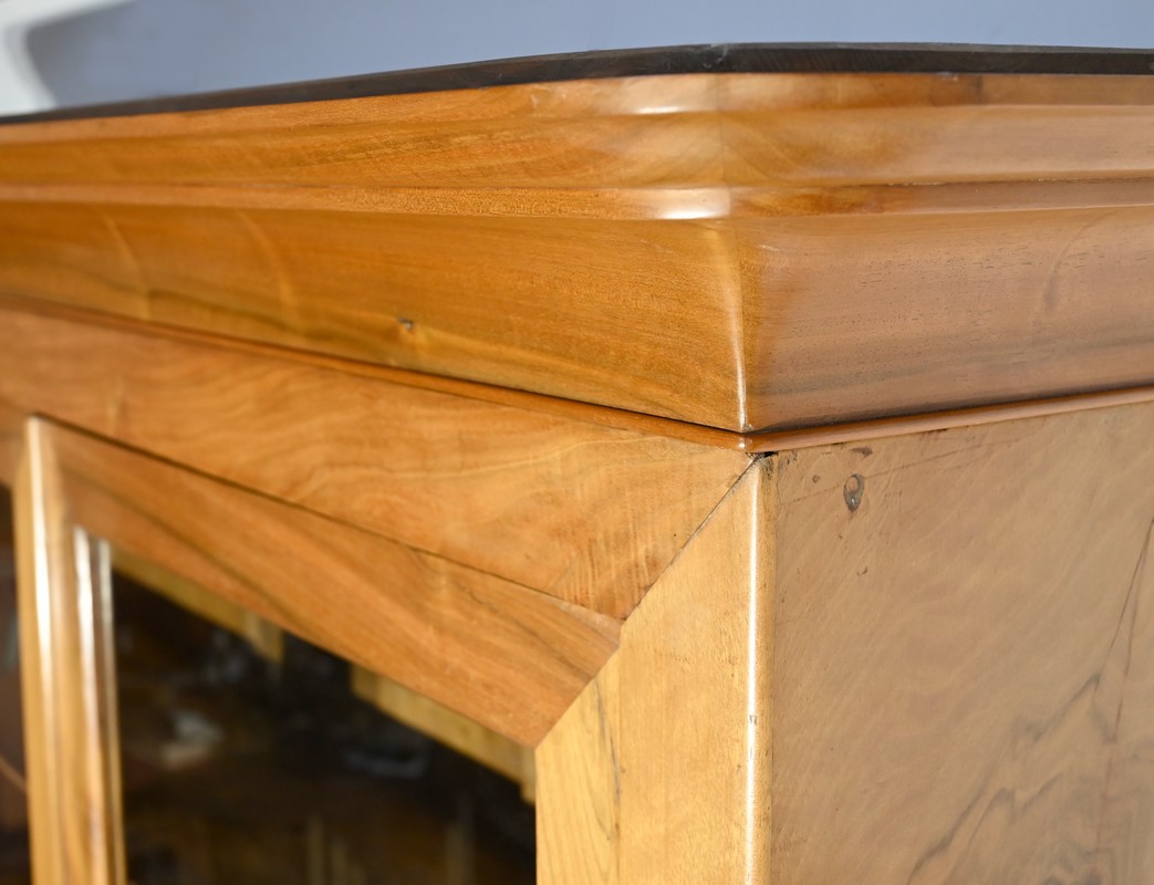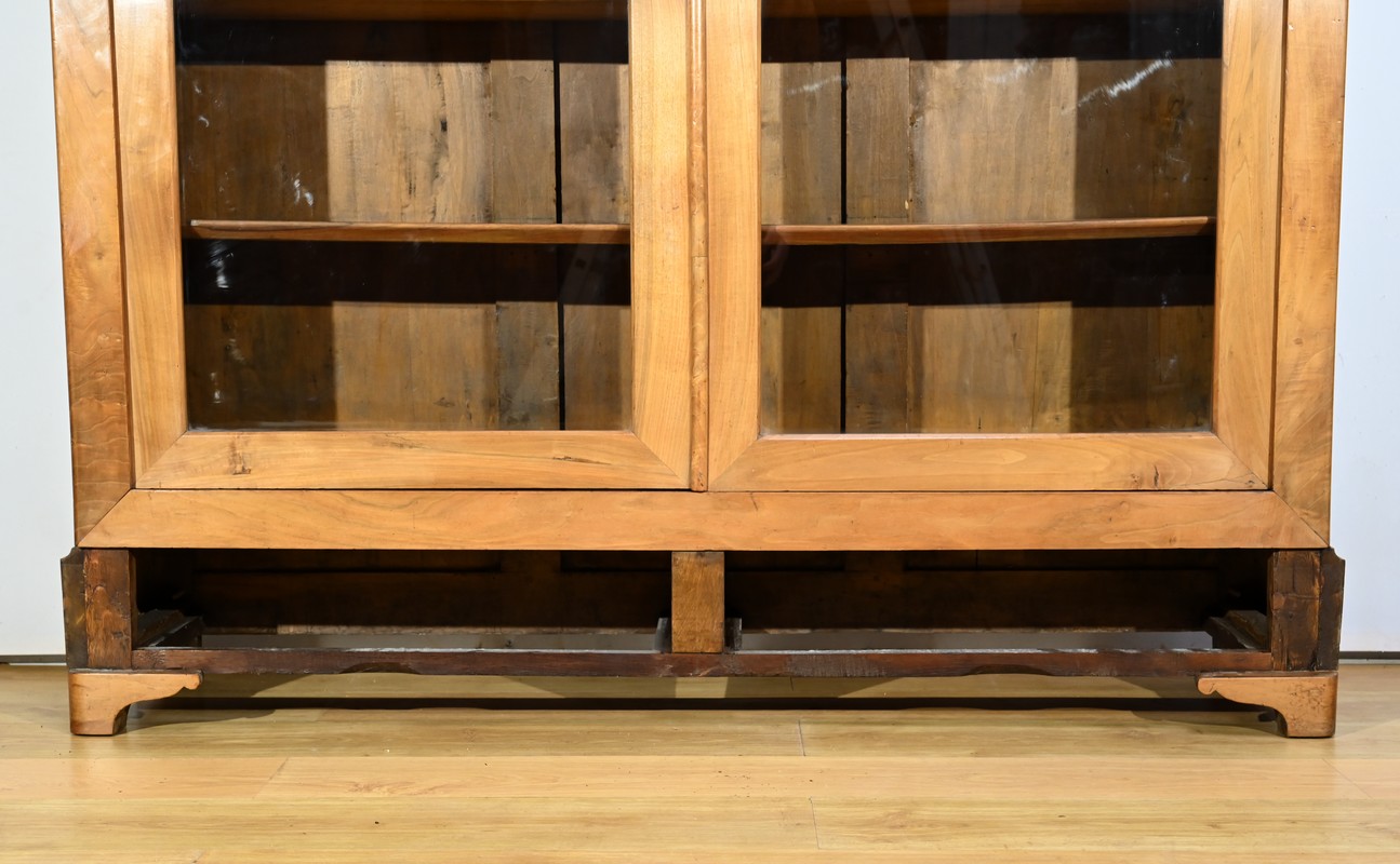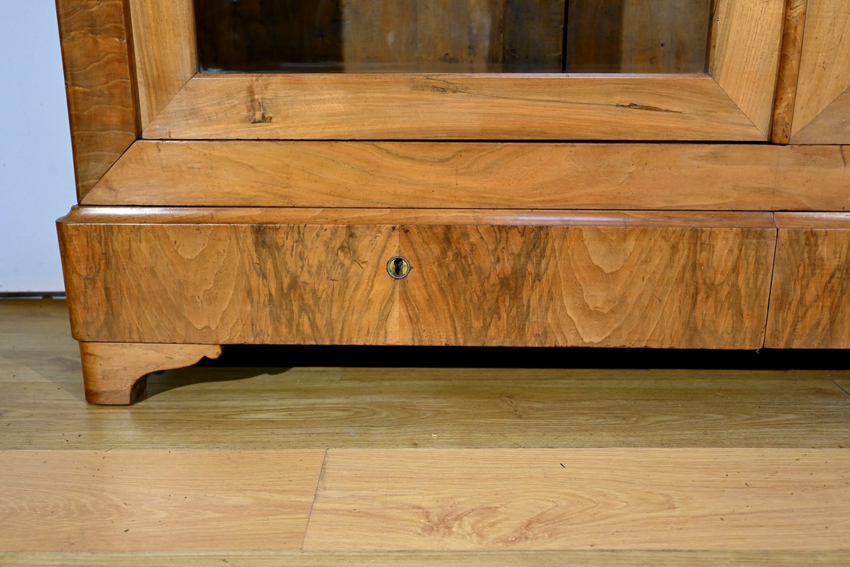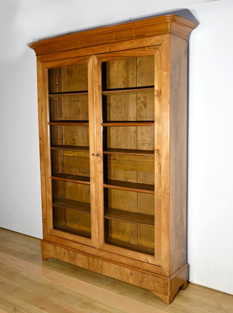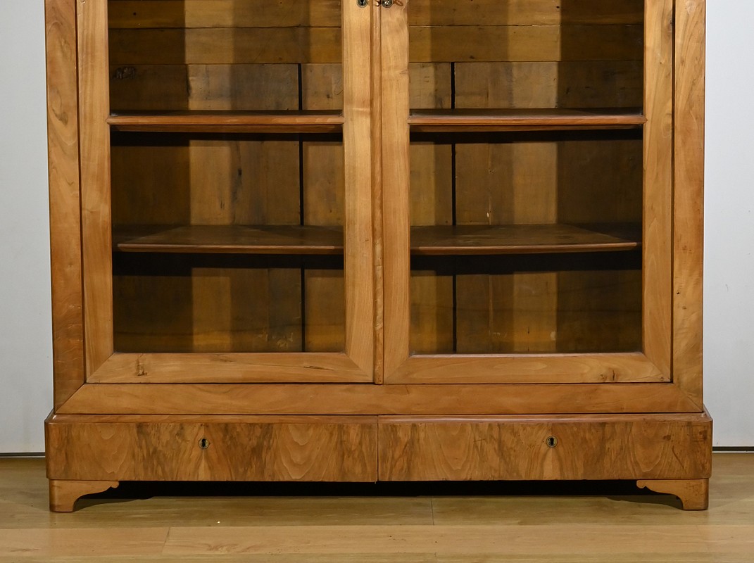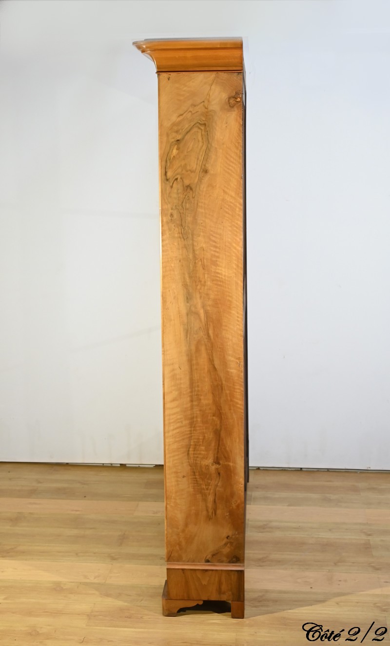 Cette importante bibliothèque en noyer massif ouvre par deux larges portes à encadrement à coupe d’onglet chanfreiné par l’intérieur agrémentées de barreaux horizontaux soit trois vitres en tout.