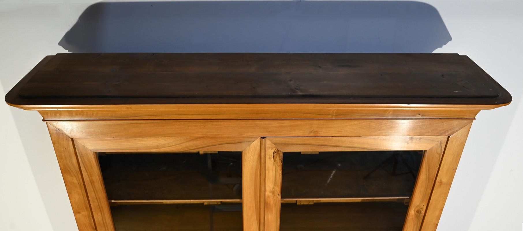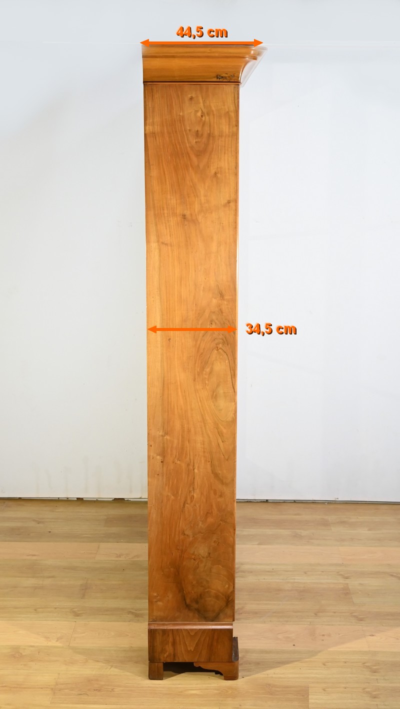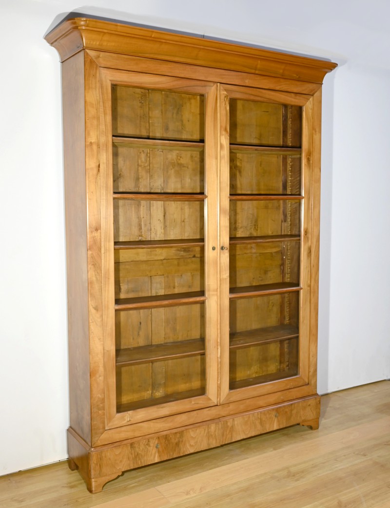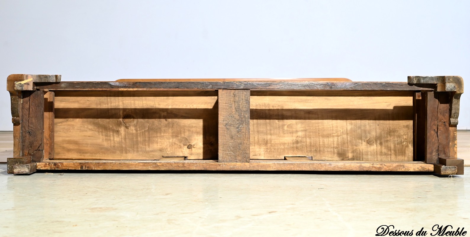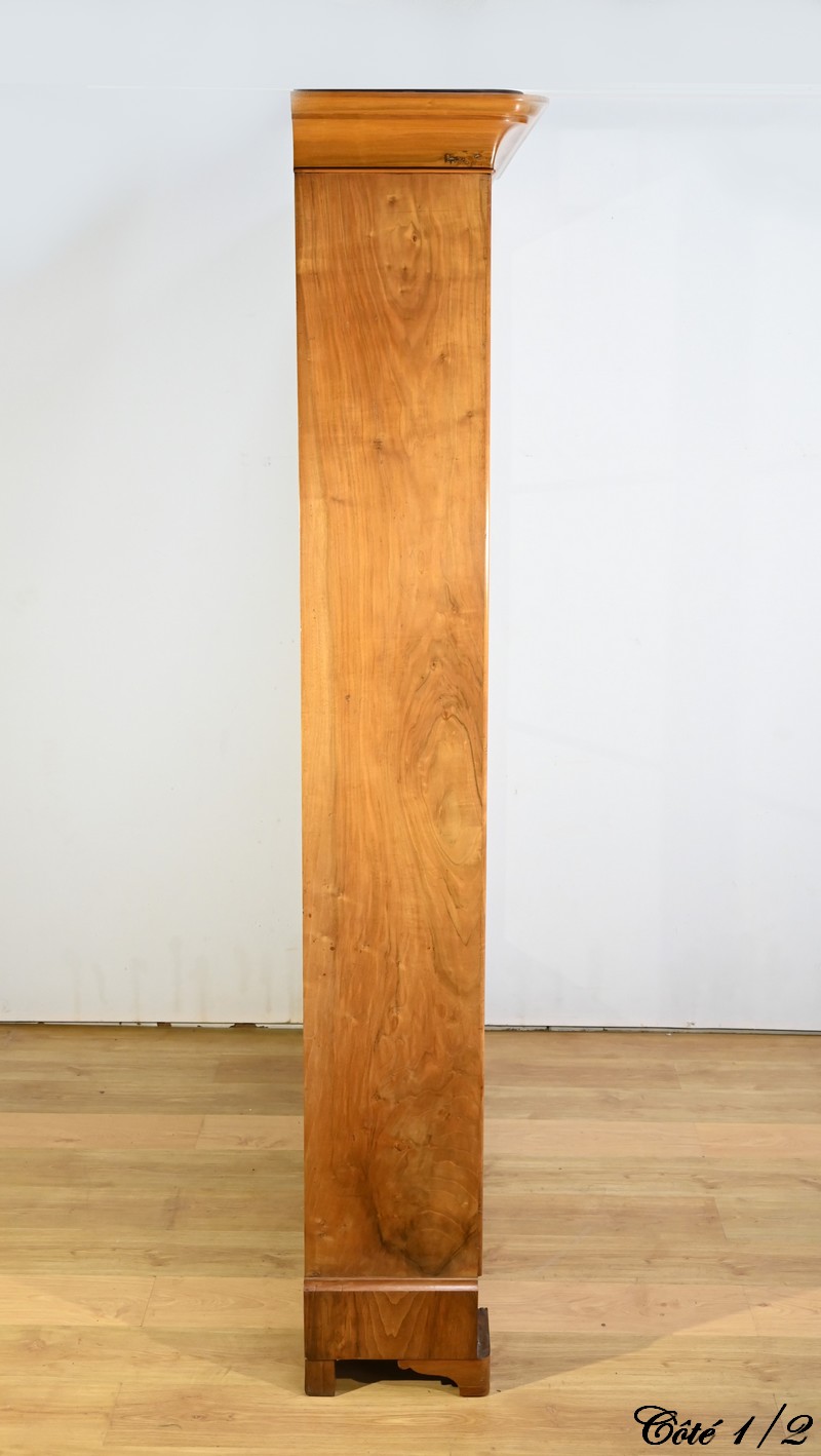 Cette importante bibliothèque en noyer massif ouvre par deux larges portes à encadrement à coupe d’onglet chanfreiné par l’intérieur agrémentées de barreaux horizontaux soit trois vitres en tout.