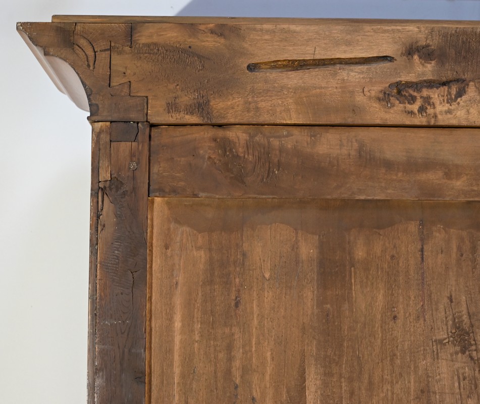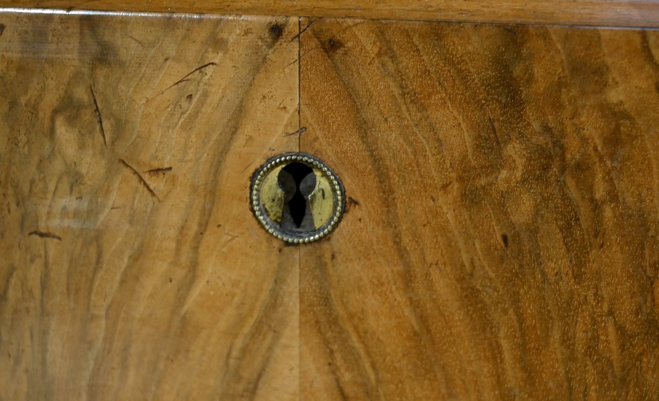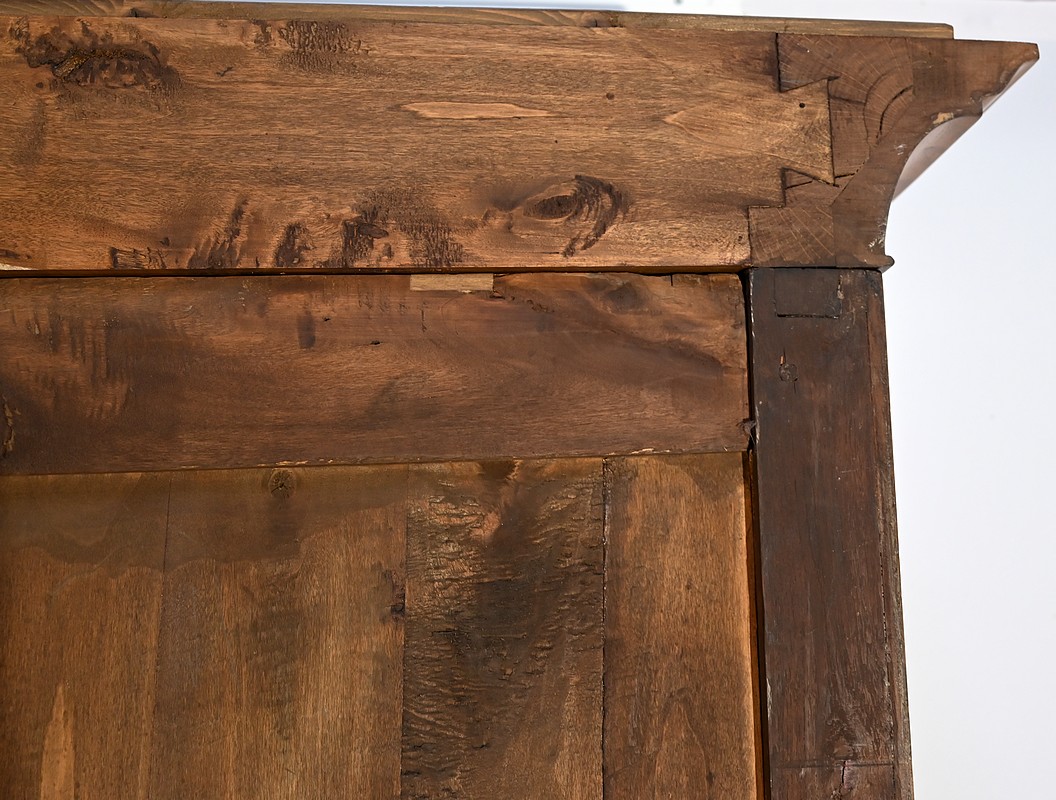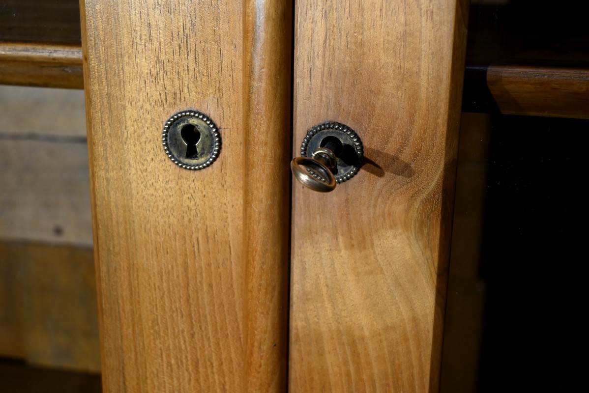 Ces portes sont agrémentées d’un couvre joint en demi-rond, d’une serrure d’origine, de deux entrées ciselées de forme ronde en laiton et d’une clé ajustée.