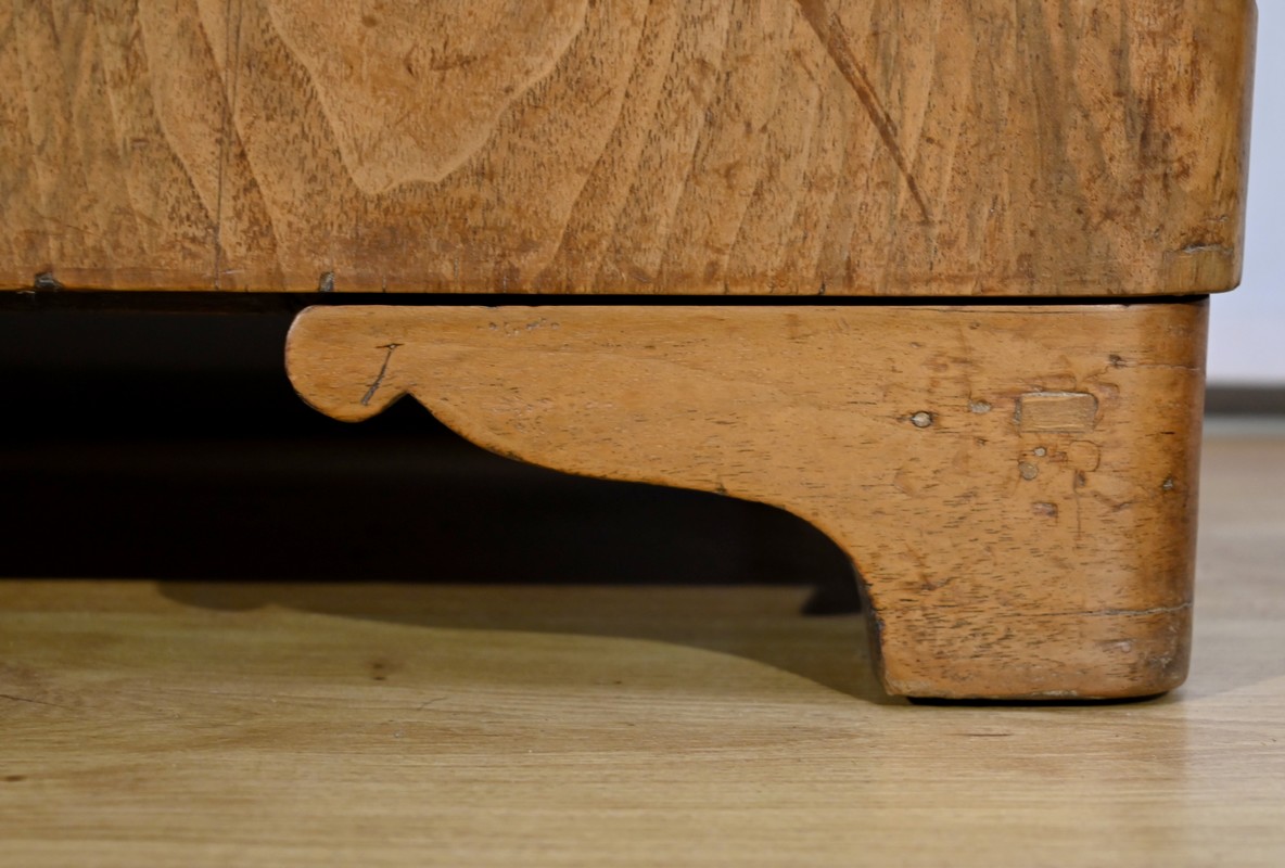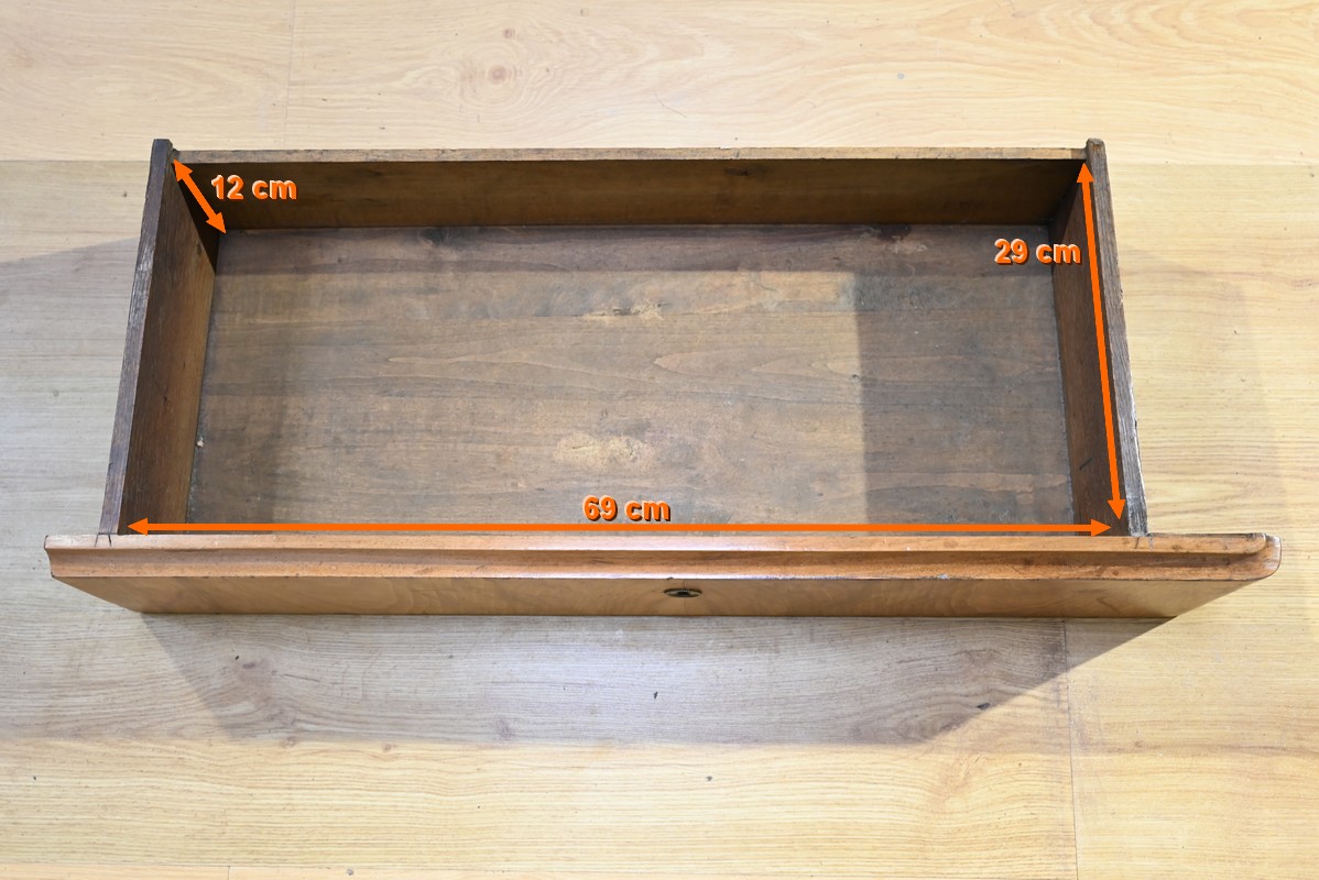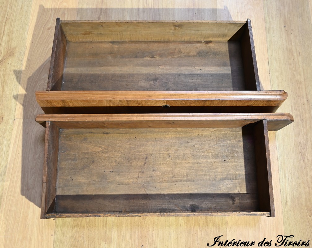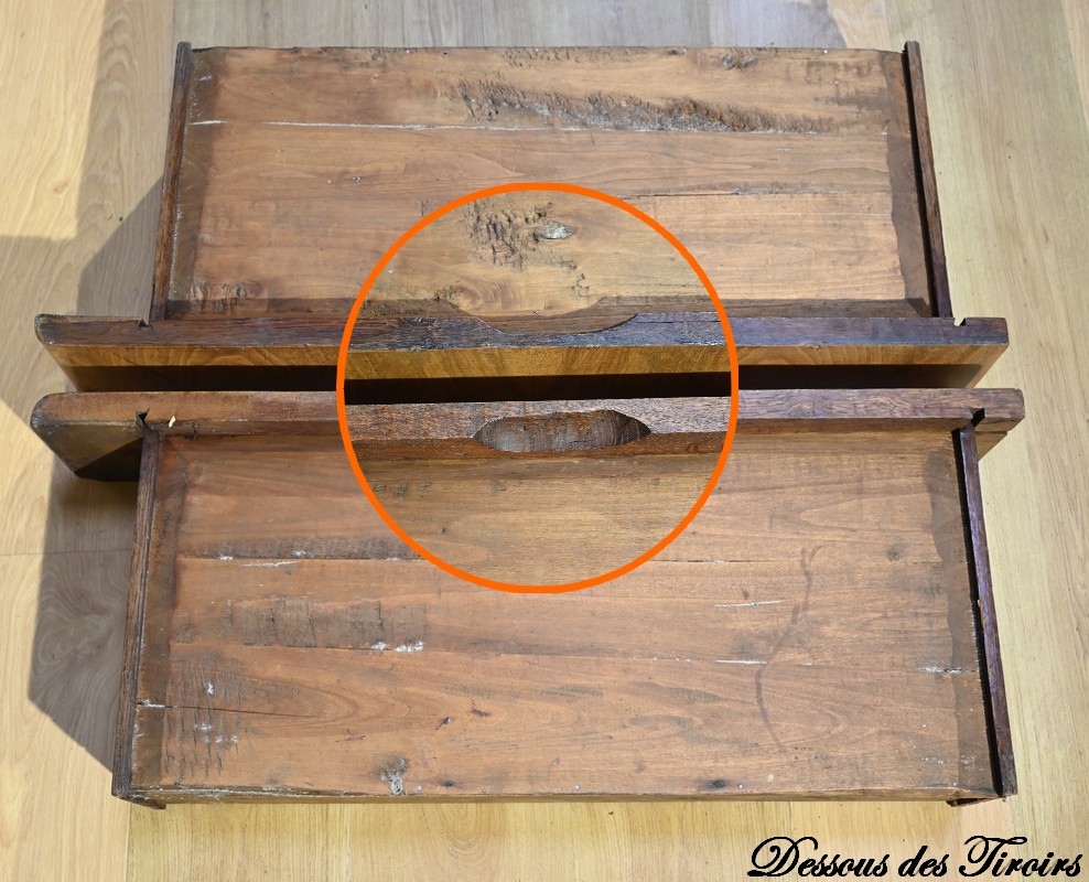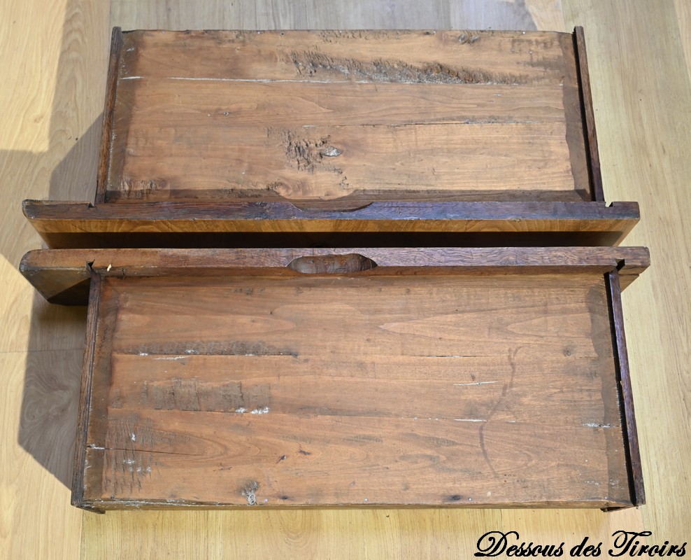 Ce meuble comporte également deux tiroirs en saillie, en placage vertical, à gorge et formant plinthe.