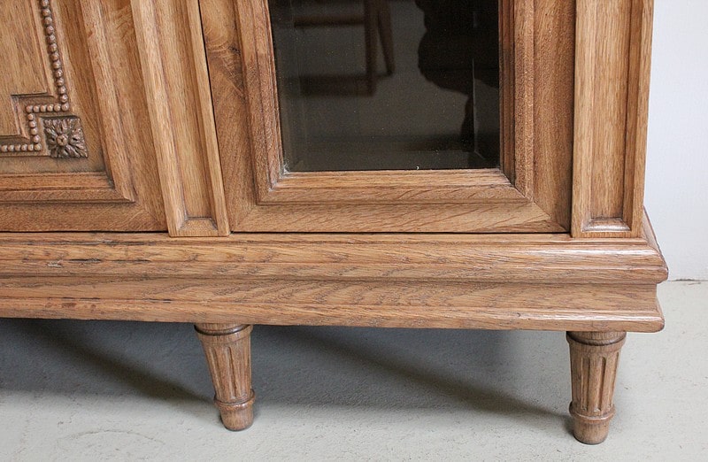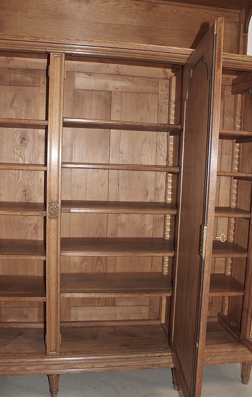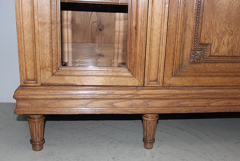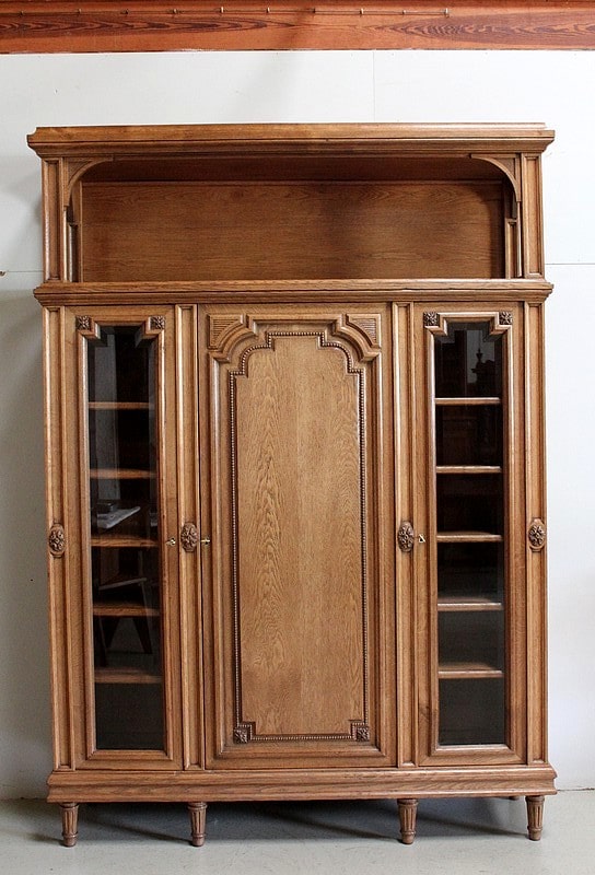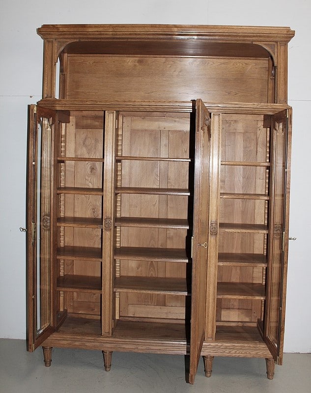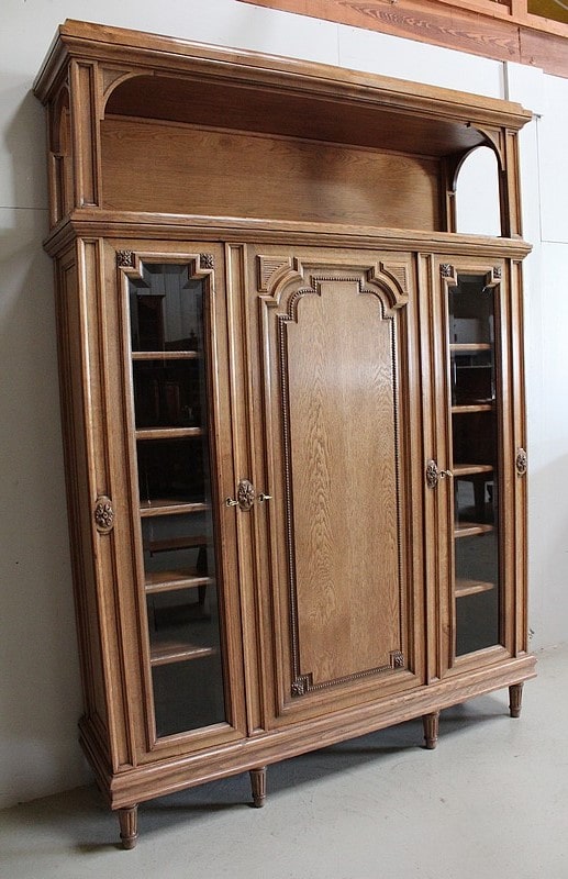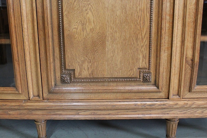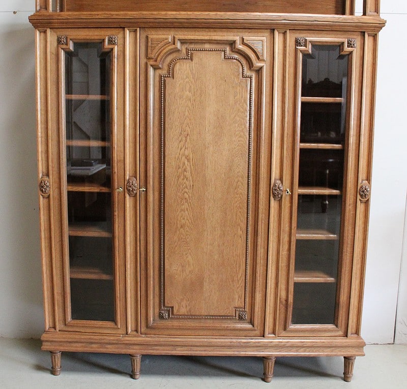 Large bibliothèque ouvrant à 3 portes, les deux latérales vitrées, en chêne blond, de style Louis XVI, époque 1920.