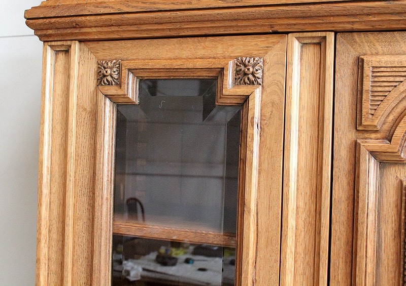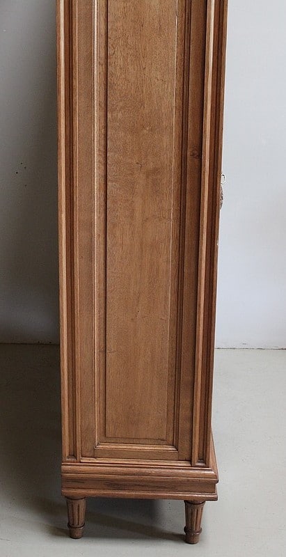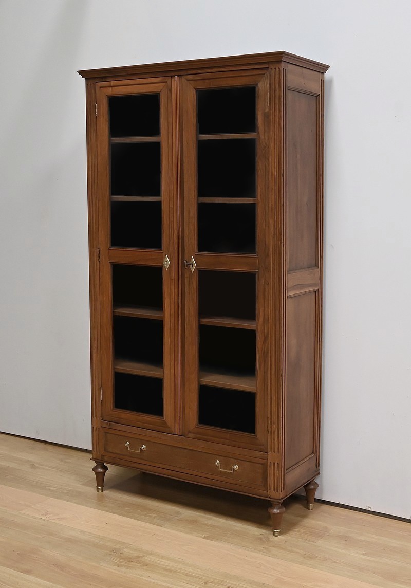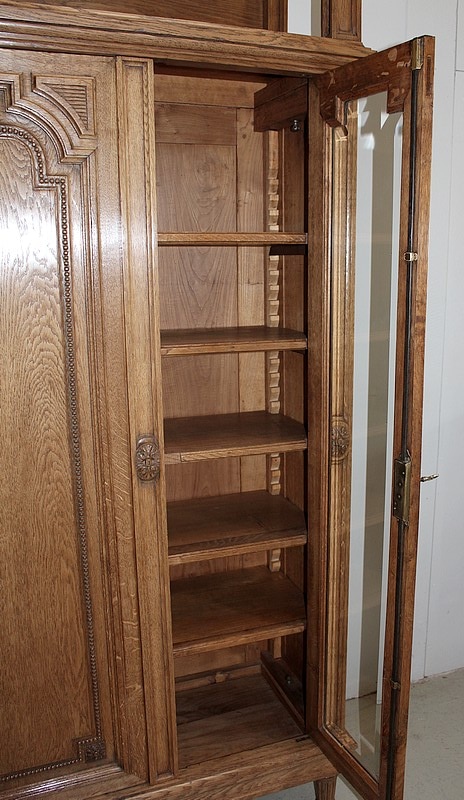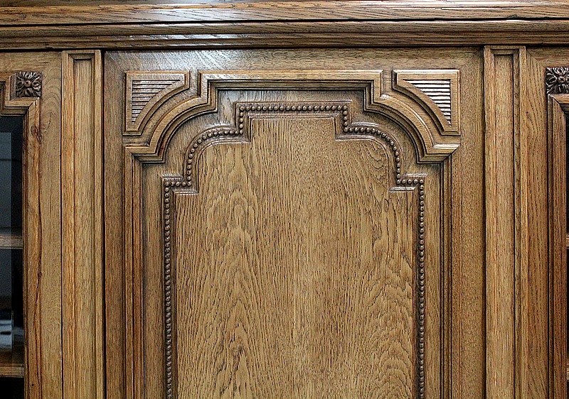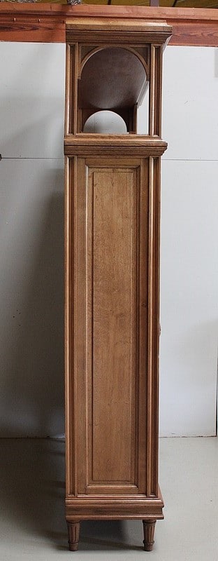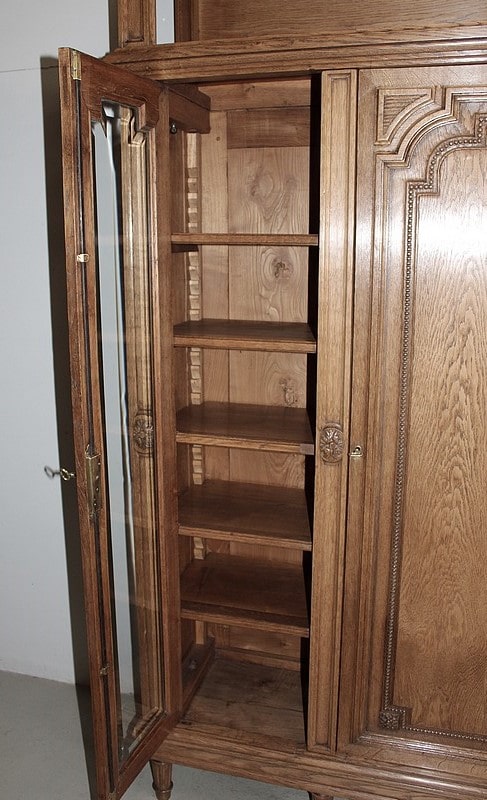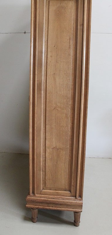 Large bibliothèque ouvrant à 3 portes, les deux latérales vitrées, en chêne blond, de style Louis XVI, époque 1920.