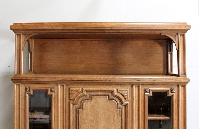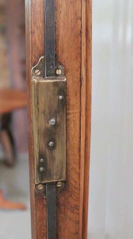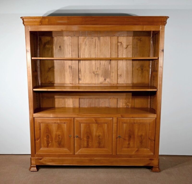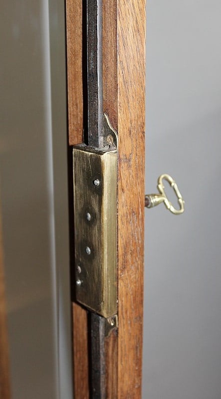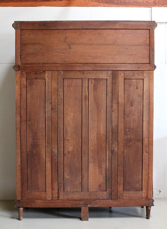 Les portes sont à découpes ‘grecques’ avec décor de macarons. Celle du centre, pleine, est moulurée avec décor perlé. Elles ferment grâce à des serrures 3 points en parfait état de fonctionnement.