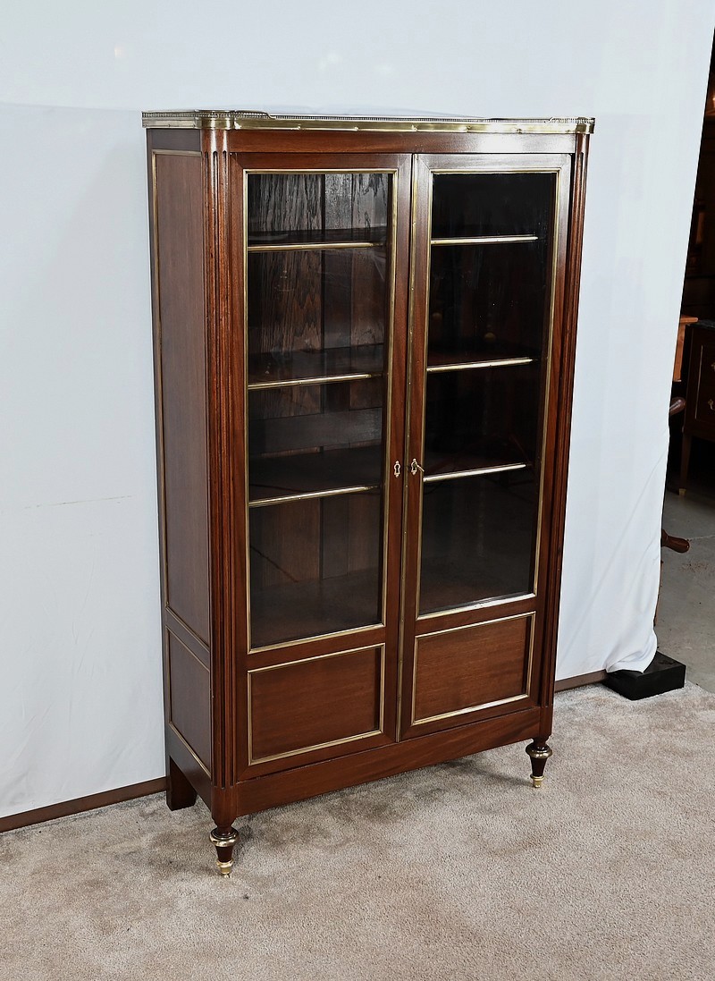 Bibliothèque en acajou de style Louis XVI, garnie de laiton et sommé d’un marbre de Carrare.