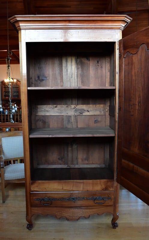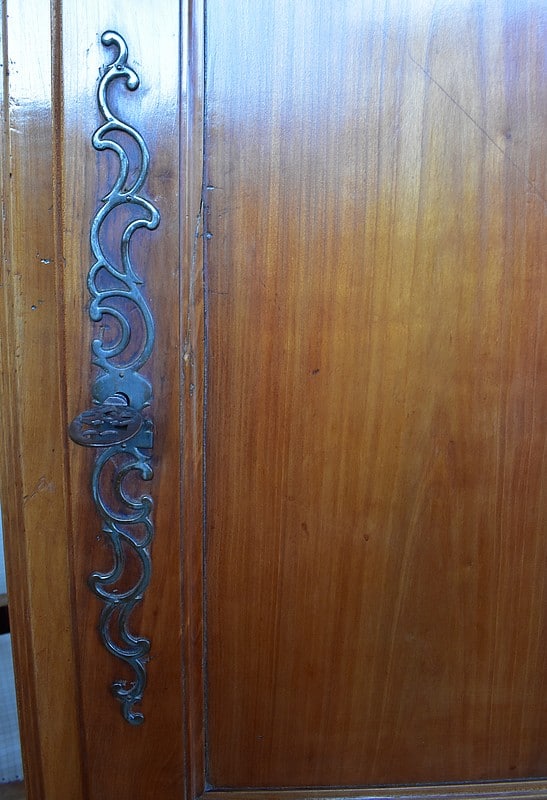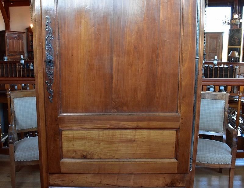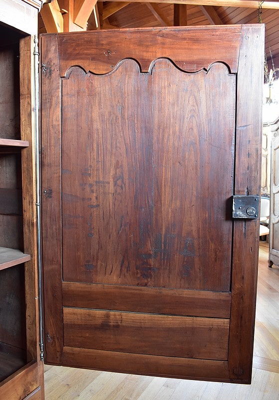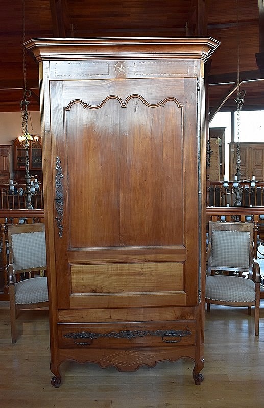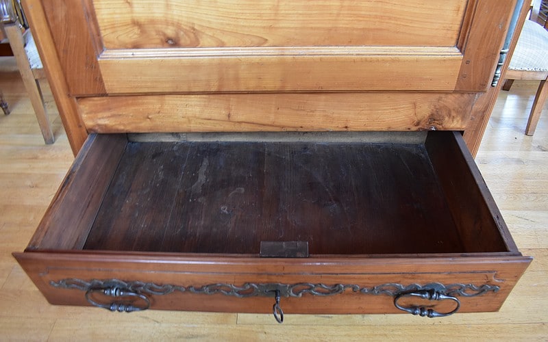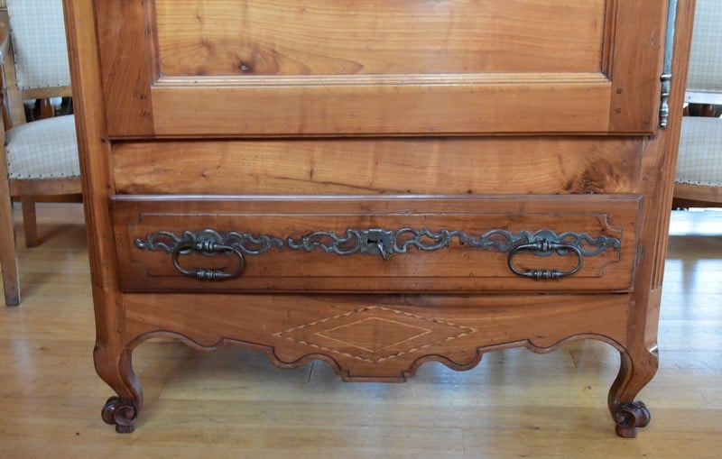 Bonnetière charentaise de style Louis XV en merisier ouvrant par une porte à découpes et un tiroir en partie basse garnis de longues entrées de serrures en fer découpé et grande fiche de fer.