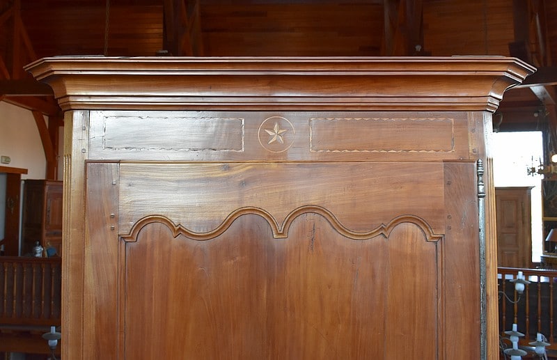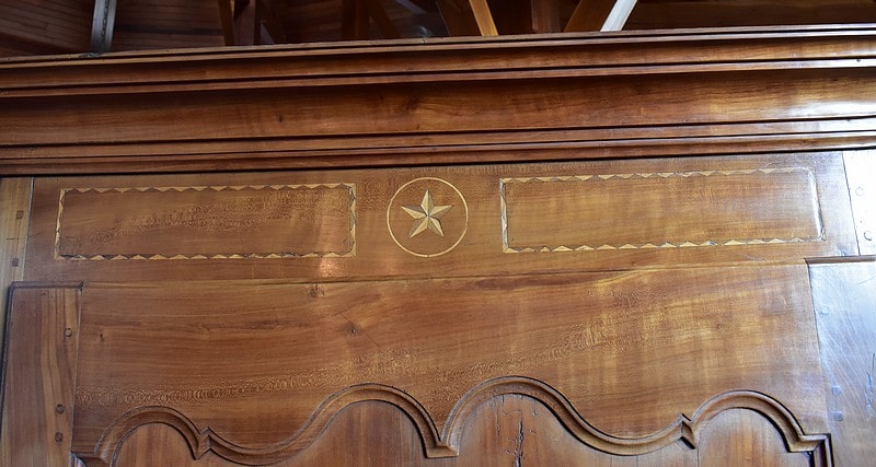 Sa traverse haute est ornée d’une fine marqueterie en bois clairs avec rose des vents en son milieu , la traverse basse, chantournée, est également ornée d’une fine marqueterie en forme de losange.