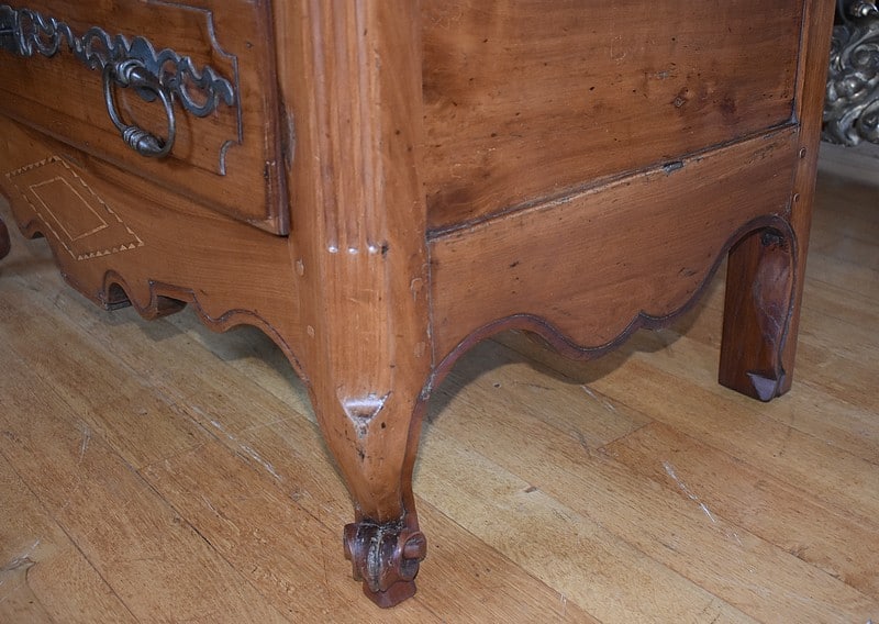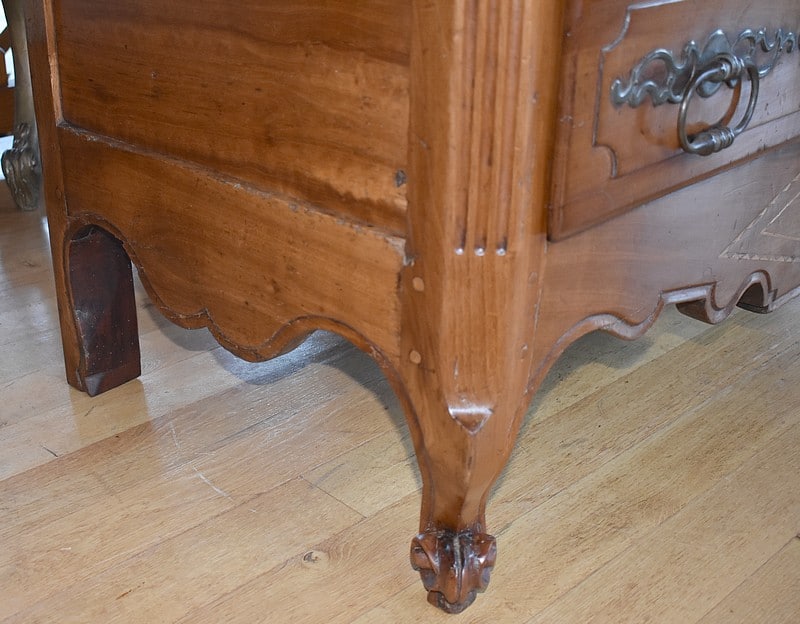 Corniche et montants à pans coupés – et cannelés pour les montants – reposant sur deux pieds avants galbés à enroulement et deux pieds arrières au léger galbe.