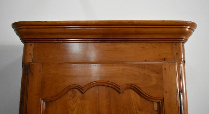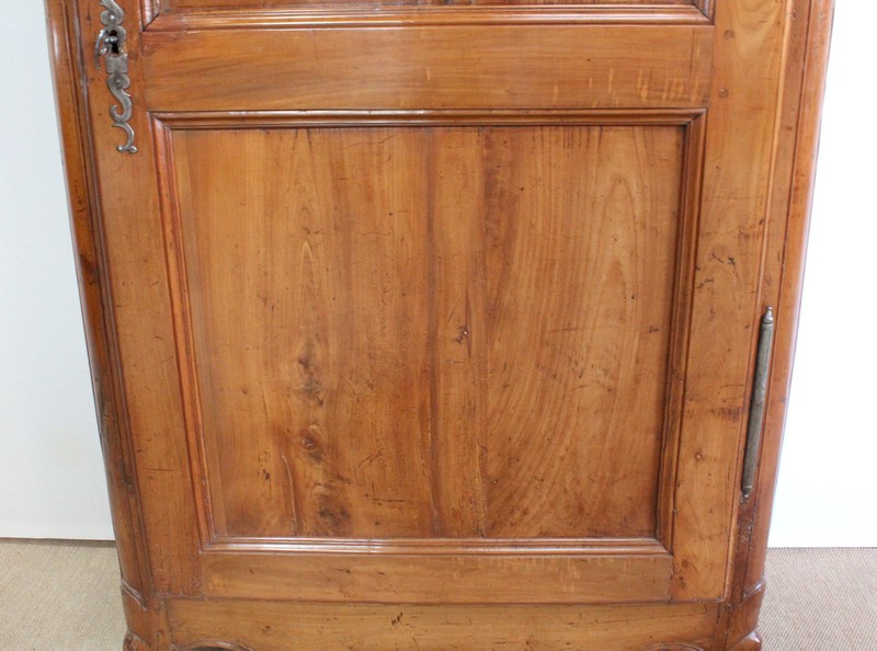 Elle ouvre par une porte à deux panneaux asymétriques munie de gonds de fer en applique, ainsi que d’une serrure et d’une entrée d’origine de même alliage, accompagnée de sa clé. La traverse haute de cet ouvrant est légèrement découpée et moulurée par l’intérieur.