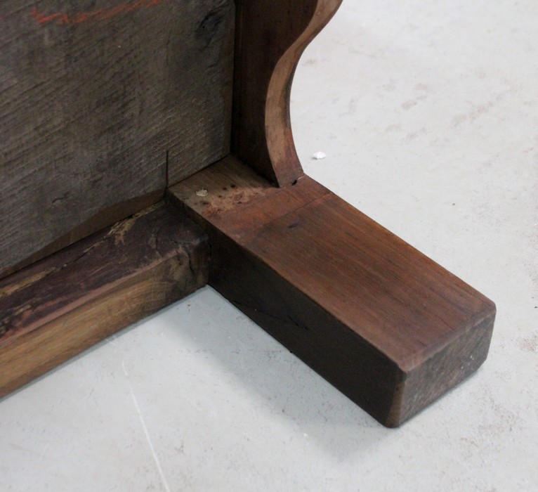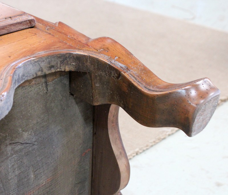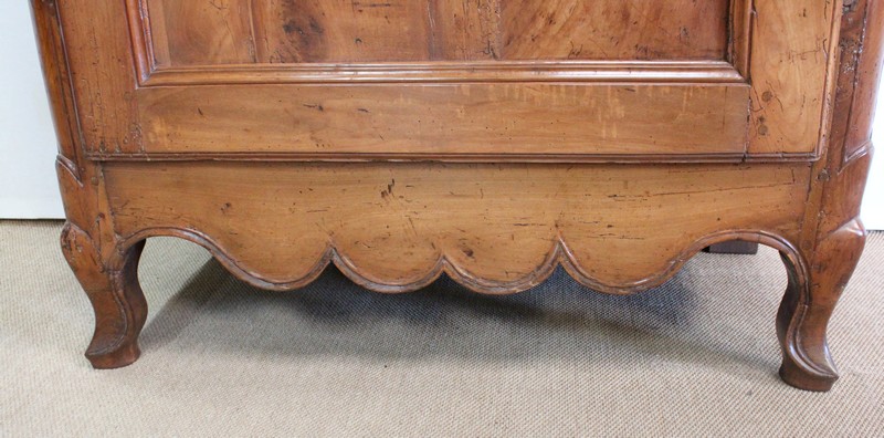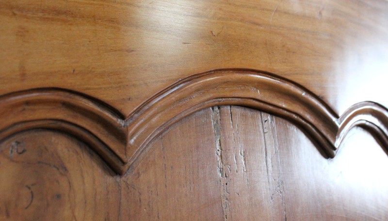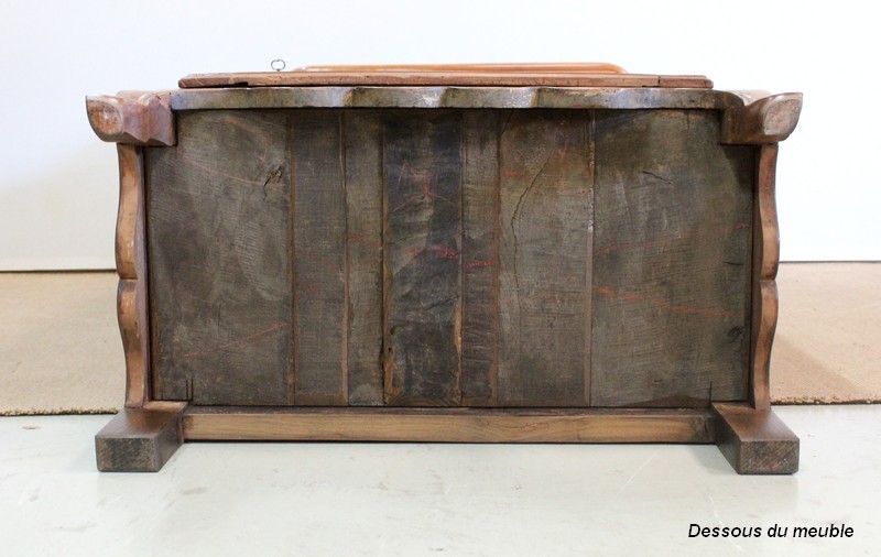 De chaque côté, deux pieds en demi-rond fuyant à défoncement permettent d’adoucir le volume de ce bien : ceux-ci se terminent en pied bosse biche à la courbure élégante, et encadrent une traverse basse à découpe et à moulure.