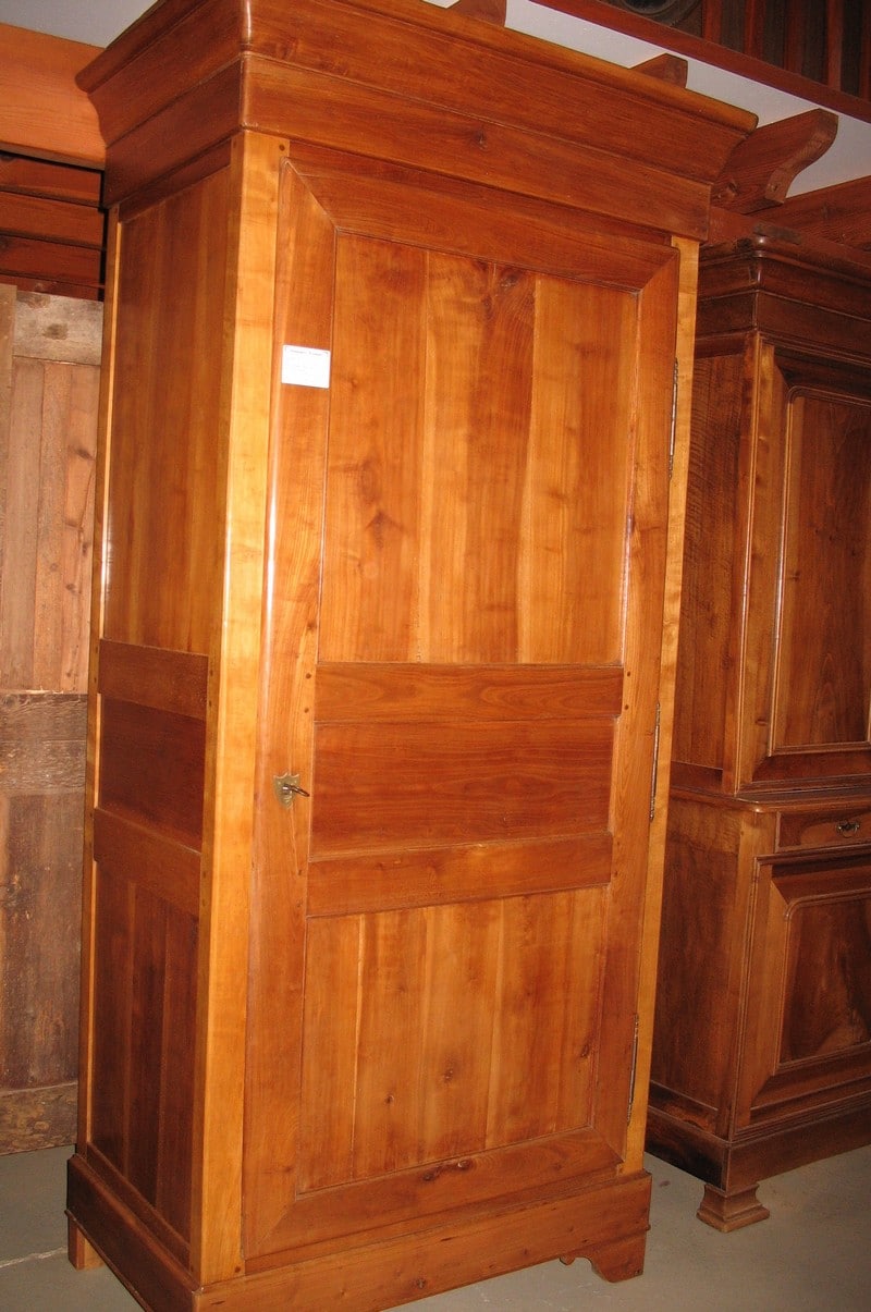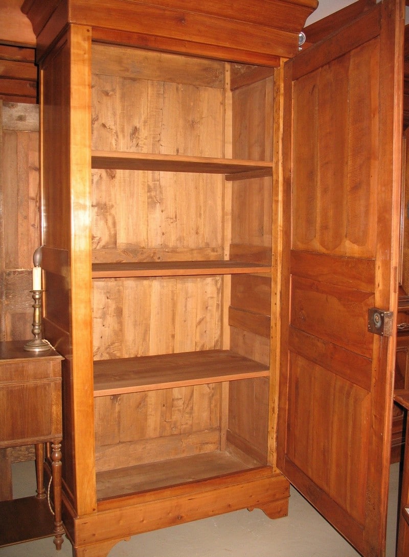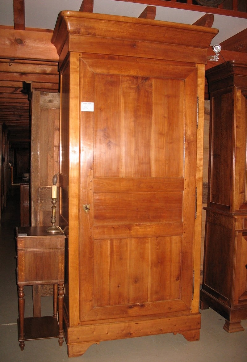 Grande Bonnetière Louis-Philippe en merisier ouvrant par 1 porte à 3 panneaux. L’intérieur est garni de 3 étagères. Possibilité d’aménagement différent. Seconde moitié du XIXe.