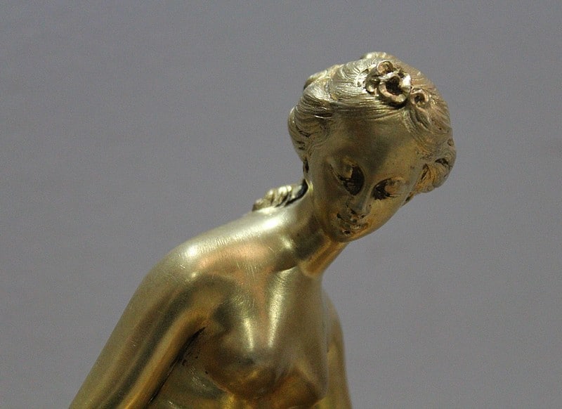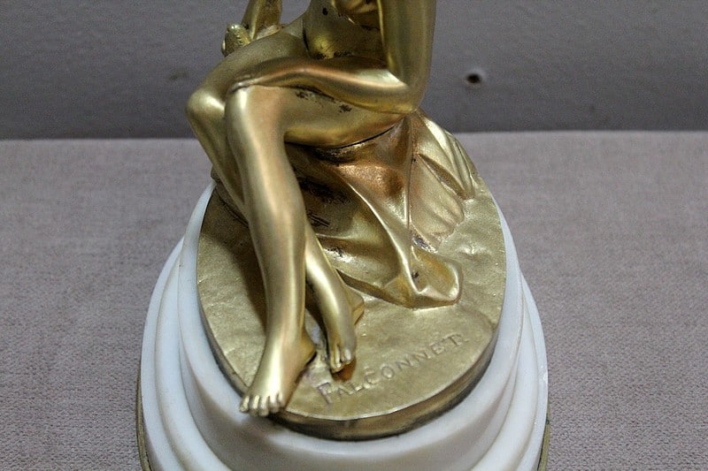 Sujet en bronze doré et patiné d’après Étienne Maurice Falconnet, représentant une baigneuse assise sur un linge et tenant près d’elle une colombe.
