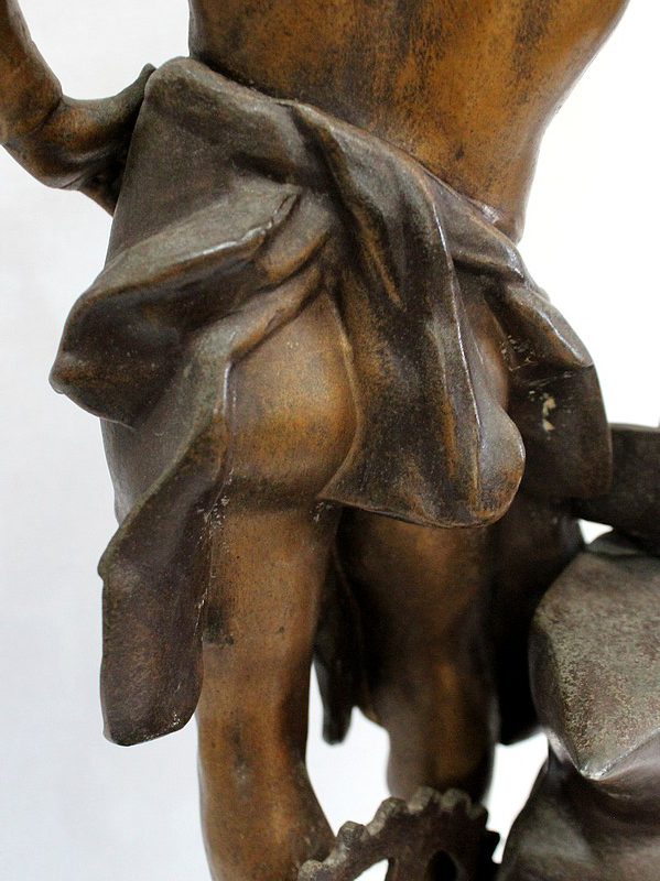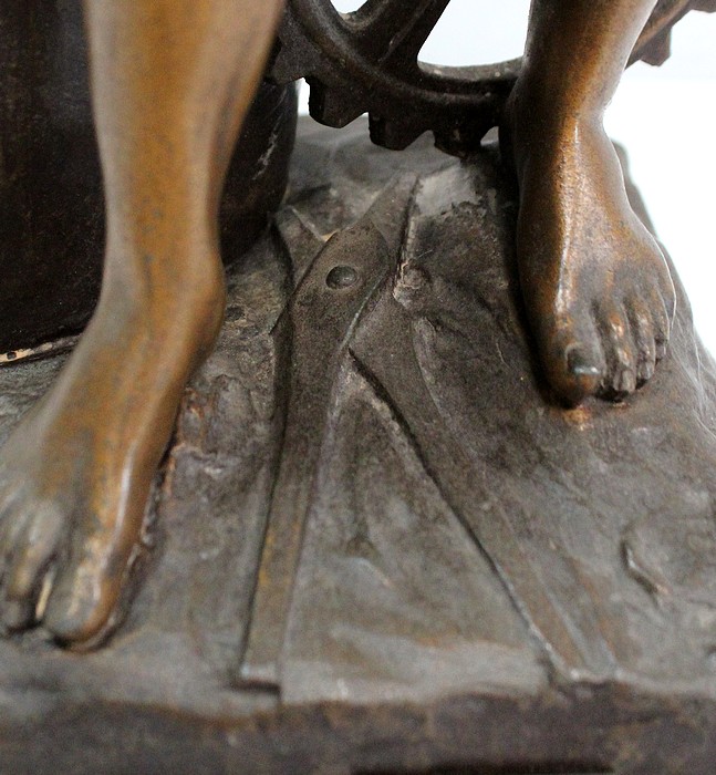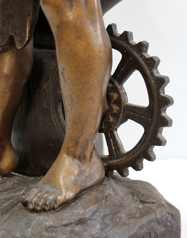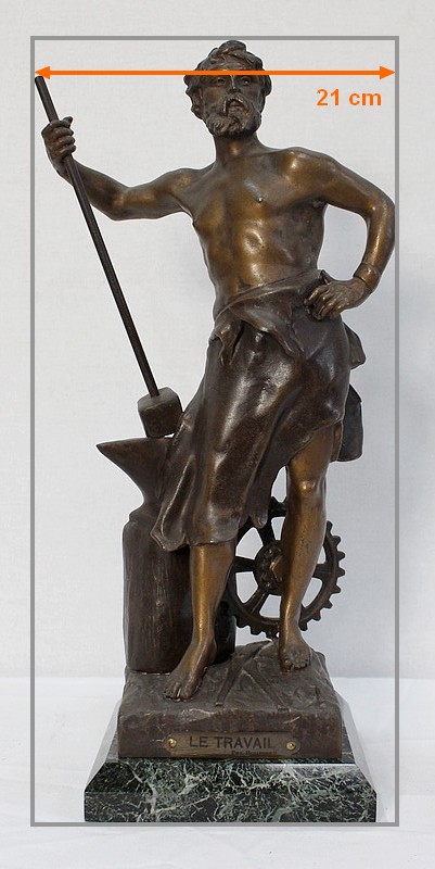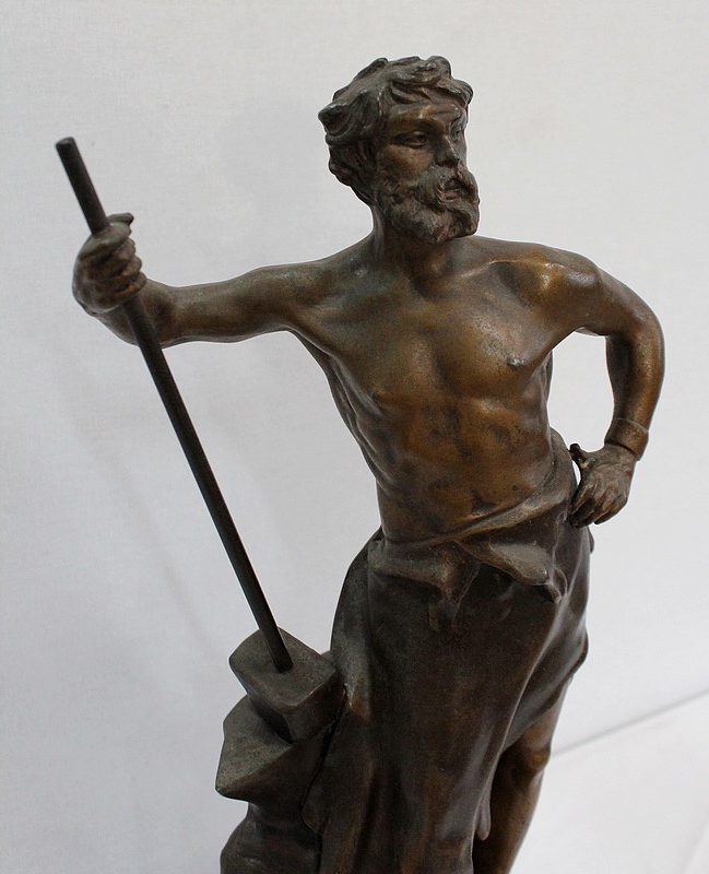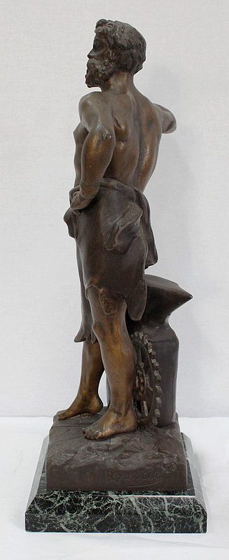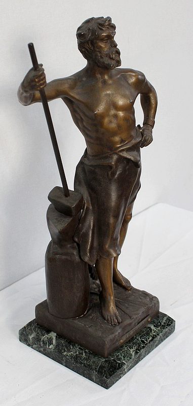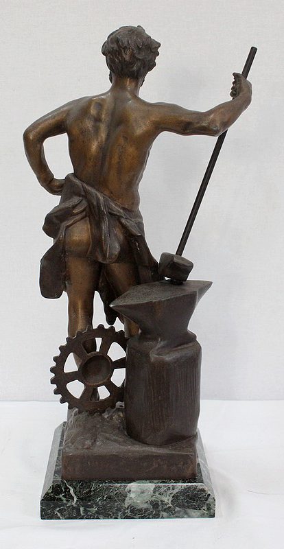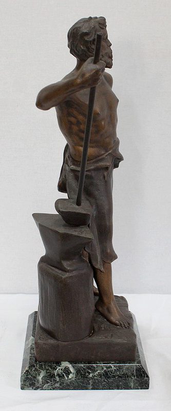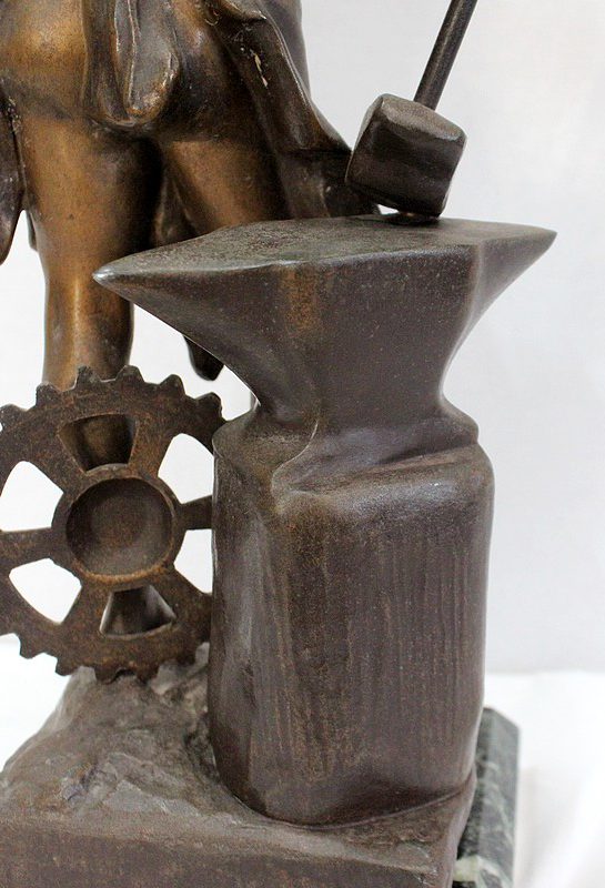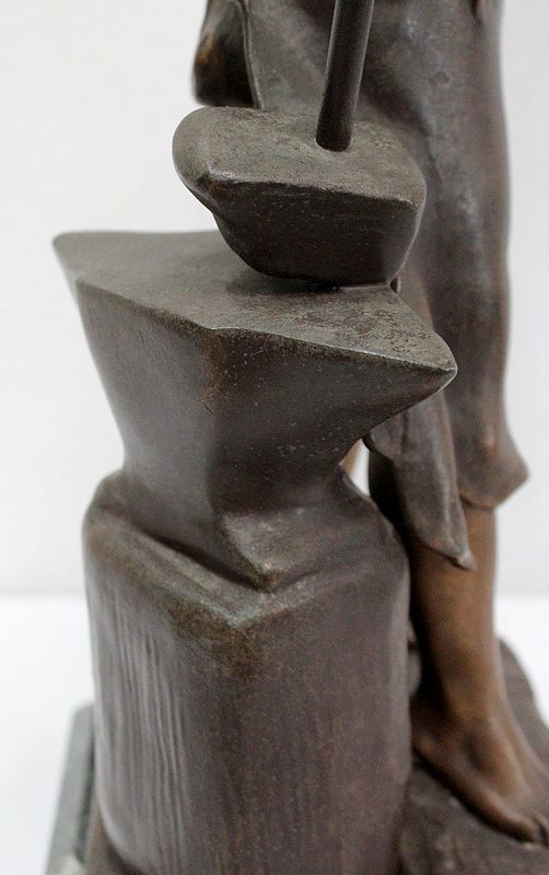 Cette sculpture représente un forgeron, au regard assuré, et à la chevelure et à la barbe importantes. Il est vêtu légèrement, d’un pagne épais noué dans son dos, laissant deviner un corps manifestement musclé, mis en valeur par une patine dorée. La main gauche de l’homme est appuyée sur sa hanche, celle de droite tient le manche d’un imposant marteau, lui-même reposant sur une enclume. Dernière les jambes de l’artisan on distingue une roue à crans, et à ses pieds une tenaille.