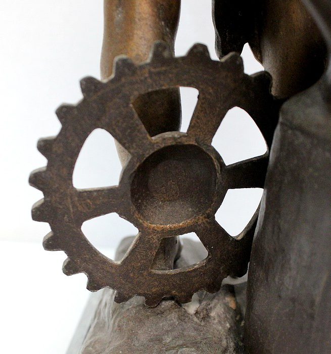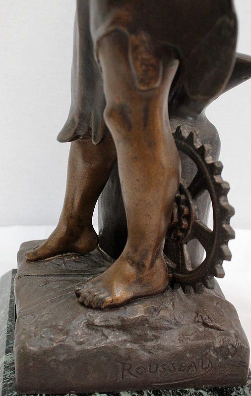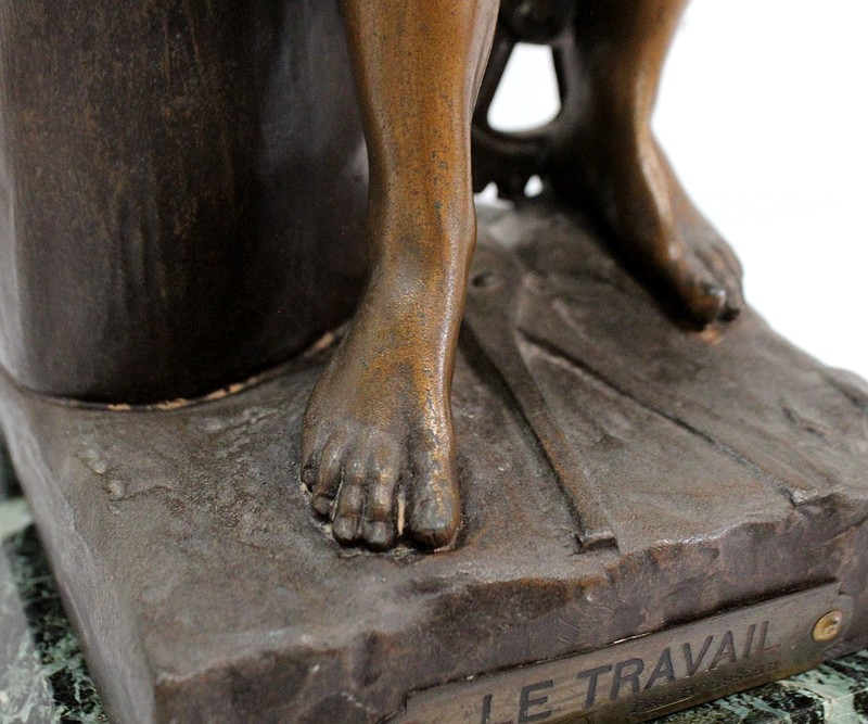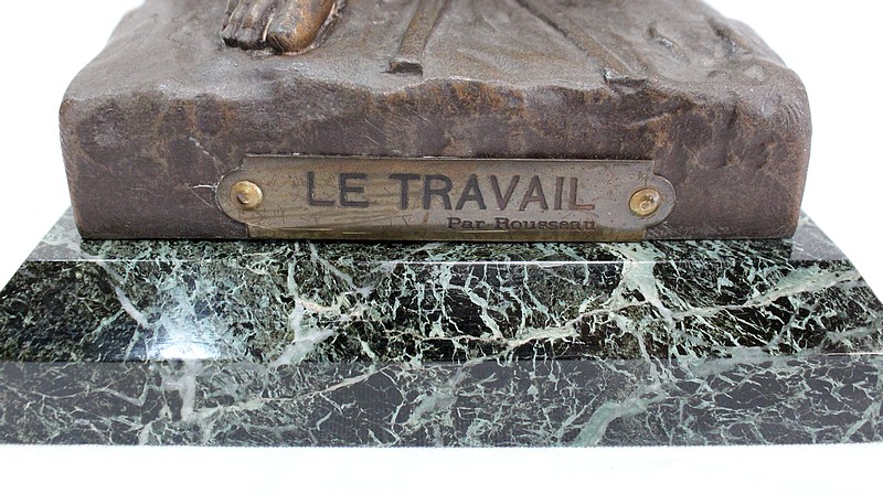 Bronze intitulé « Le travail », signé à deux endroits par le sculpteur Victor Rousseau (1865 – 1954). D’origine Belge, il taille des pierres dès son plus jeune âge puis participe à l’édification du colossal palais de justice de Bruxelles. A travers ses différents voyages, Rousseau s’inspire de l’art nouveau en France, grec en Angleterre, et du style renaissance en Italie.