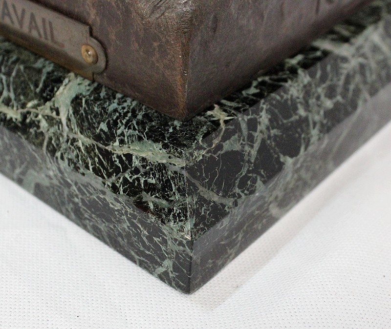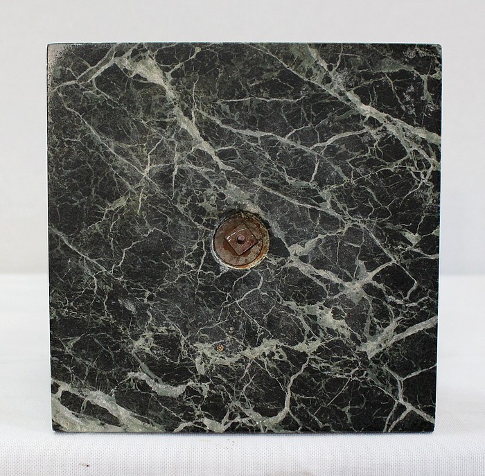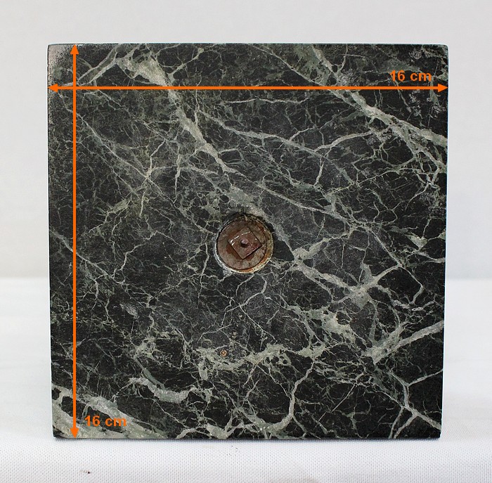 L’ensemble repose sur un socle carré en marbre vert de mer taillé à chanfreins.