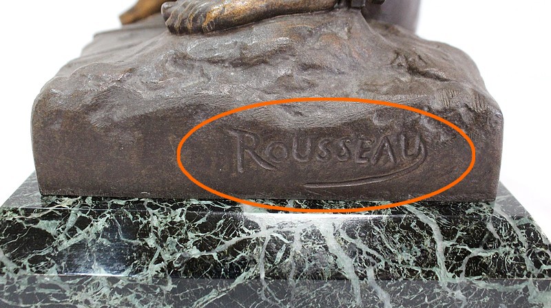 Une plaque portant le nom de l’œuvre et de son auteur est apposée sur la terrasse de ce bronze, et la signature de Rousseau est également présente sur l’un des côtés.