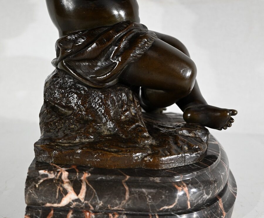 Assis sur un rocher surmonté d’une fourrure de renard, le chérubin croise ses jambes potelées. La tête penchée, l’enfant semble concentré. Lèvres entrouvertes, il reprend son souffle. Son visage harmonieux et joufflu est entouré de petites bouclettes délicates.