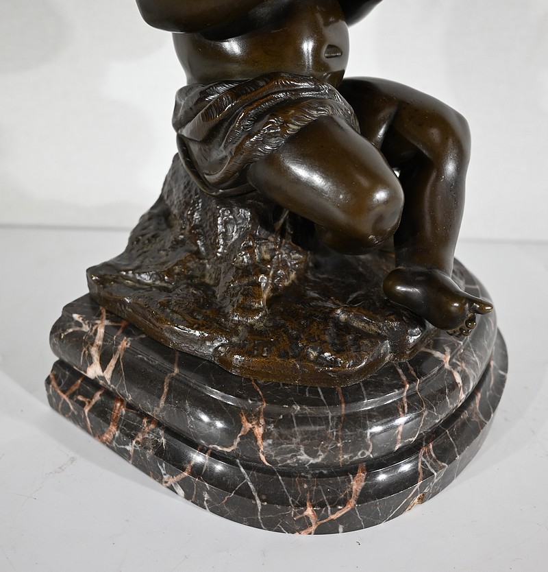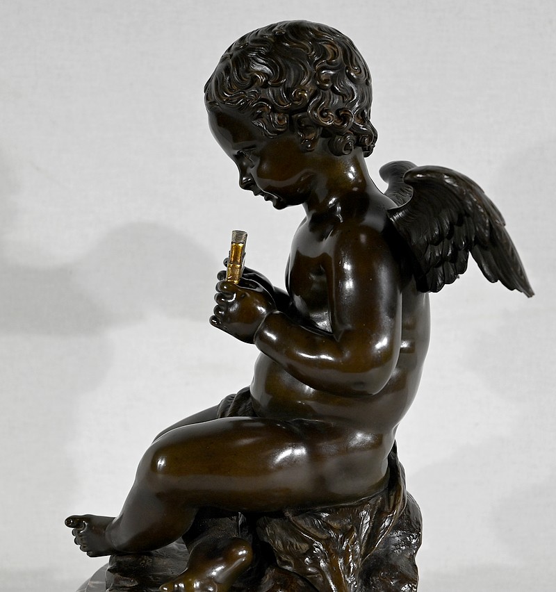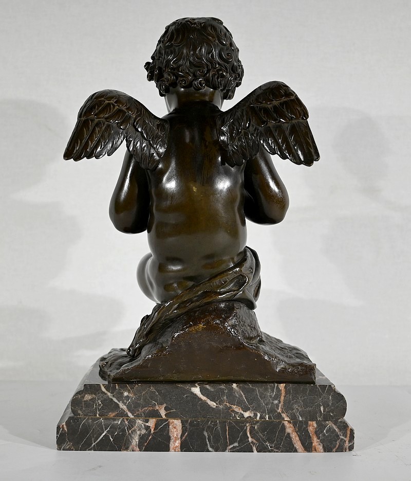 Charmant bronze à patine noire et mordorée, dans le goût XVIIIe, figurant un ange tenant une flûte de pan dorée entre ses mains.