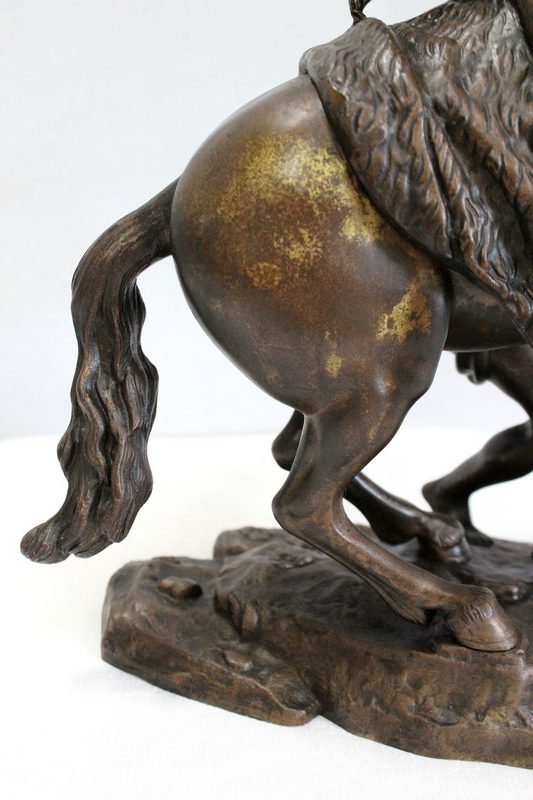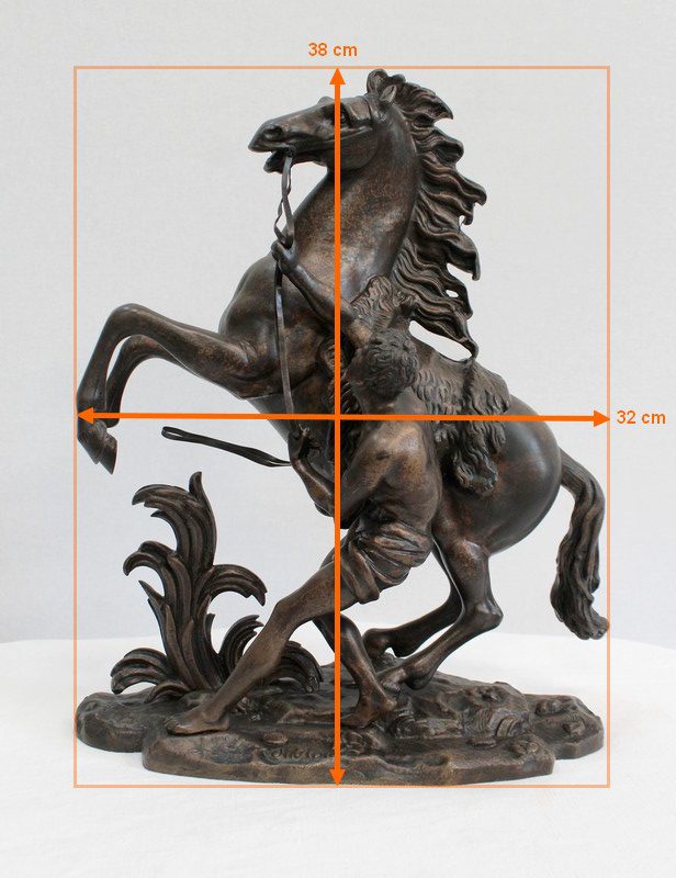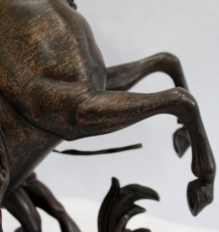 Bronze à patine brune aux discrets reflets dorés signé « Coustou » sur la terrasse, prenant pour thème un des destriers de Marly.