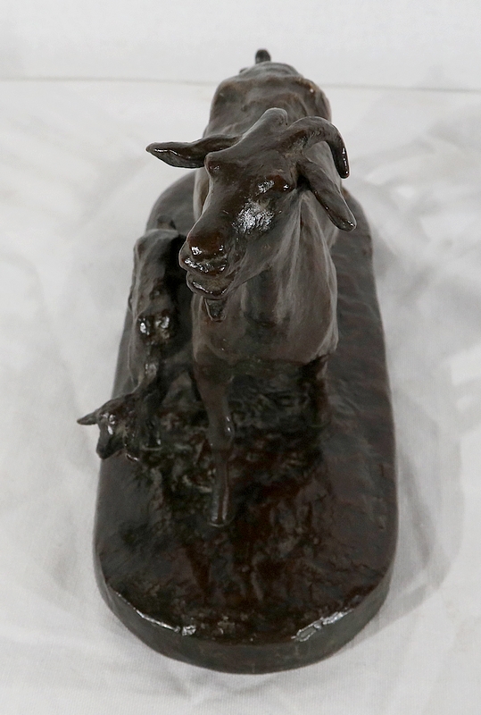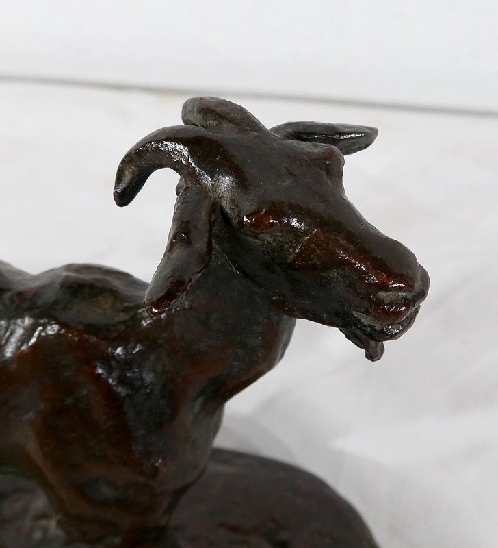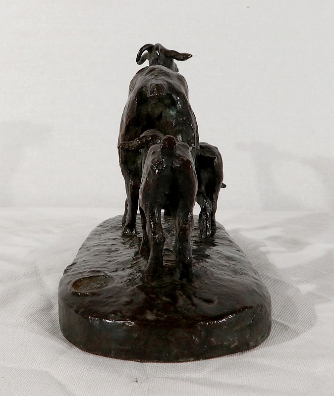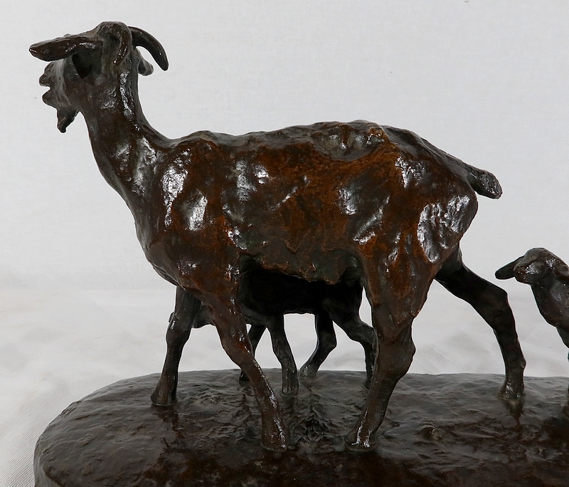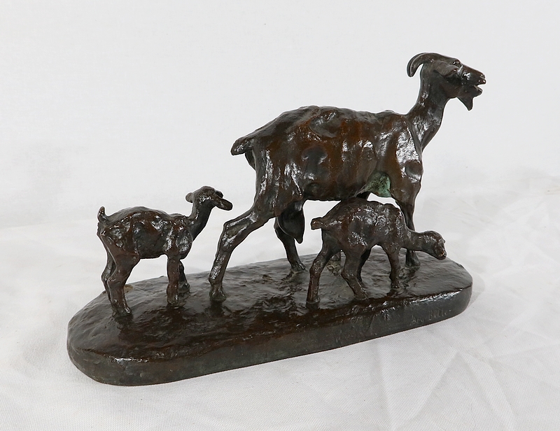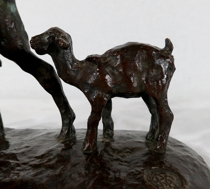 Sujet non réédité, donc rare, « Chèvre et ses chevreaux » est un bronze bucolique soulignant la passion de l’artiste pour les animaux. La chèvre marche accompagnée de ses deux petits. Ary Bitter les sculpte de manière fine et rugueuse.