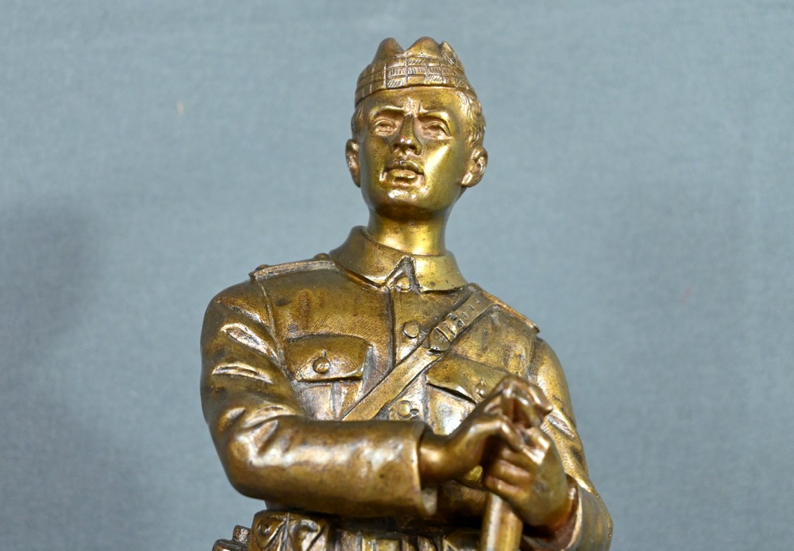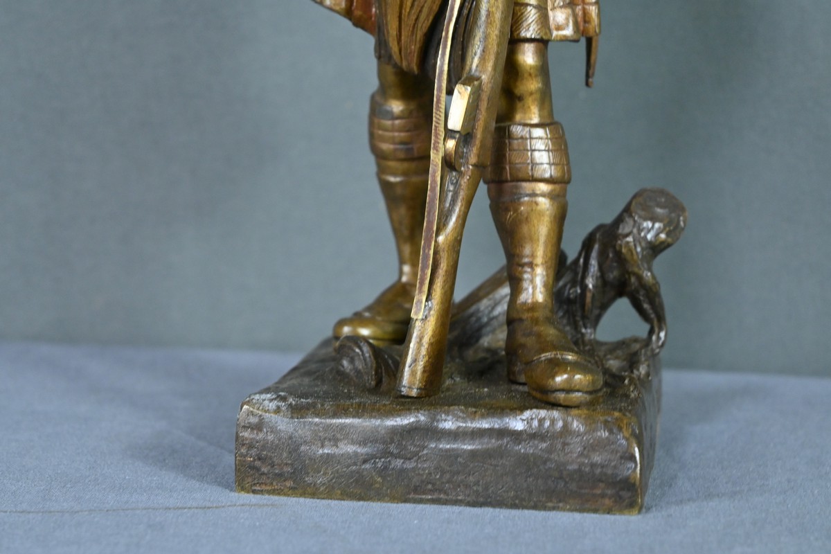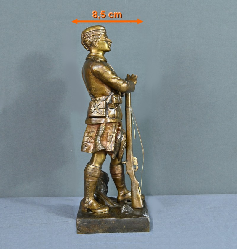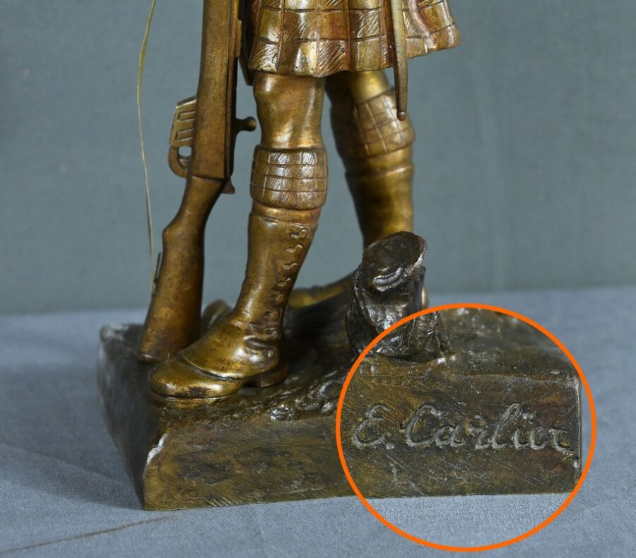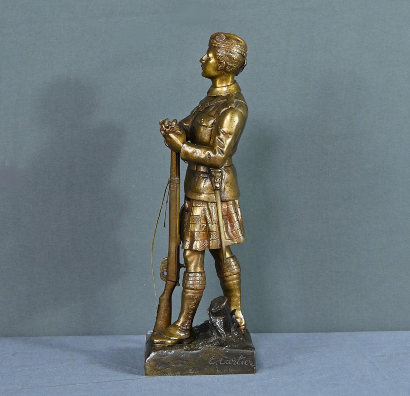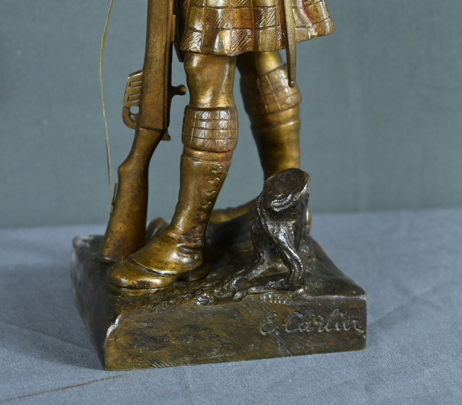 Cette sculpture en bronze à patine médaille, signée Emile Joseph Carlier (1849-1927), représente un fantassin écossais dans une posture fière et déterminée.
