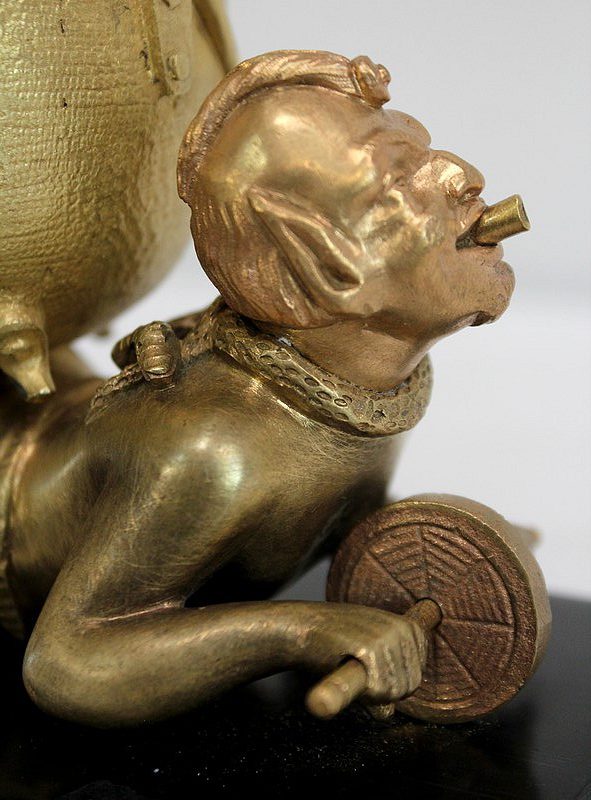 Bronze à patine dorée figurant deux diablotins, reposant sur un socle en marbre de couleur noire.