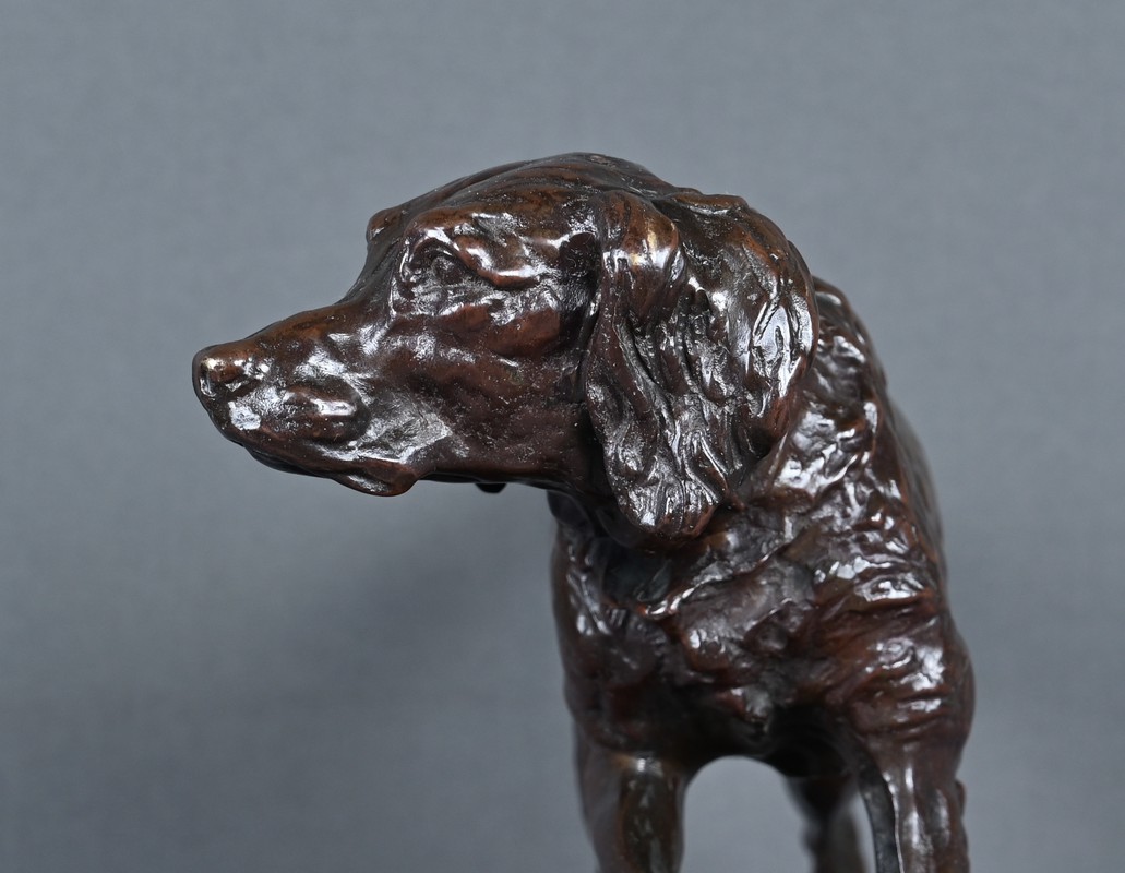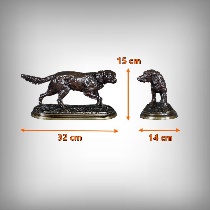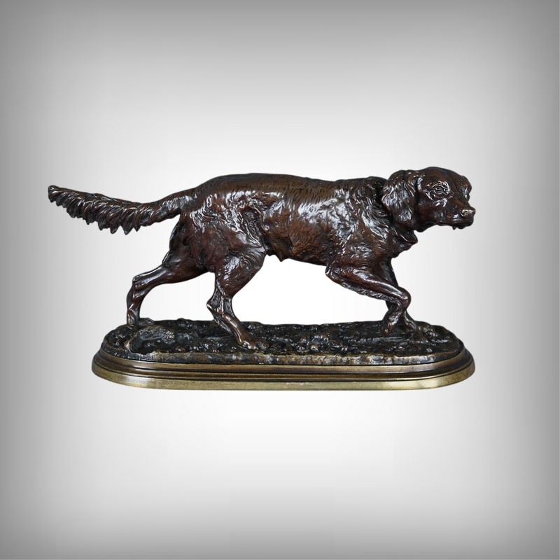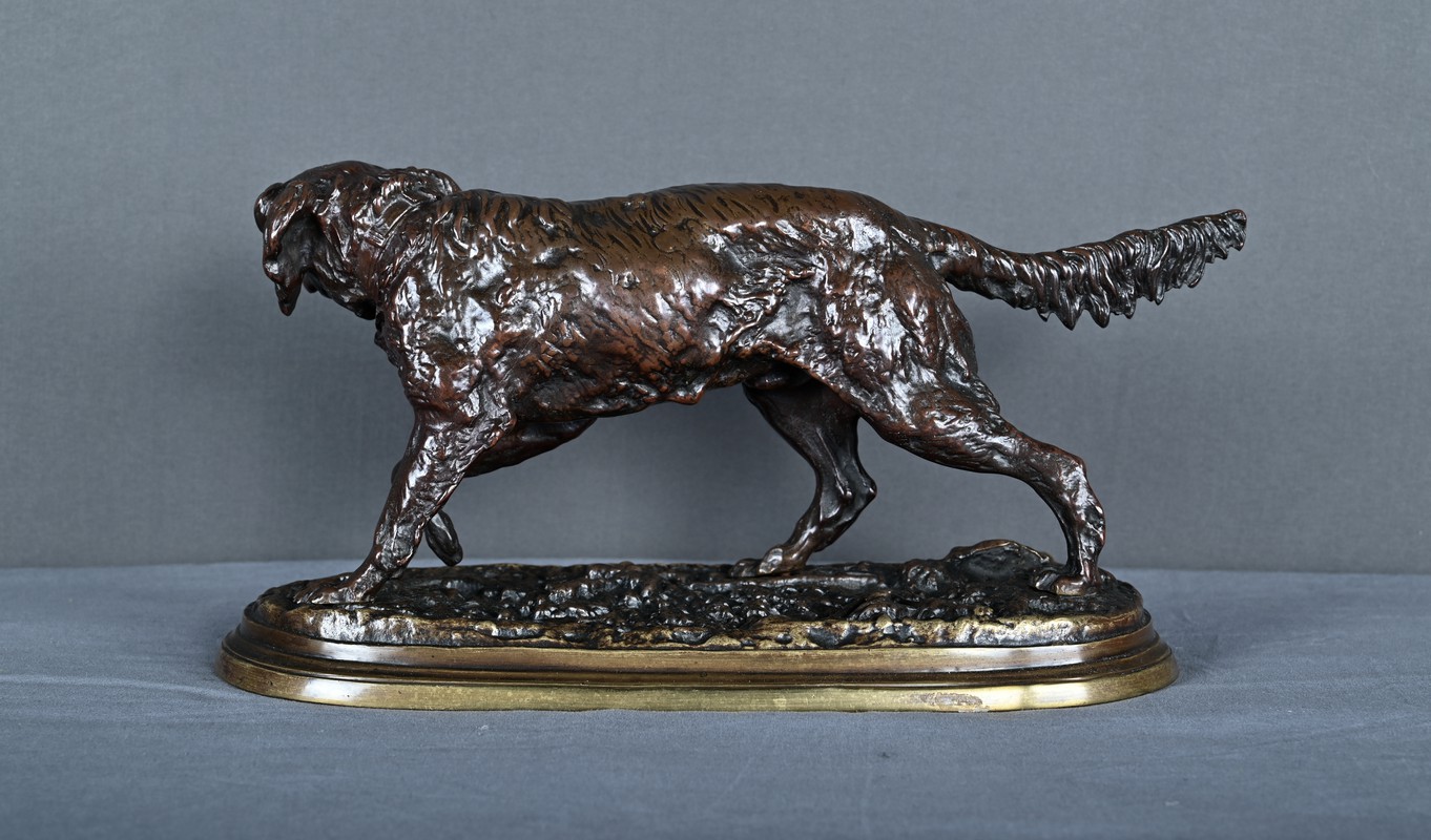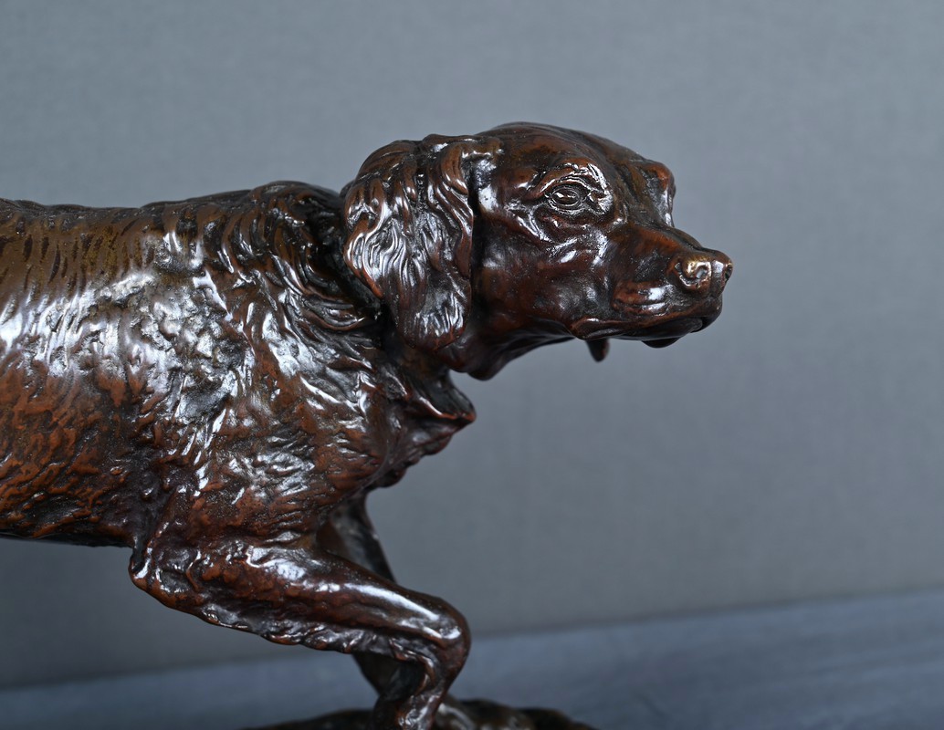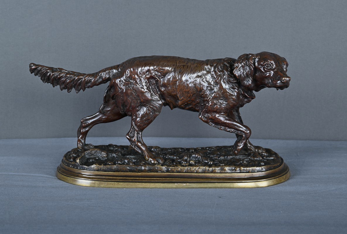 Superbe sculpture animalière en bronze à patine brune, réalisée par le célèbre sculpteur français Pierre-Jules Mêne (1810–1879), maître incontesté de l’art animalier du XIXe siècle. Cette œuvre représente un épagneul en position d’arrêt, concentré et vigilant, le regard fixé vers l’horizon, une patte délicatement levée dans l’attitude caractéristique du chien de chasse ayant repéré le gibier.