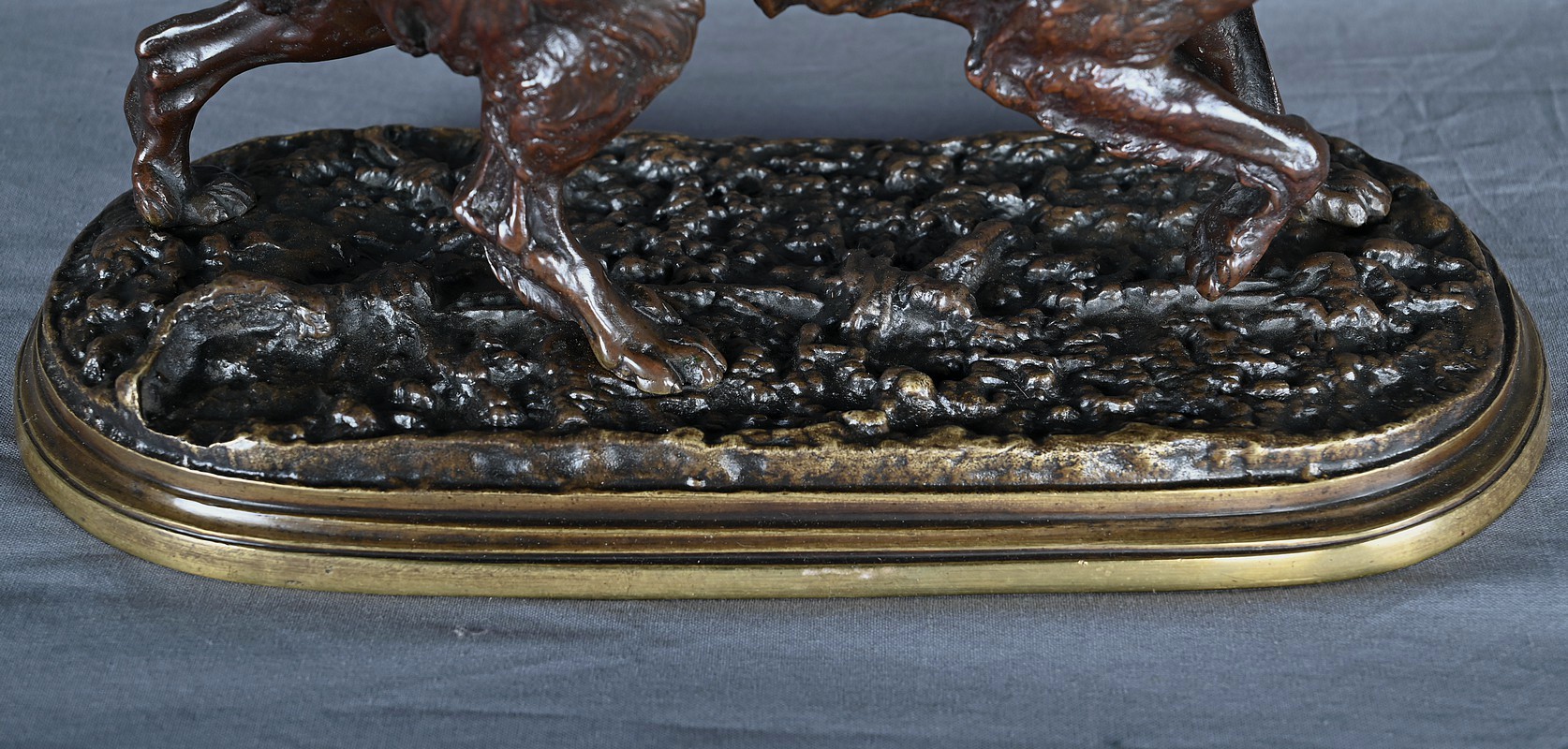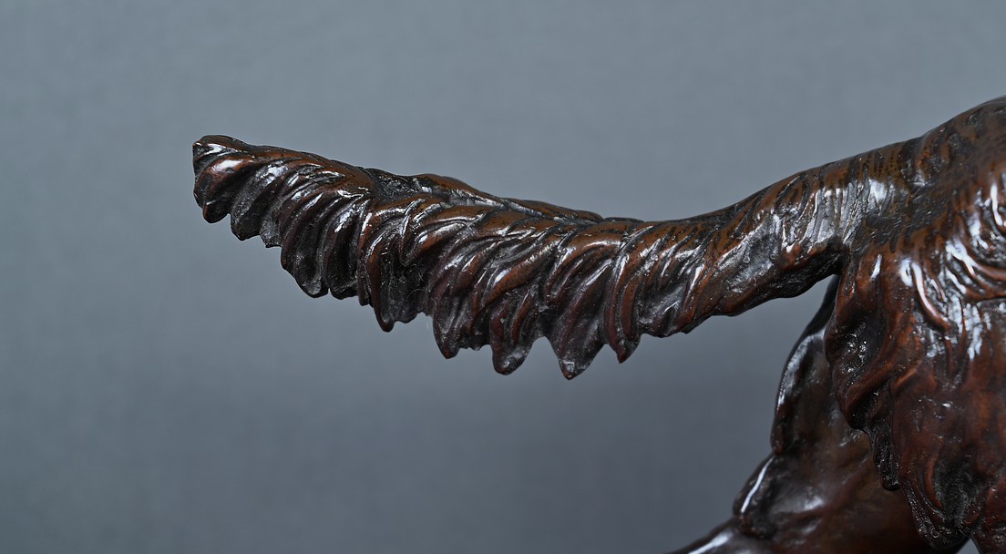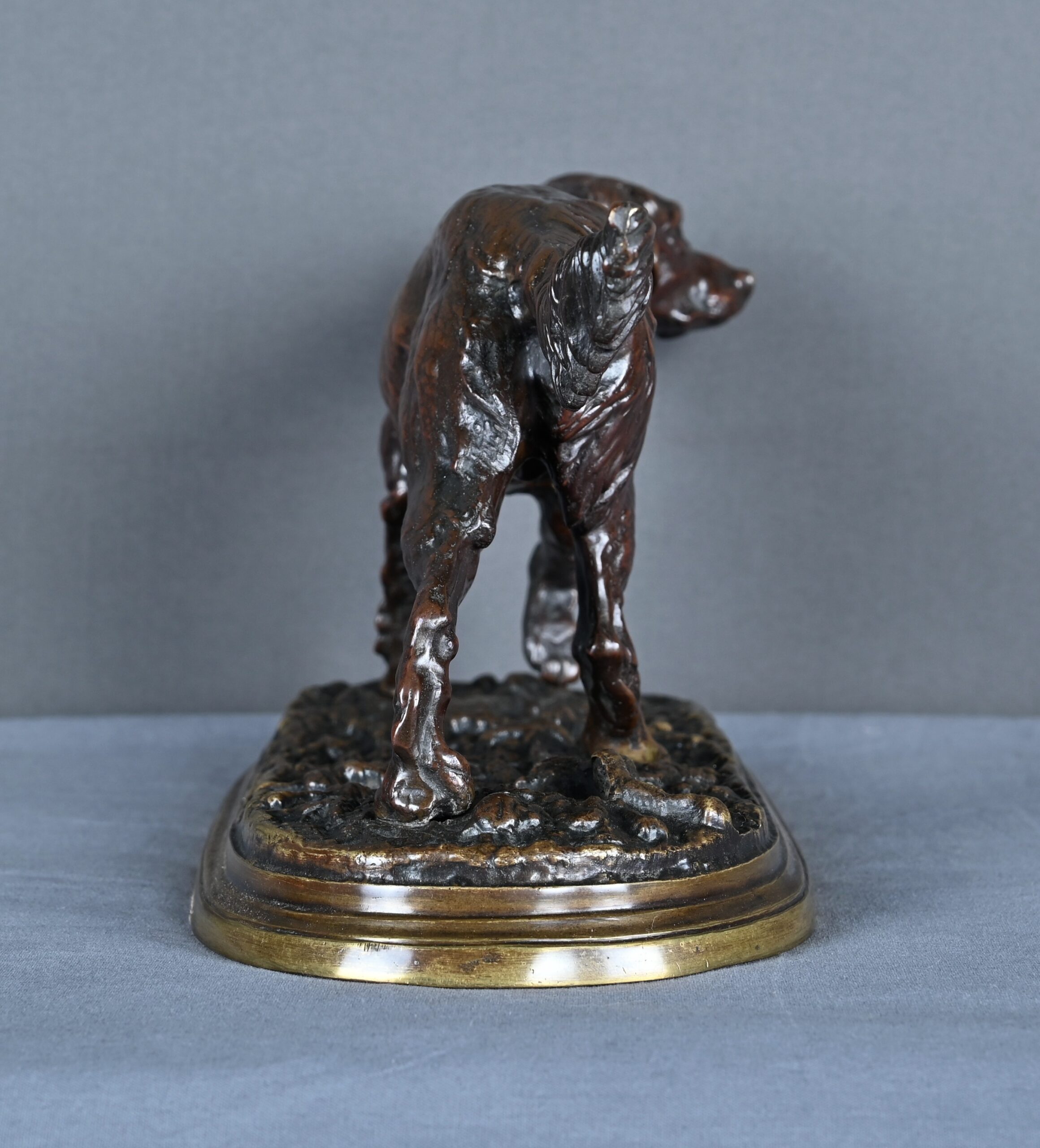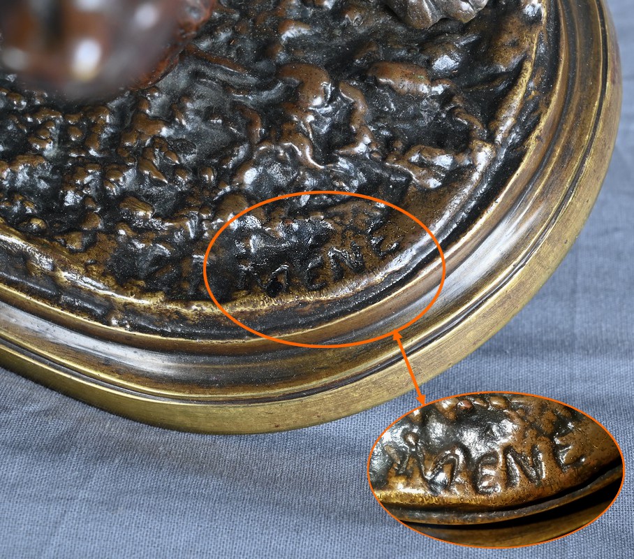 L’ensemble repose sur une élégante terrasse oblongue à patine médaille, évoquant un sol naturel et mettant en valeur la noblesse du sujet. Cette sculpture est une pièce de collection idéale pour les amateurs d’art cynégétique, les passionnés de bronze du XIXe siècle ou les connaisseurs de l’œuvre de Mêne.
