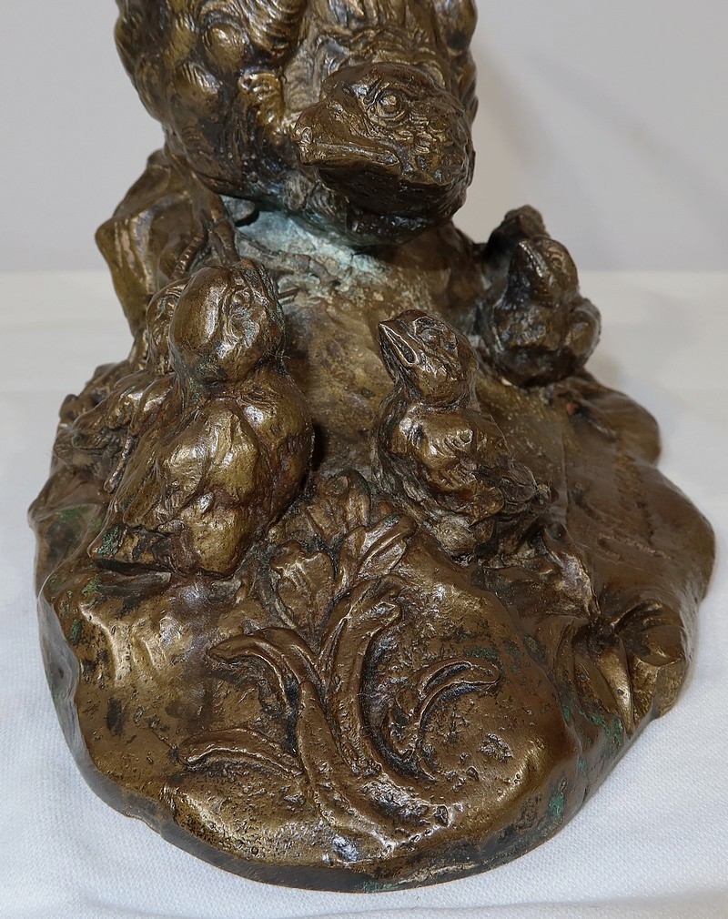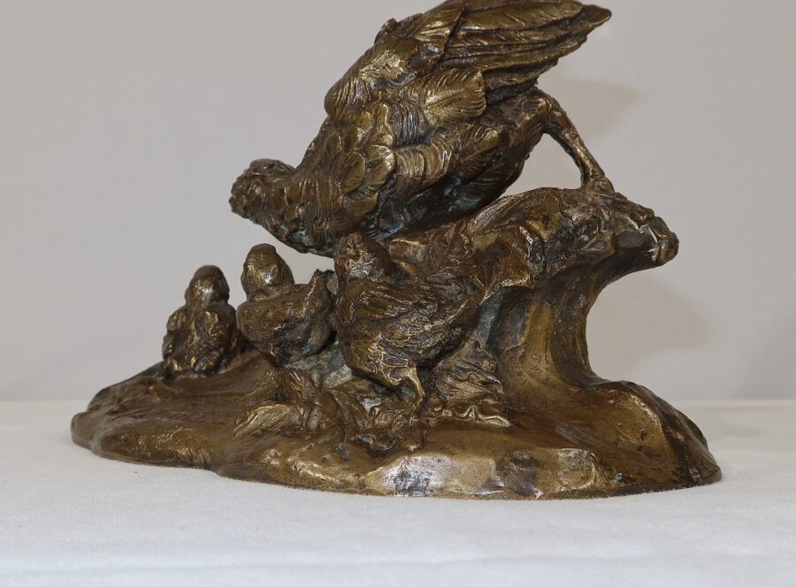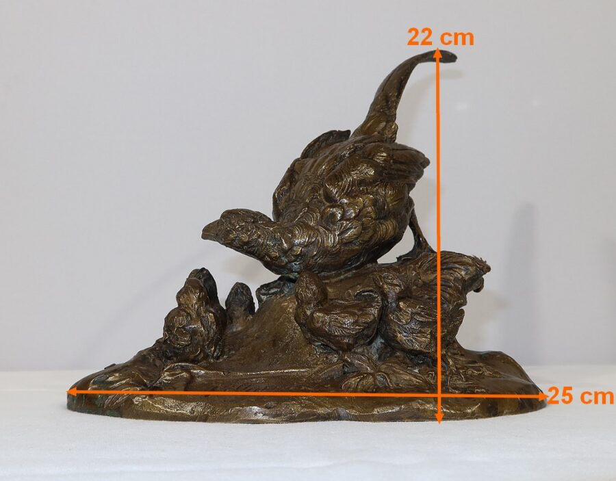 Cette sculpture animalière touchante et parfaitement exécutée, nous montre cette famille d’oiseaux dans son milieu naturel, entourée d’herbe et de feuillages. La faisane est en alerte penchée vers ses petits, la queue surélevée. Ils la regardent, attentifs.