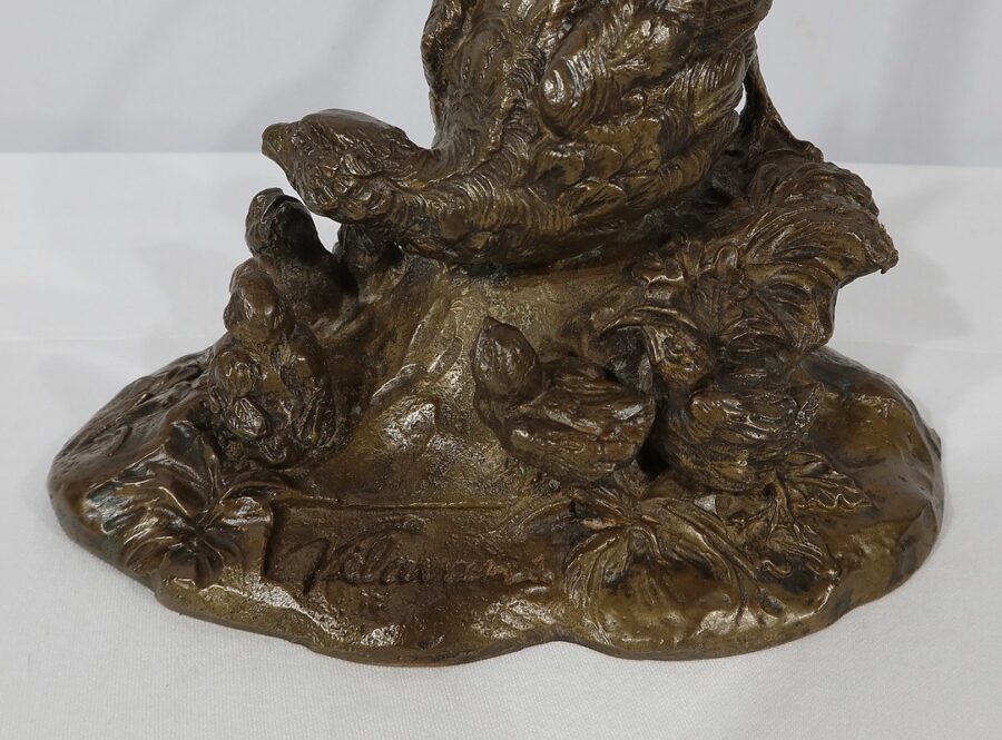 Sujet en bronze à patine médaille signé sur la terrasse Vilavan, représentant une poule faisane protégeant ses cinq petits.