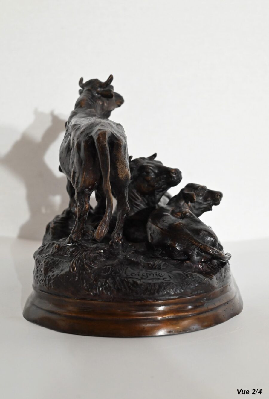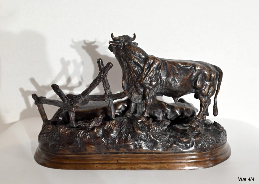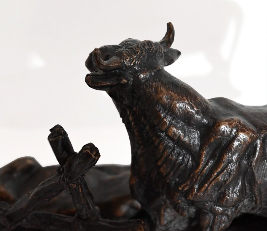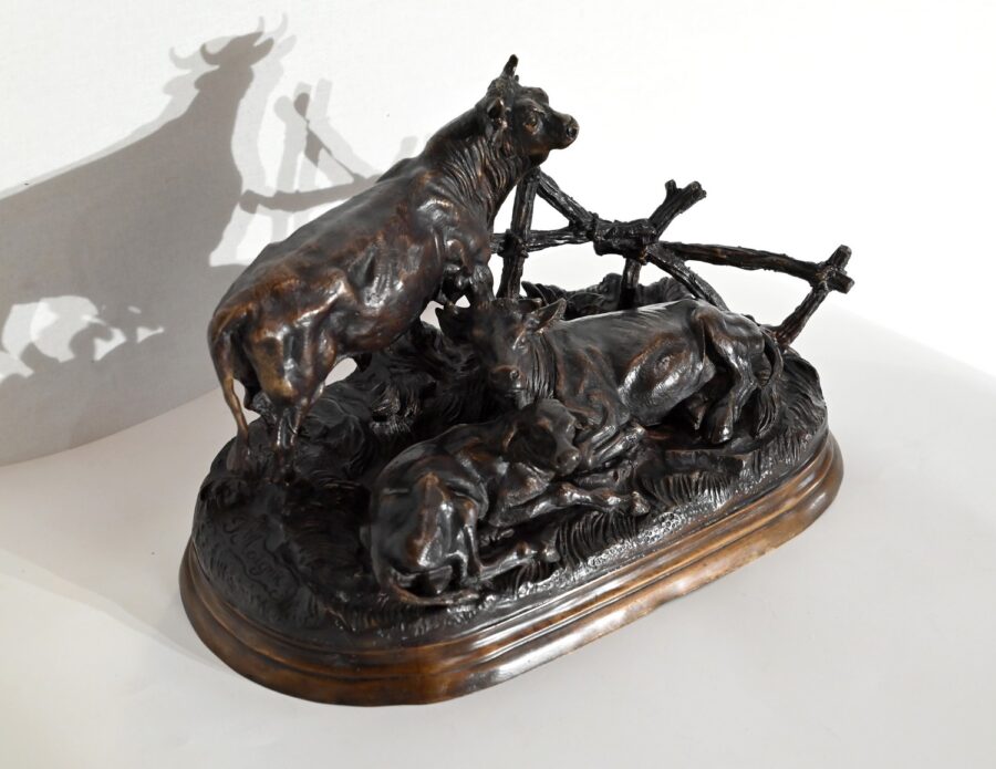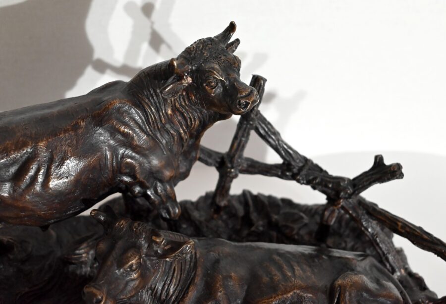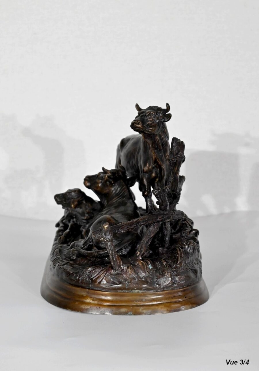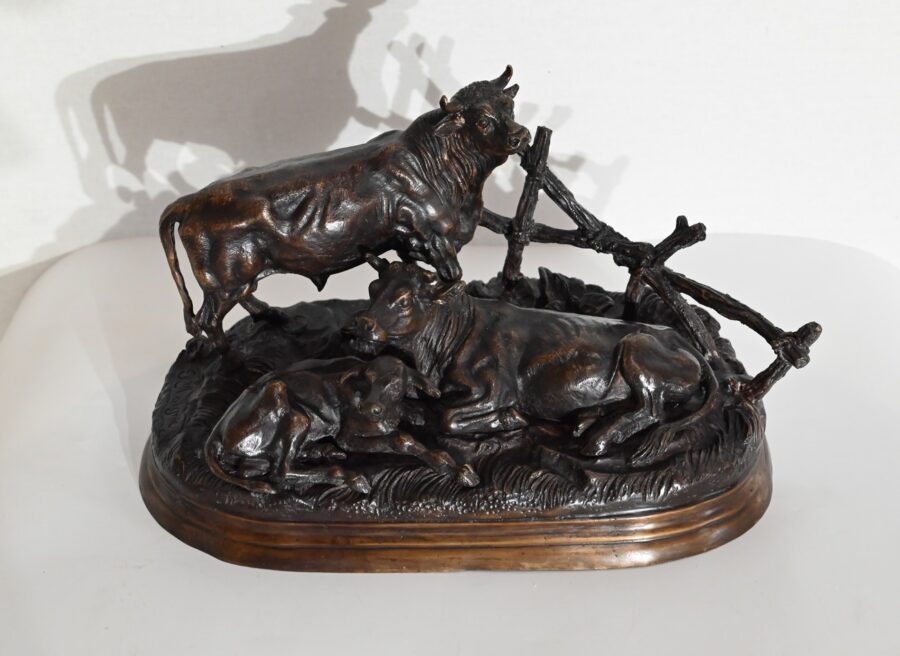Ce bronze à patine brune, intitulé « Famille bovine », nous invite à découvrir trois animaux. Le taureau imposant par sa fière allure, la tête haute et regardant vers le ciel, donne à cette scène, un sentiment de quiétude et d’apaisement par sa figure protectrice. On notera la précision et la finesse des détails de sa musculature, des plis de son cou, de ses pattes. Devant lui, allongés sur une terrasse en bronze formant une prairie, la vache et son tout jeune veau, paisibles, tendrement blottis l’un contre l’autre. L’ensemble repose sur un socle lisse à gorge.