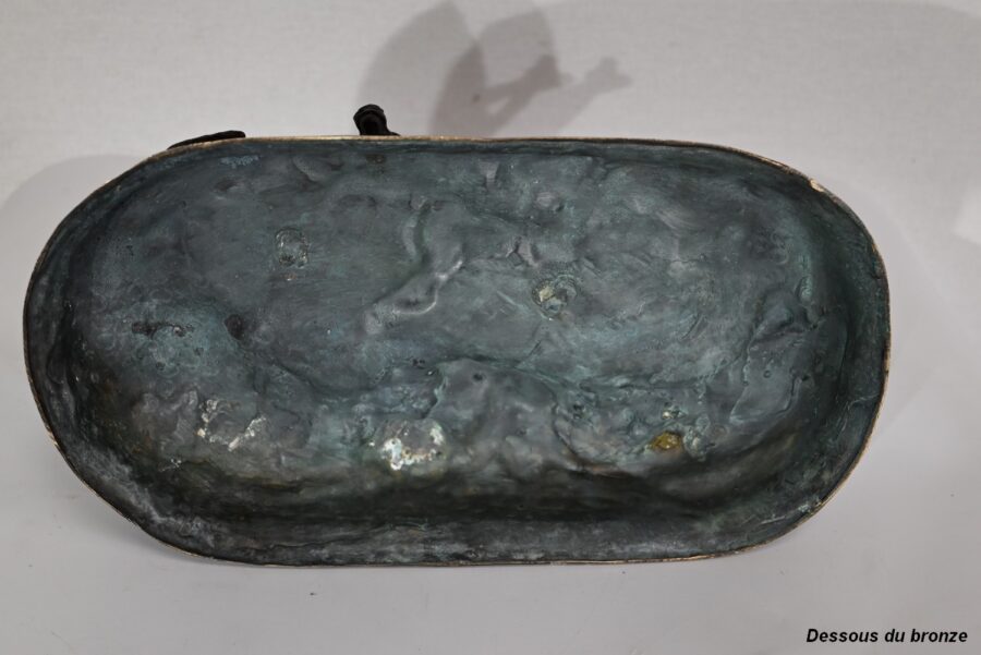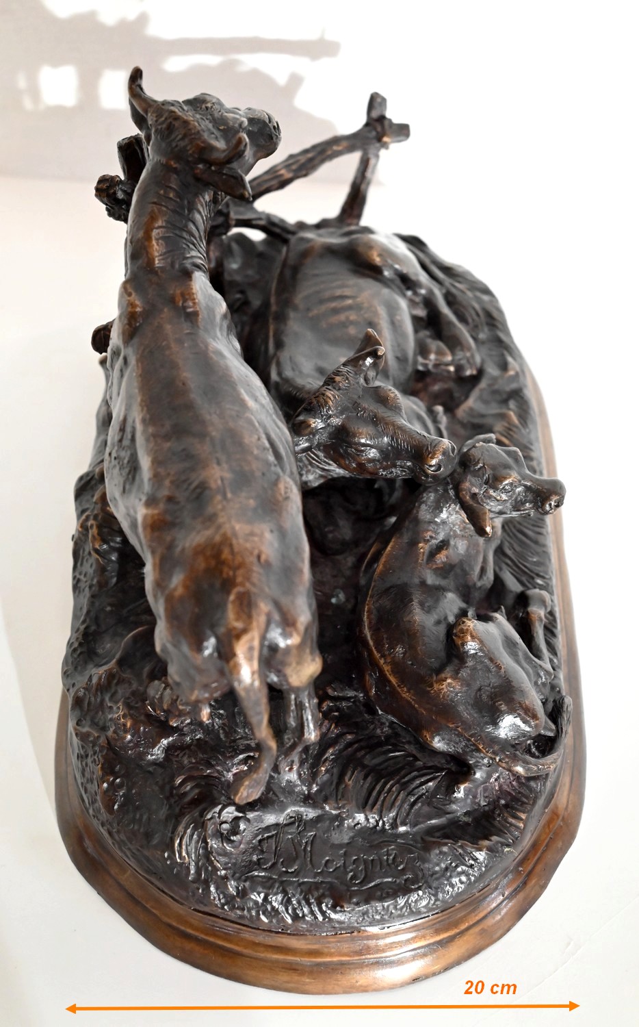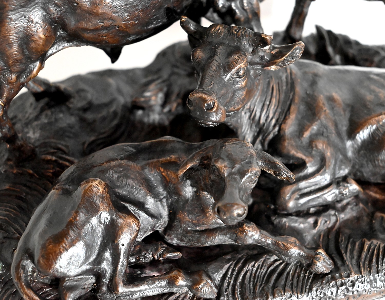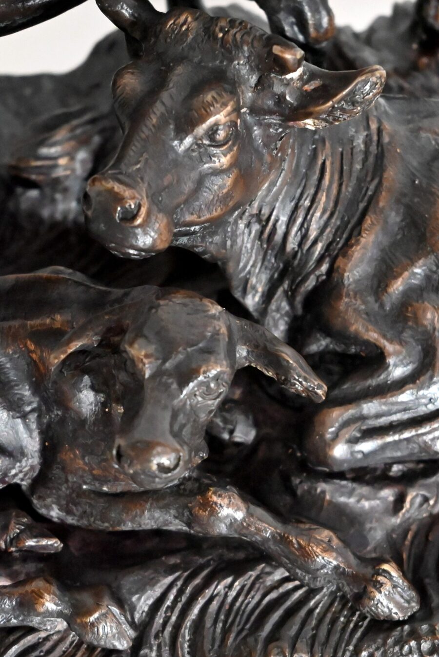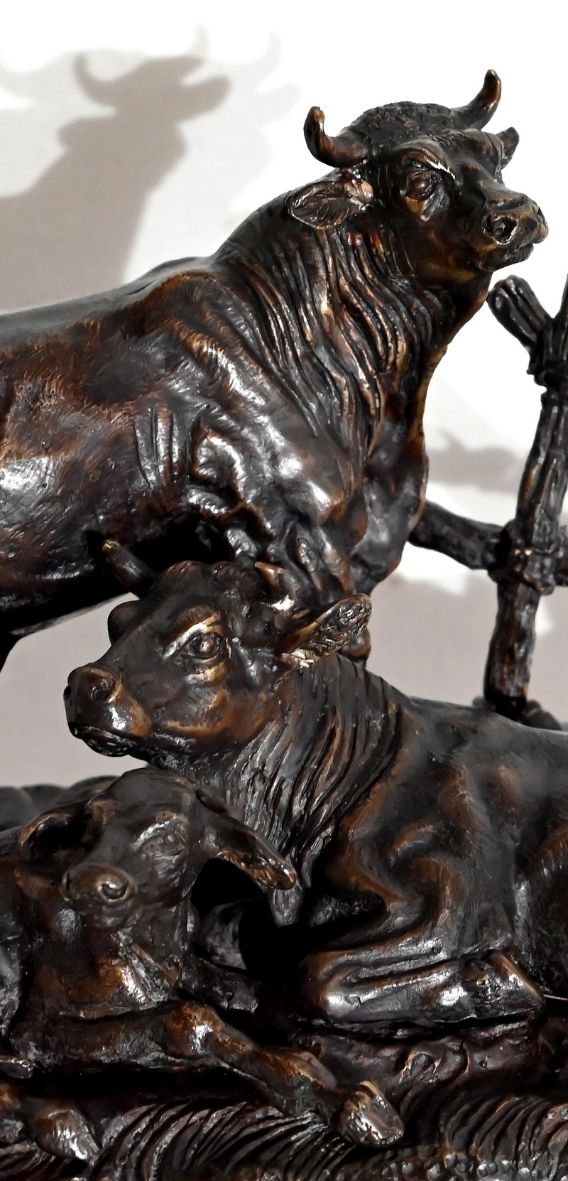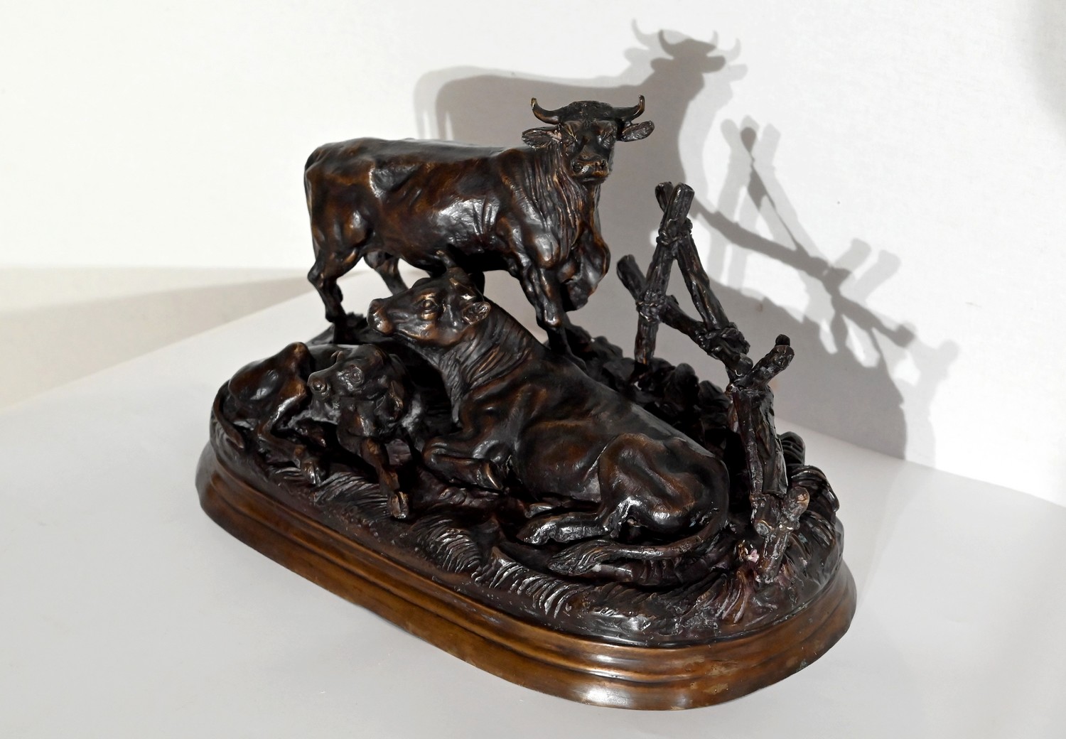 Ce bronze à patine brune, intitulé « Famille bovine », nous invite à découvrir trois animaux. Le taureau imposant par sa fière allure, la tête haute et regardant vers le ciel, donne à cette scène, un sentiment de quiétude et d’apaisement par sa figure protectrice. On notera la précision et la finesse des détails de sa musculature, des plis de son cou, de ses pattes. Devant lui, allongés sur une terrasse en bronze formant une prairie, la vache et son tout jeune veau, paisibles, tendrement blottis l’un contre l’autre. L’ensemble repose sur un socle lisse à gorge.