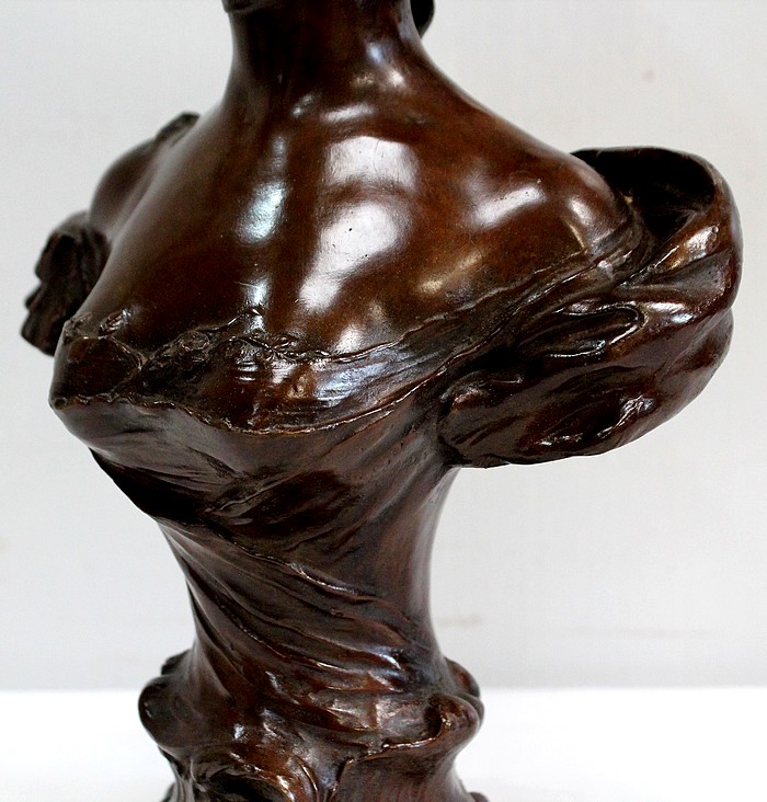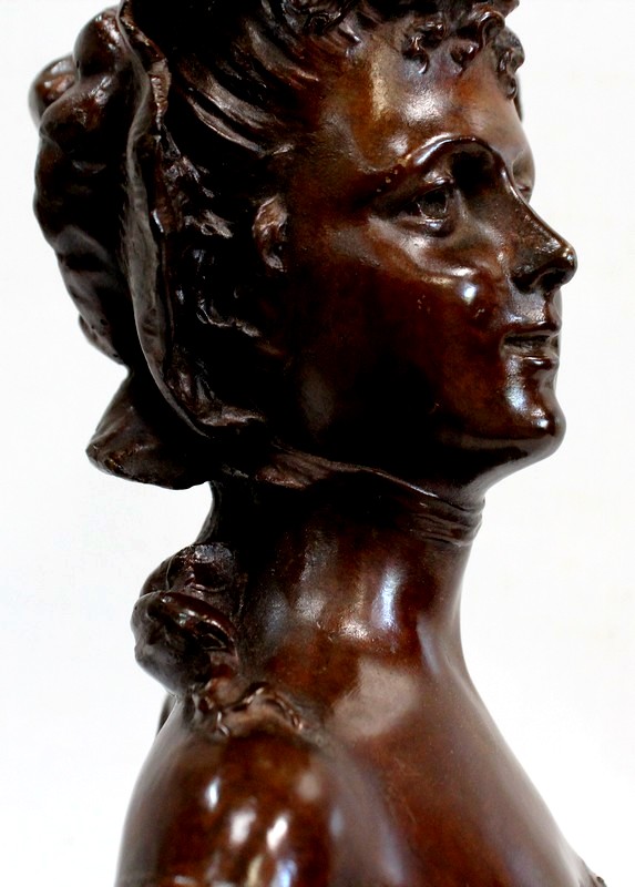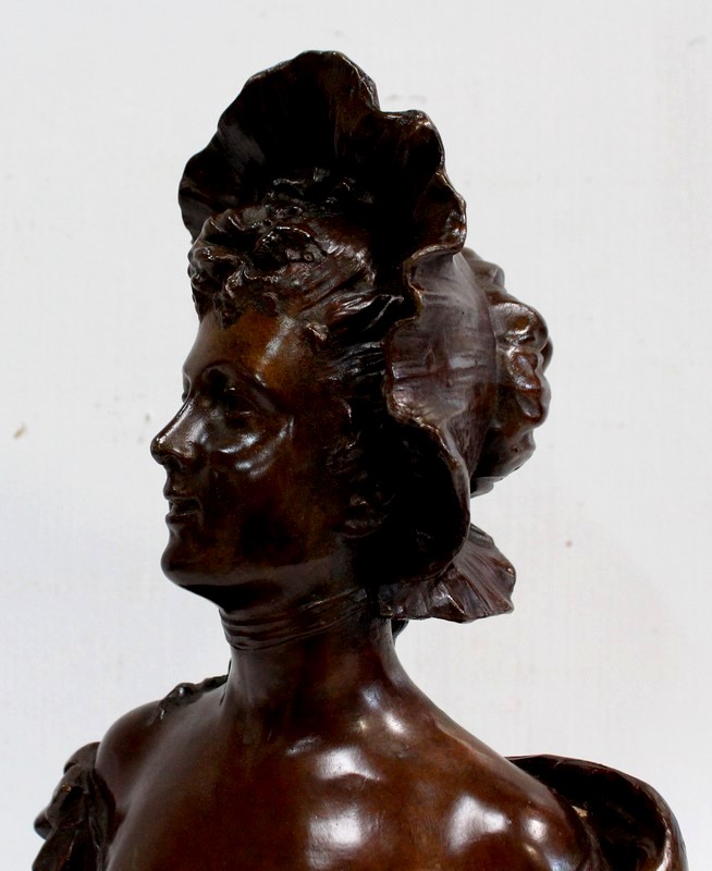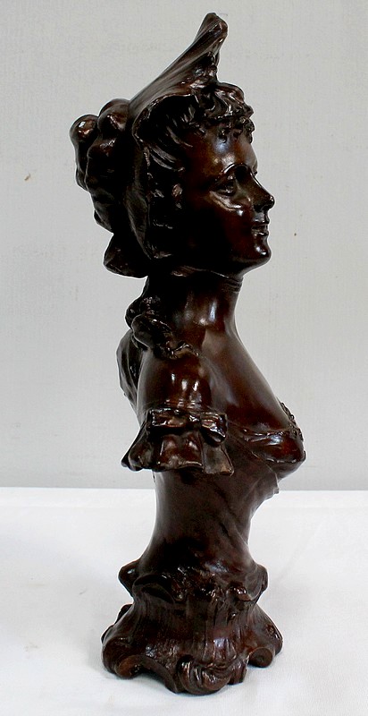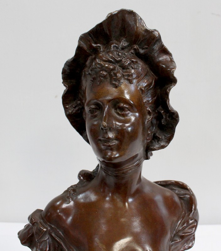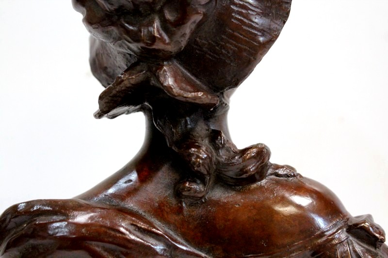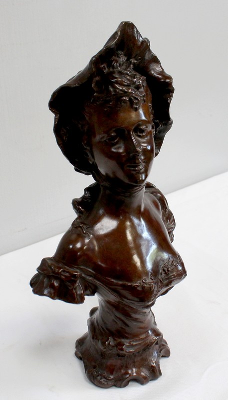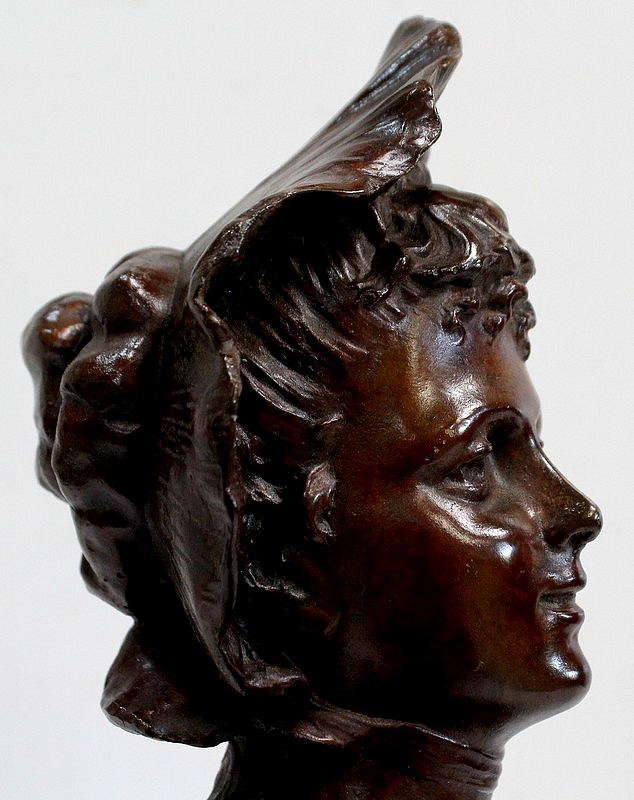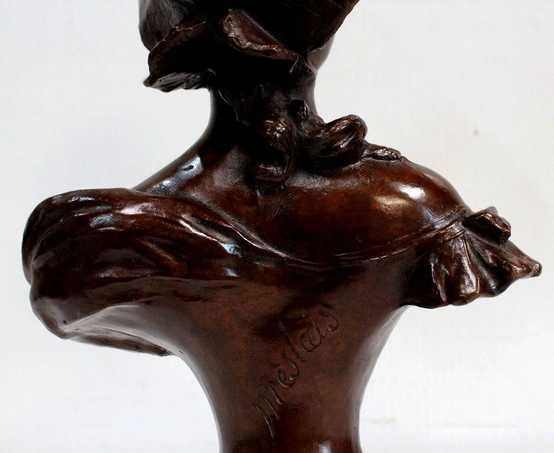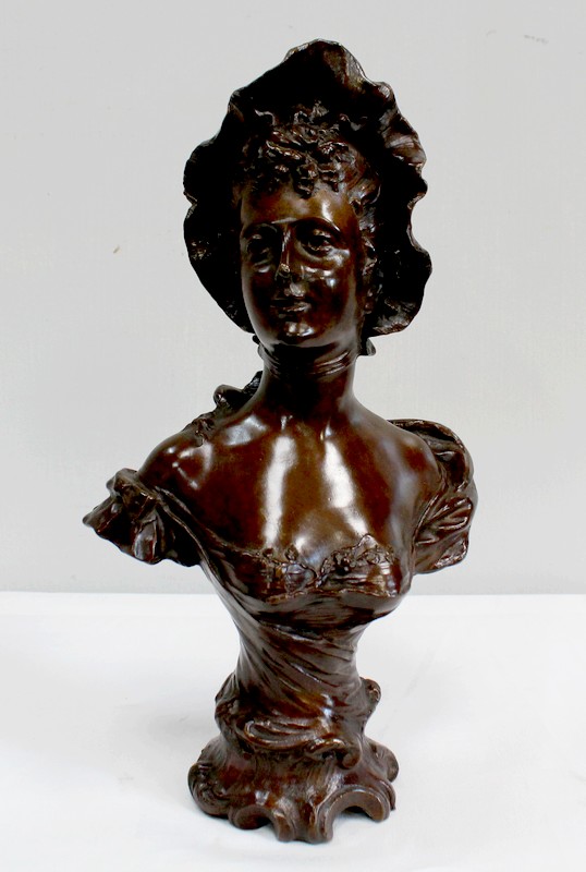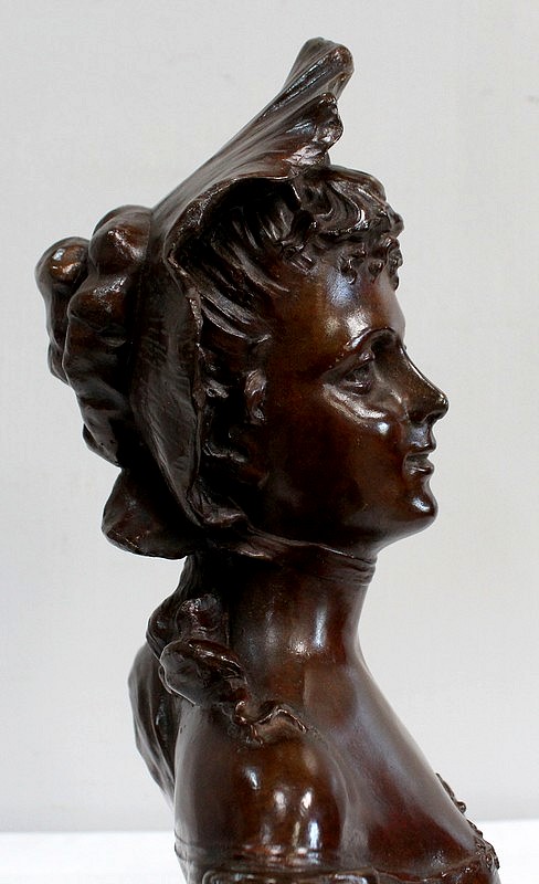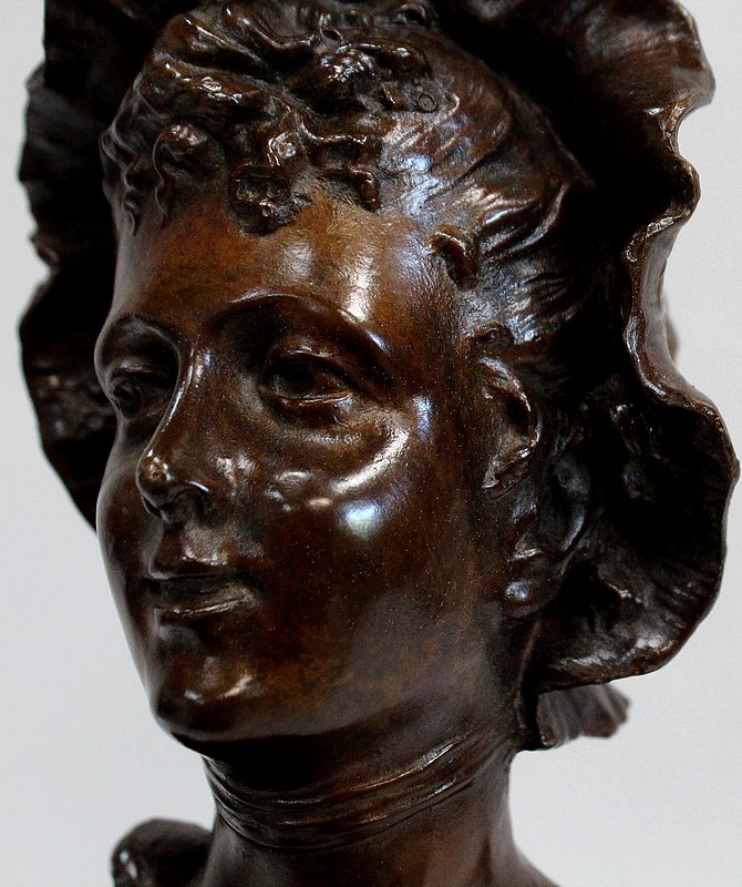 Buste en Bronze à Patine Brune signé Meslais, représentant une Elégante Demoiselle portant un Chapeau sur ses Cheveux ondulés.