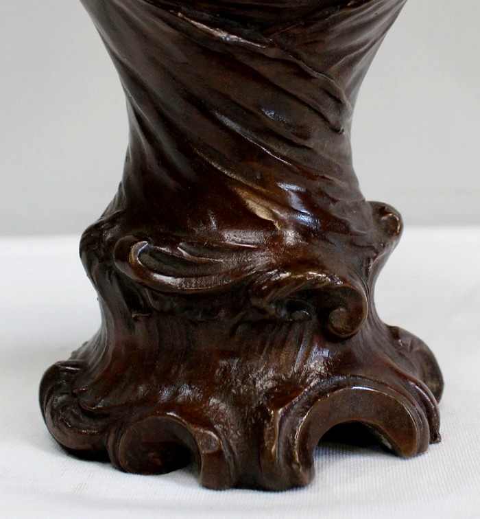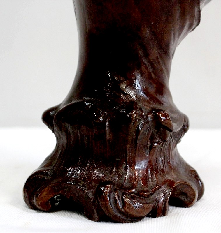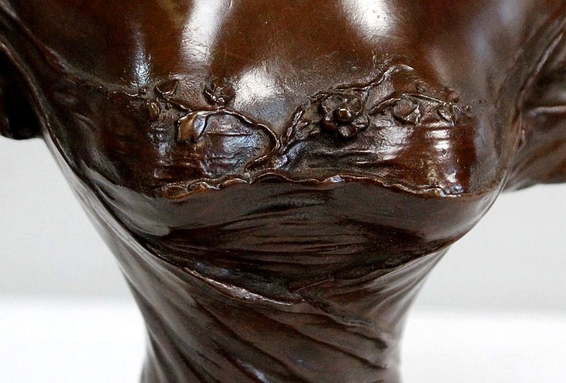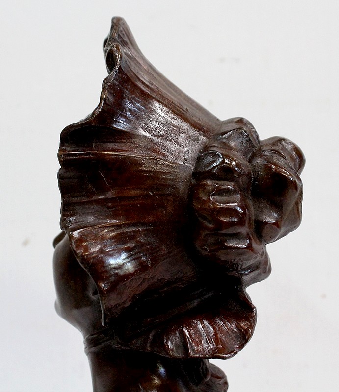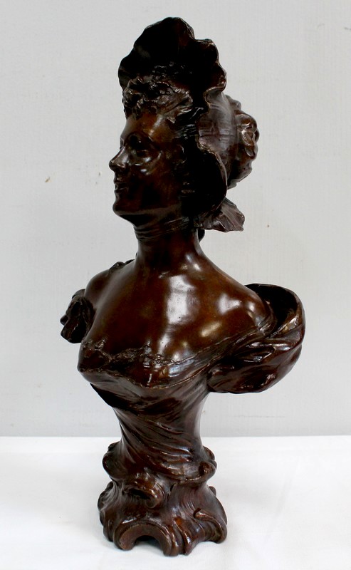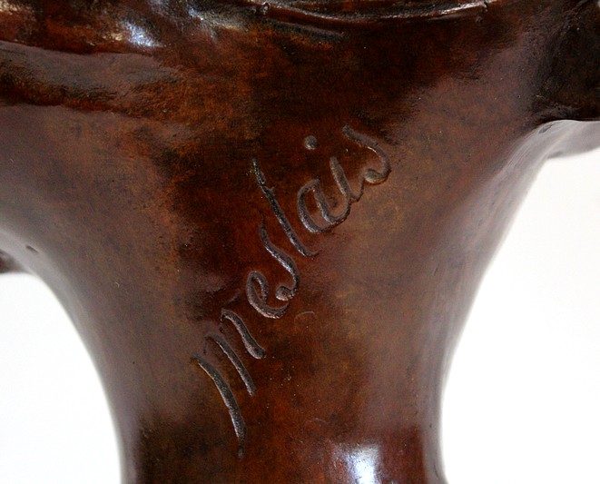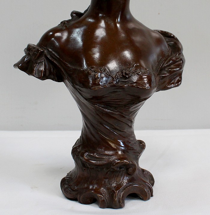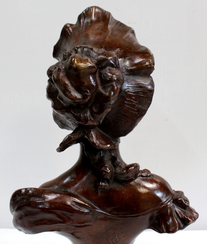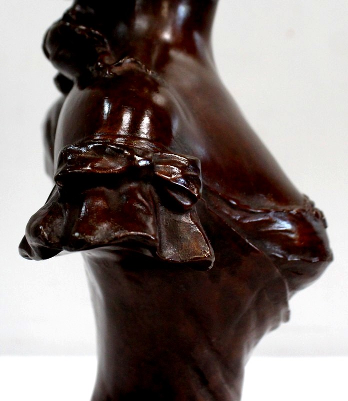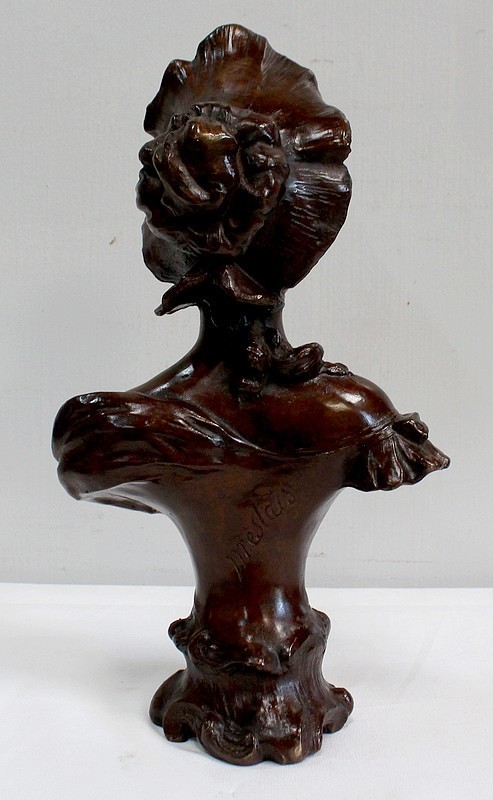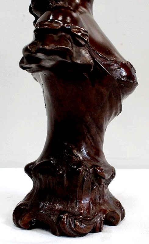 Buste en Bronze à Patine Brune signé Meslais, représentant une Elégante Demoiselle portant un Chapeau sur ses Cheveux ondulés.