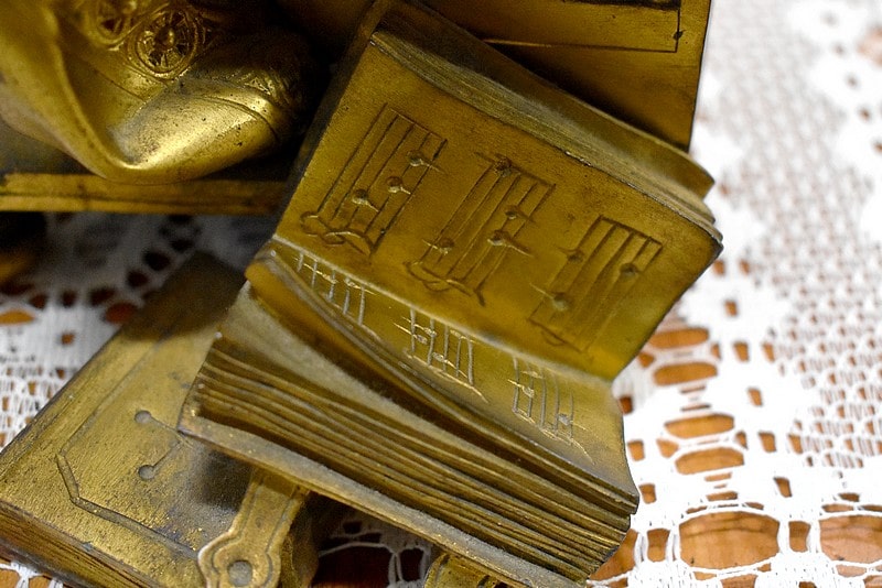 A son côté, un livre religieux est posé sous un recueil de partitions.