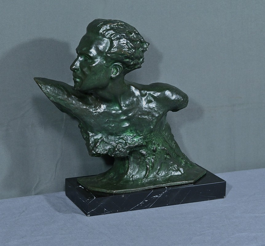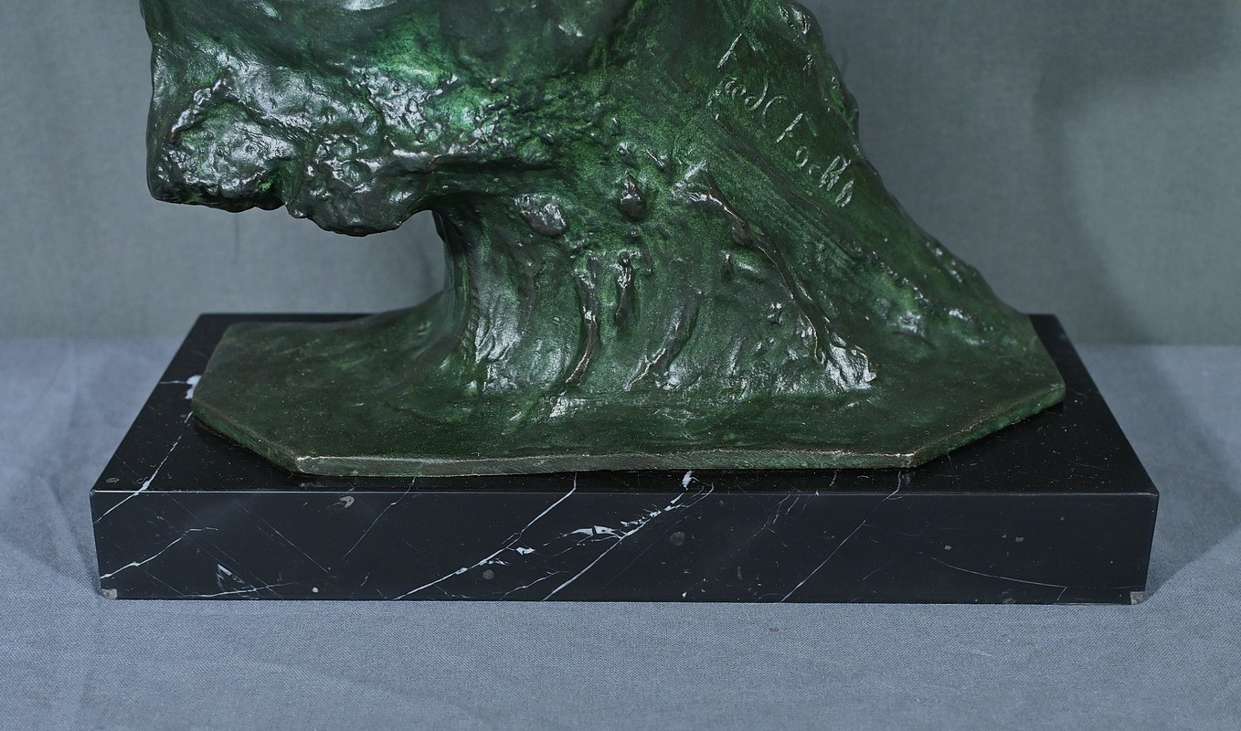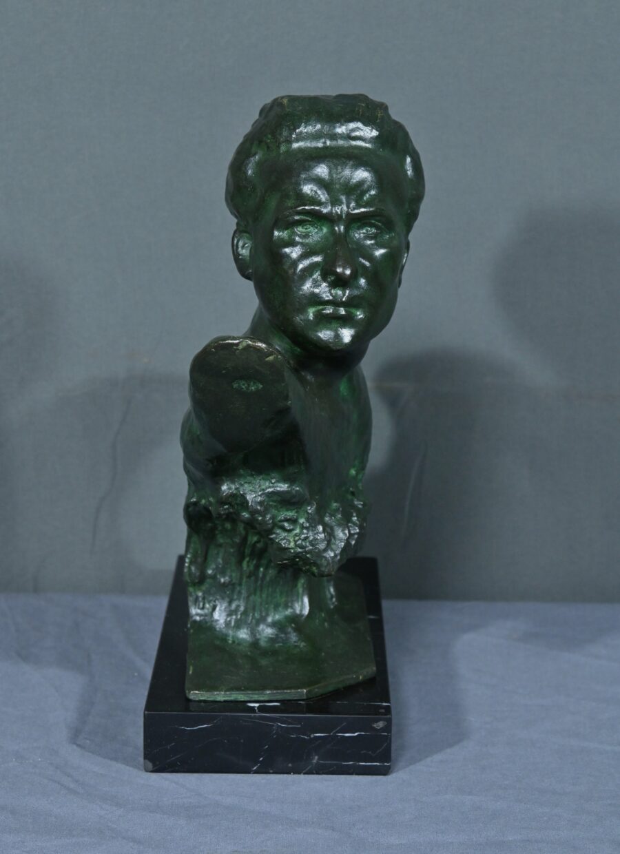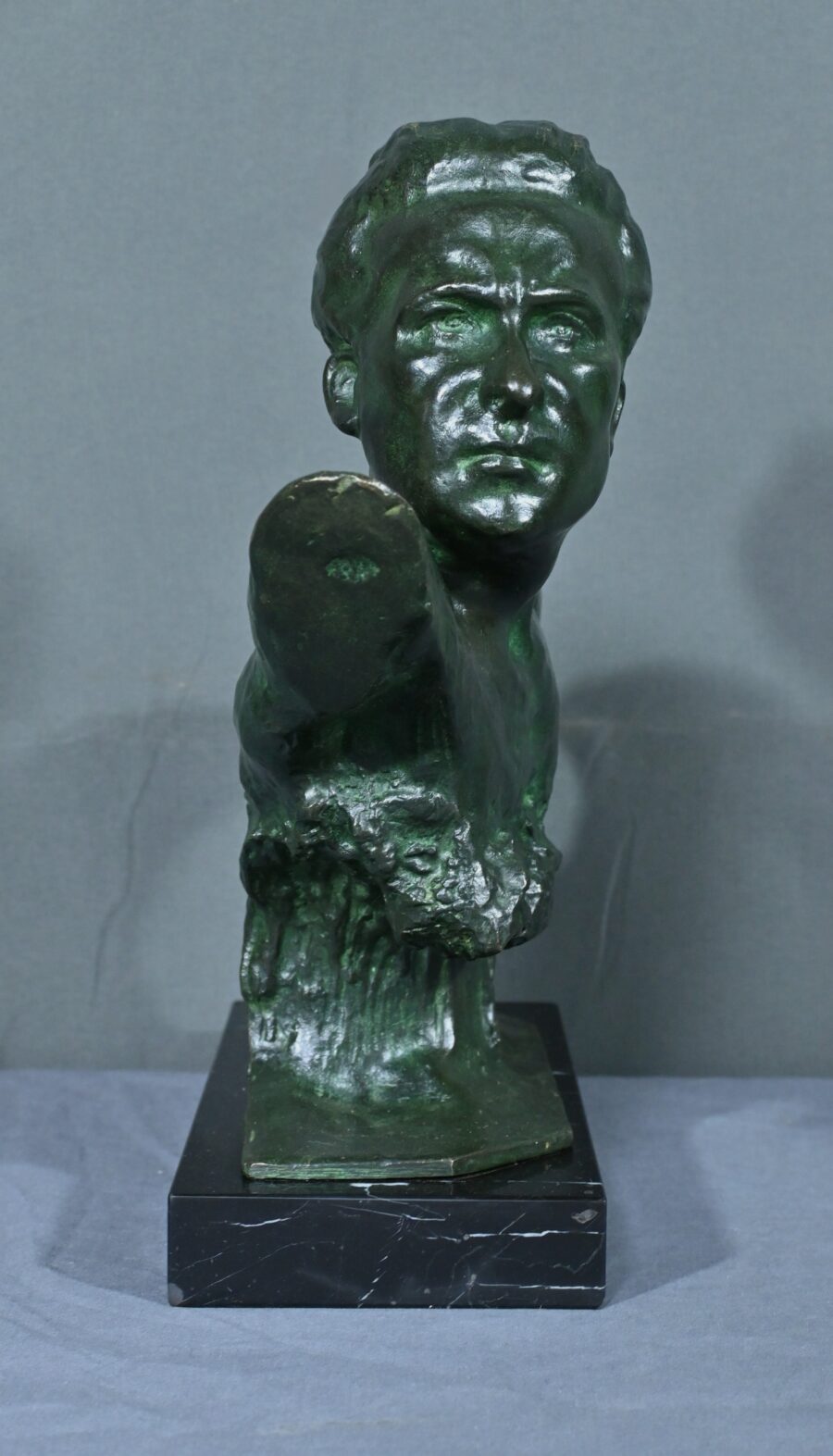 Magnifique bronze à patine verte, signé Frédéric Focht, célèbrant la figure légendaire de Jean Mermoz, l’un des plus grands aviateurs français. Cette sculpture saisissante capte l’essence héroïque et dynamique de Mermoz, symbolisant son courage et son esprit d’exploration. Cette création empreinte de mouvement transmet la détermination et la passion de Jean Mermoz, cheveux au vent, véritable icône de l’histoire aéronautique. Cette œuvre d’art, reposant sur un socle en marbre noir, est bien plus qu’un simple objet décoratif. Elle incarne l’histoire et l’héritage d’une époque, parfaite pour les collectionneurs d’art ou les passionnés d’aviation et d’histoire.