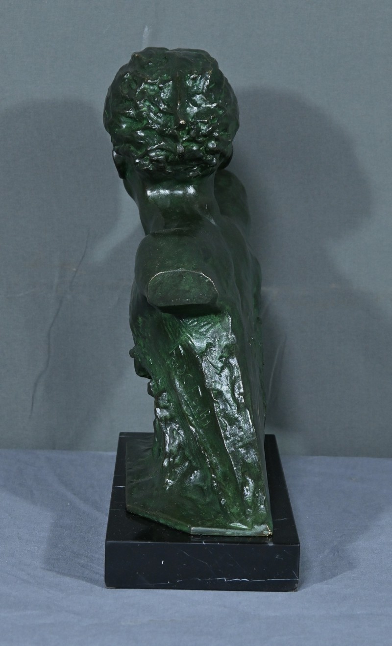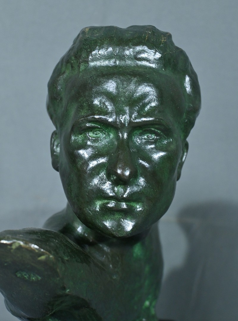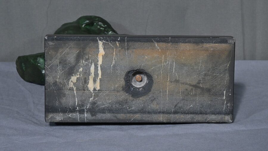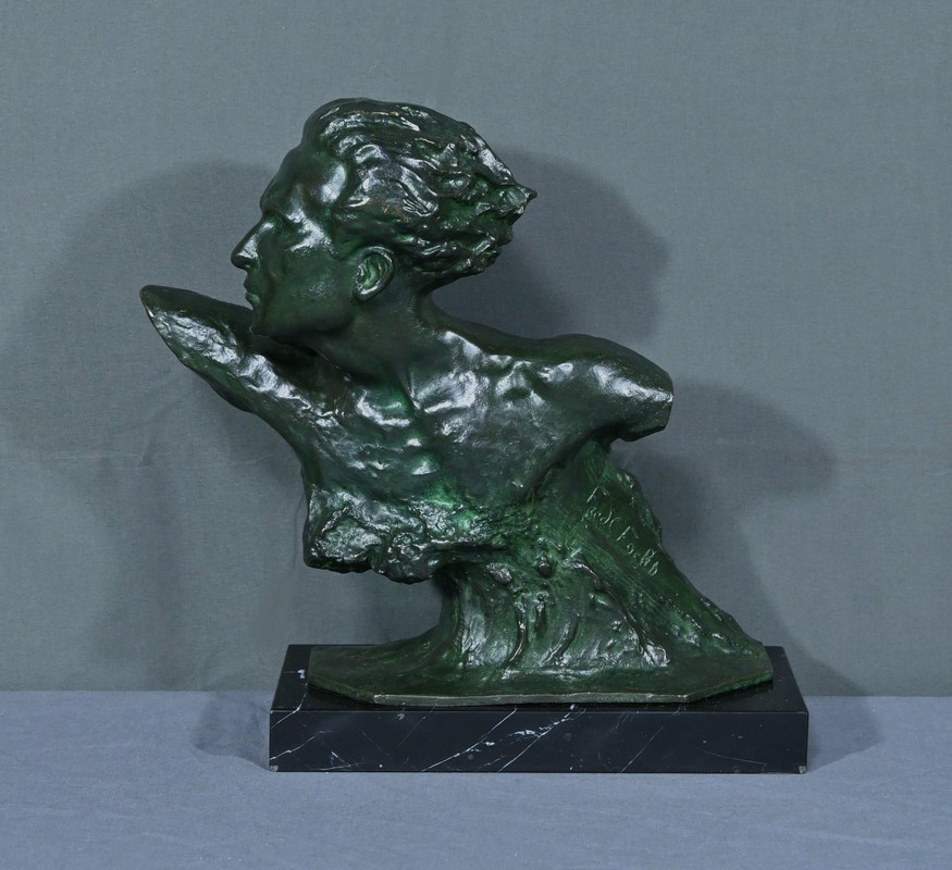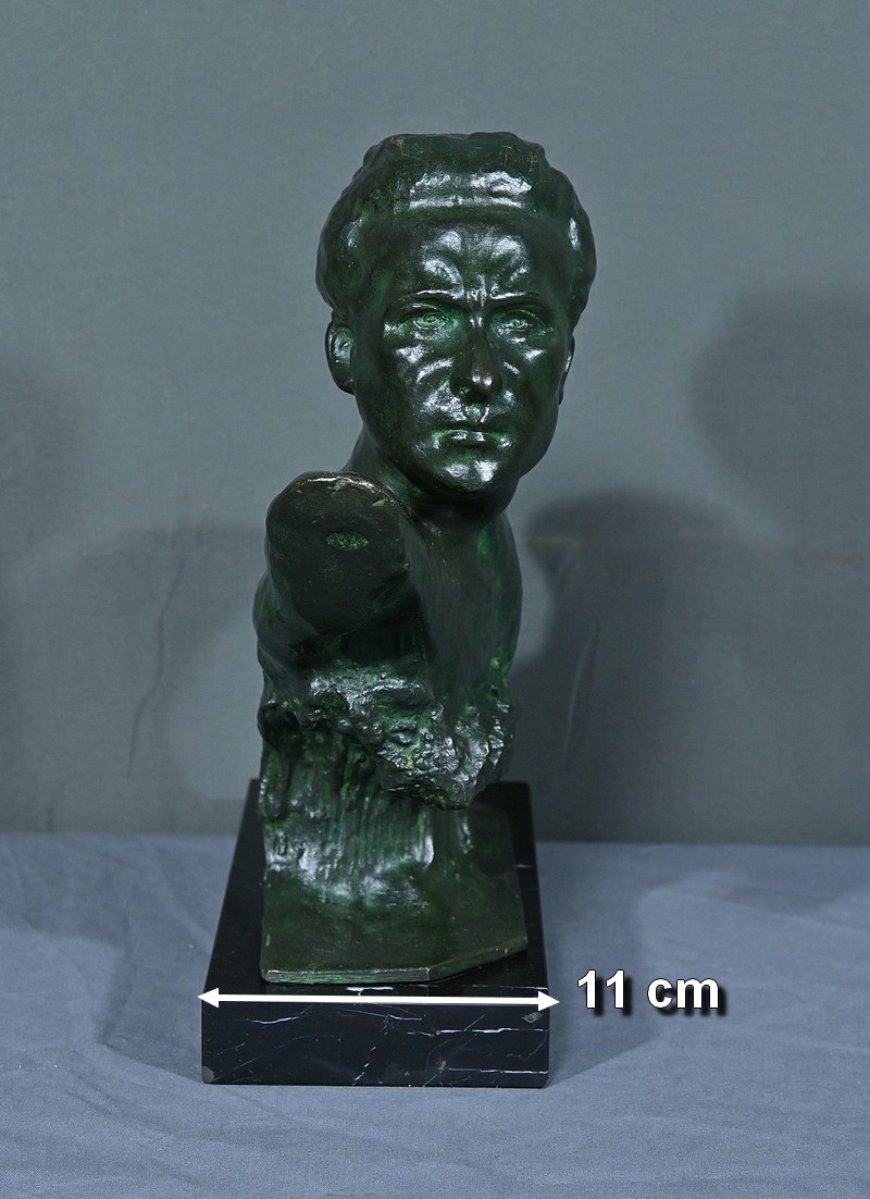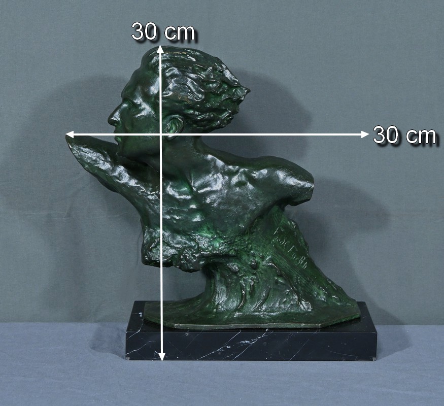 Magnifique bronze à patine verte, signé Frédéric Focht, célèbrant la figure légendaire de Jean Mermoz, l’un des plus grands aviateurs français. Cette sculpture saisissante capte l’essence héroïque et dynamique de Mermoz, symbolisant son courage et son esprit d’exploration. Cette création empreinte de mouvement transmet la détermination et la passion de Jean Mermoz, cheveux au vent, véritable icône de l’histoire aéronautique. Cette œuvre d’art, reposant sur un socle en marbre noir, est bien plus qu’un simple objet décoratif. Elle incarne l’histoire et l’héritage d’une époque, parfaite pour les collectionneurs d’art ou les passionnés d’aviation et d’histoire.