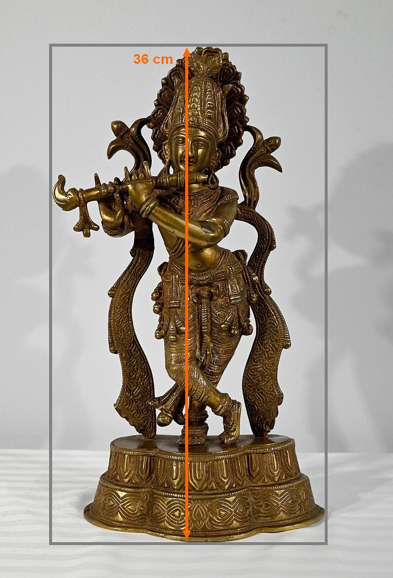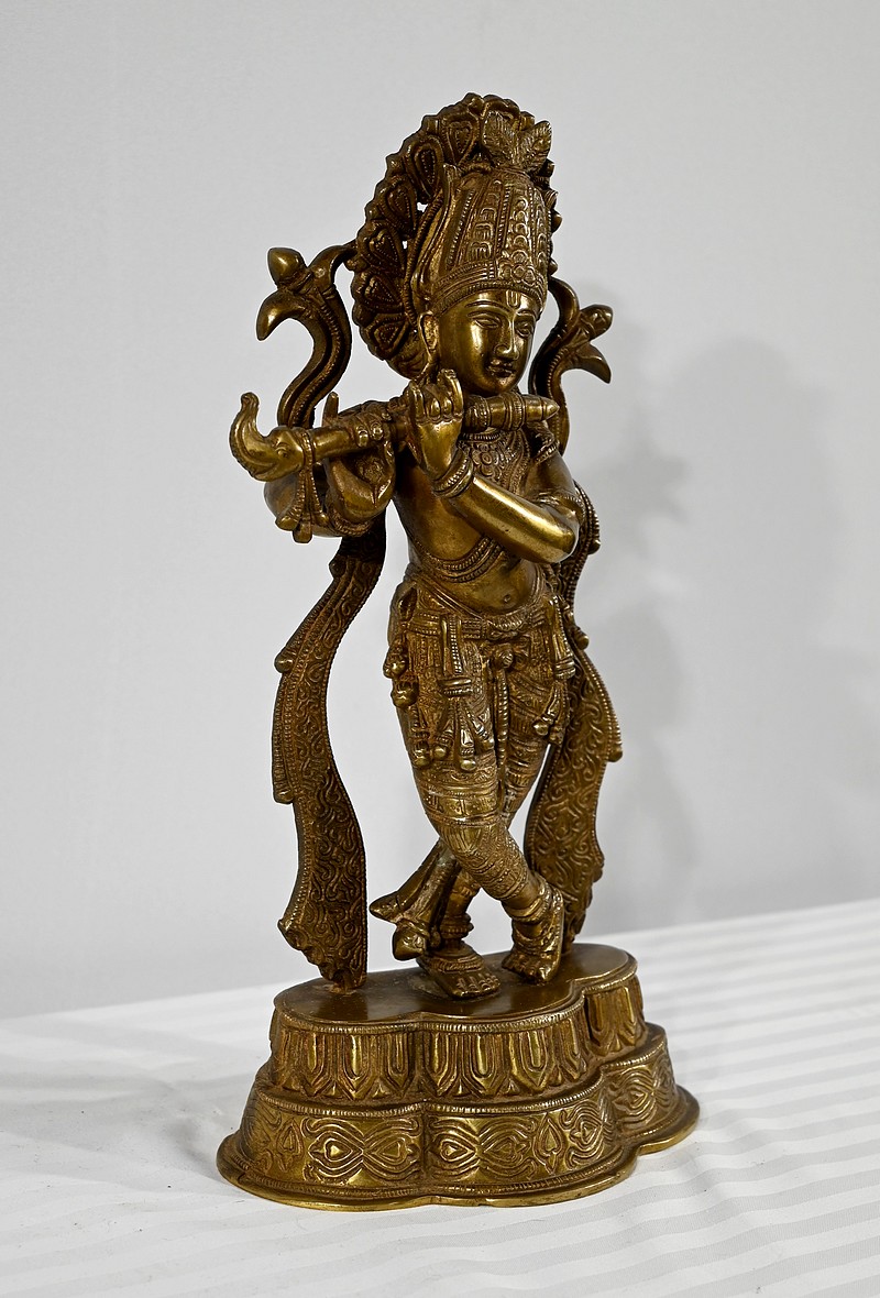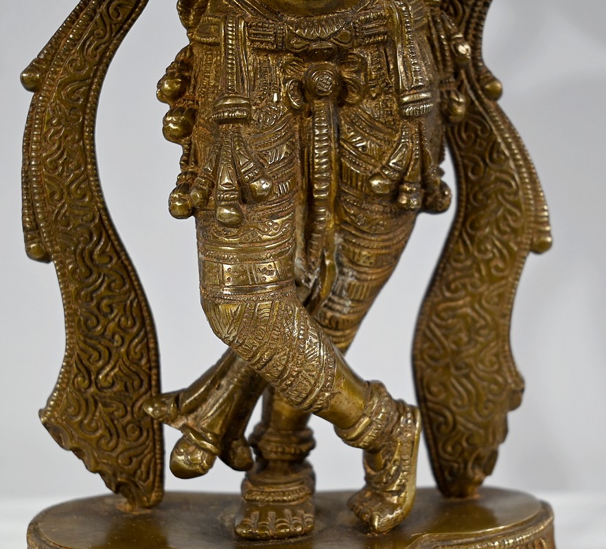 Krishna est représenté debout sur son autel, les jambes croisées, jouant de sa flute à tête d’éléphant. Ce sujet, intégralement ciselé de motifs indiens, repose sur une base mouvementée également ouvragée.