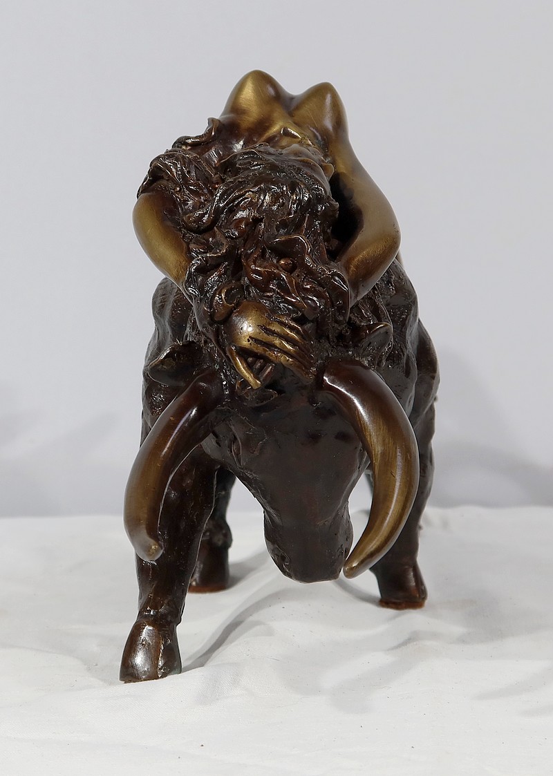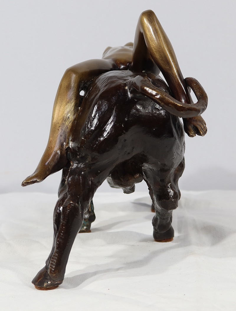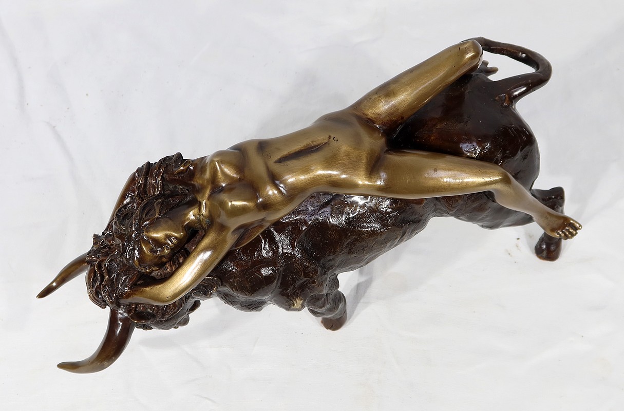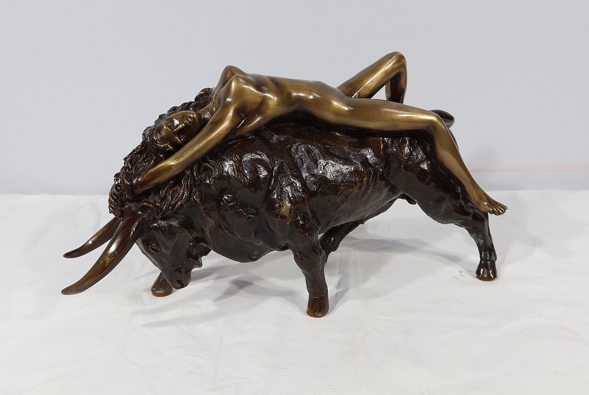 Épreuve en bronze à patine brune et patine médaille signé Majera. Cette œuvre puissante issue de la mythologie grecque, figure la déesse Europe nue, allongée sur un Taureau. Fille du roi de Tyr, Europe est enlevée par Zeus métamorphosé en Taureau afin de ne pas être reconnu.