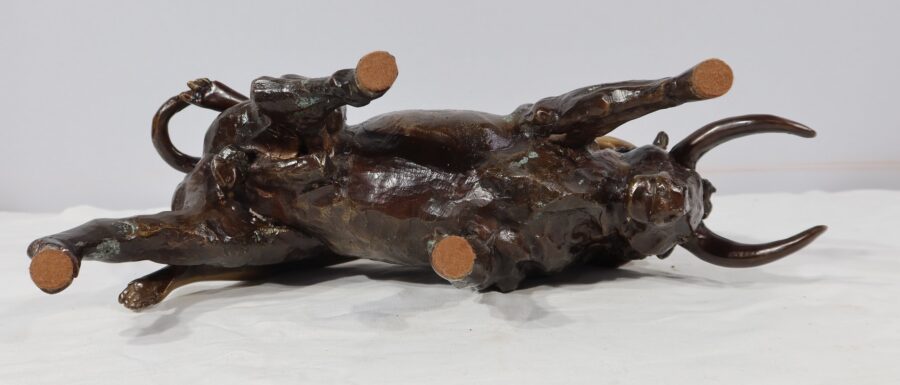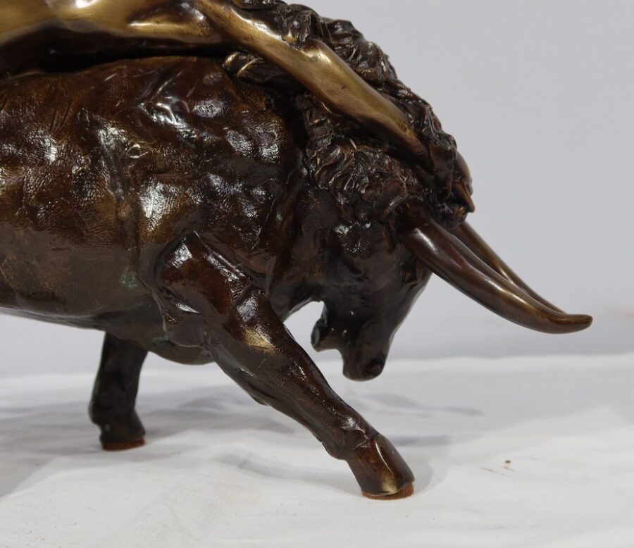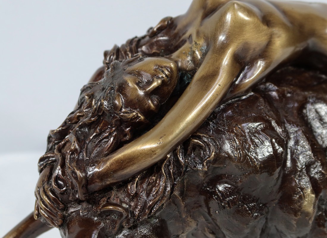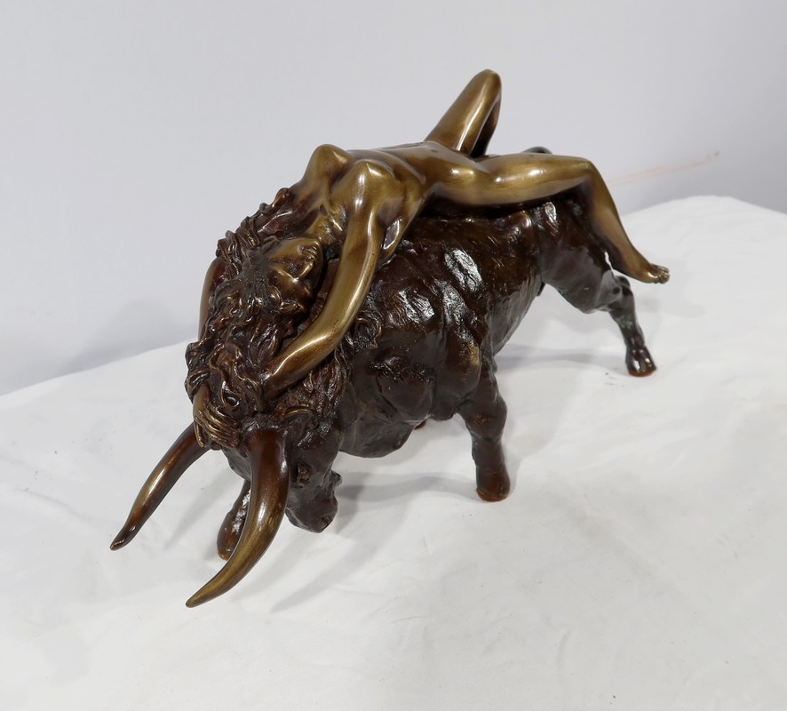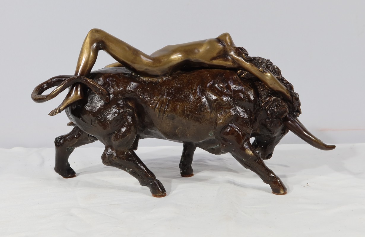 Épreuve en bronze à patine brune et patine médaille signé Majera. Cette œuvre puissante issue de la mythologie grecque, figure la déesse Europe nue, allongée sur un Taureau. Fille du roi de Tyr, Europe est enlevée par Zeus métamorphosé en Taureau afin de ne pas être reconnu.