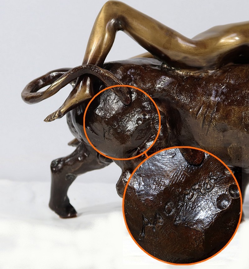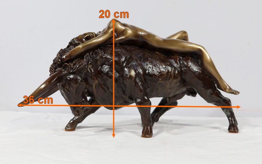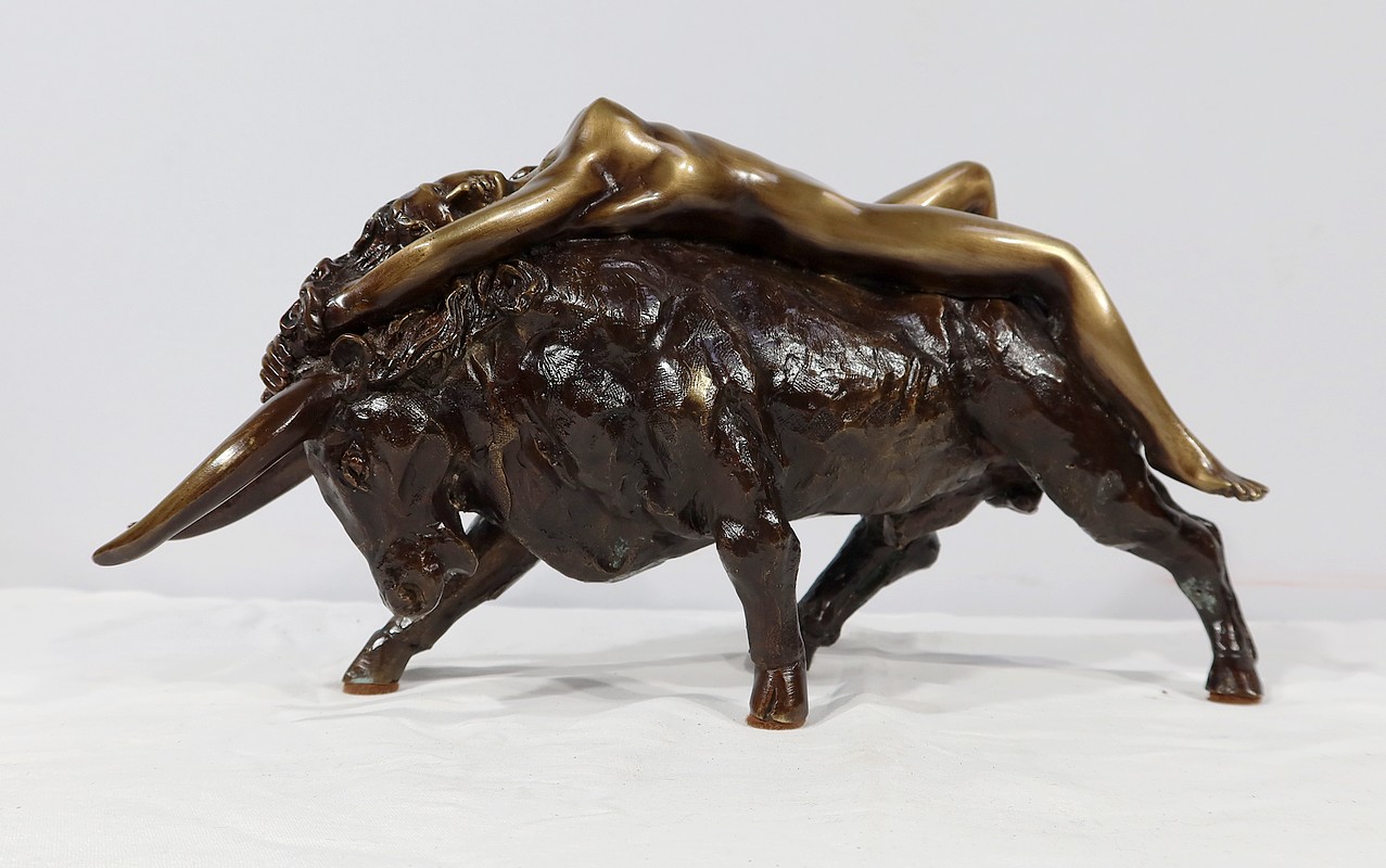 Ayant une forte symbolique, le Taureau, la tête basse reflète ici toute sa force et sa vitalité. Europe, lascive et souriante, est étendue attendant la transformation de son amant.