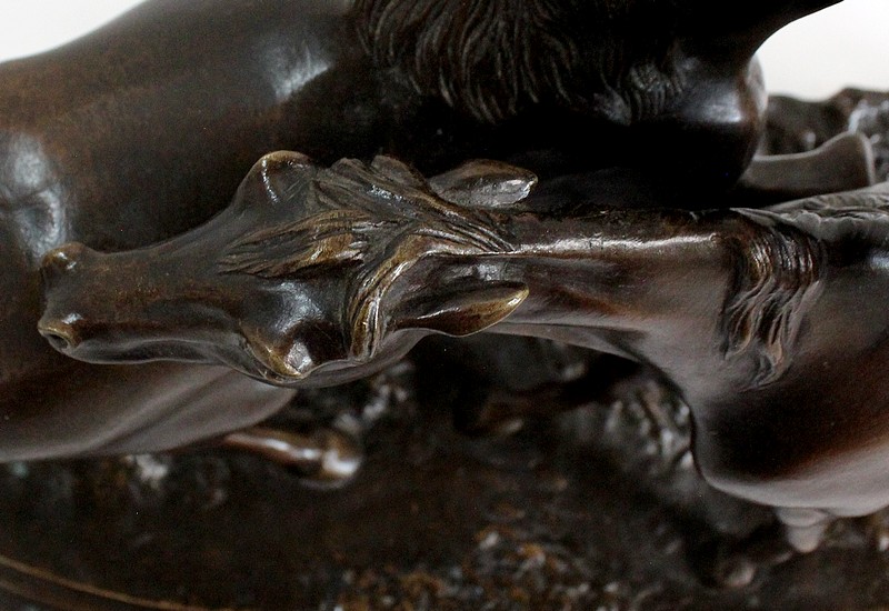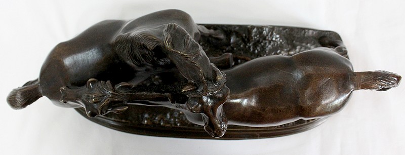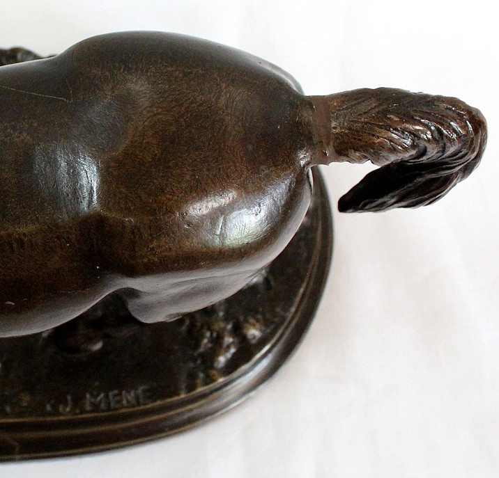 L’Ensemble repose sur une terrasse où nous retrouvons la Signature « J. MENE », Artiste considéré comme un des principaux représentants de la Sculpture Animalière au XIXe siècle.
