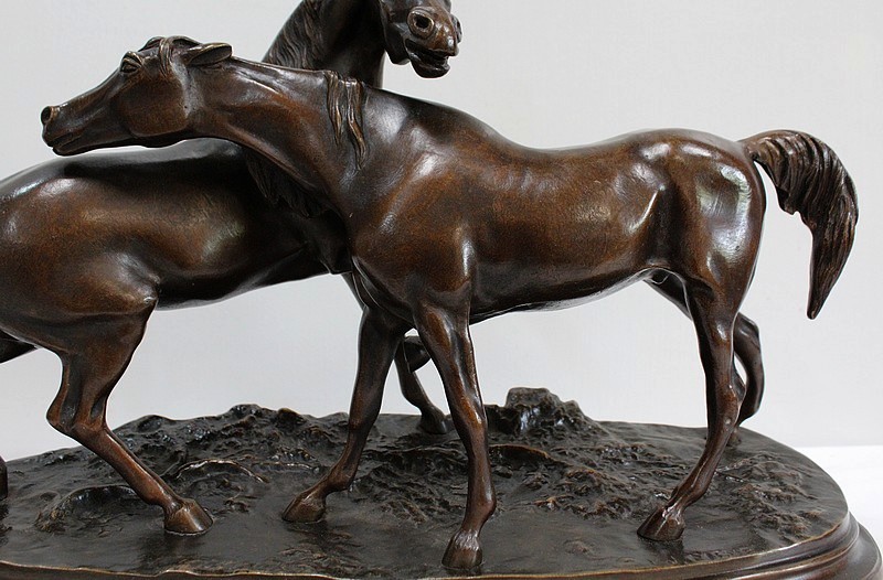 Sculptés finement, les équidés semblent figés dans le temps dans une Étreinte éternelle.