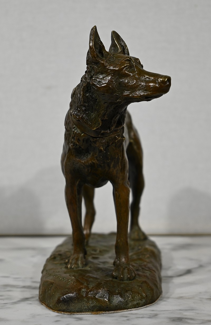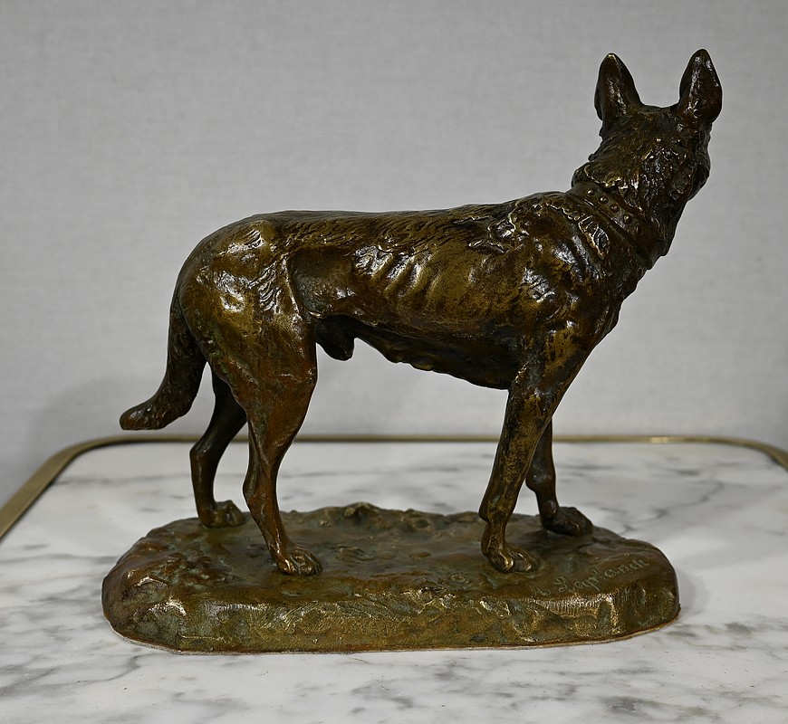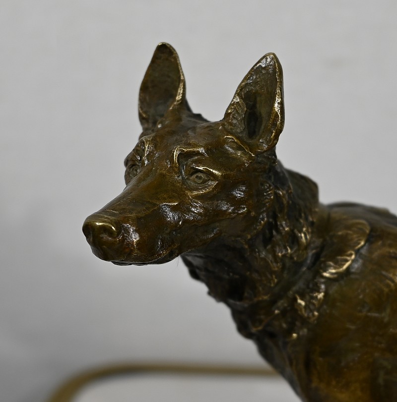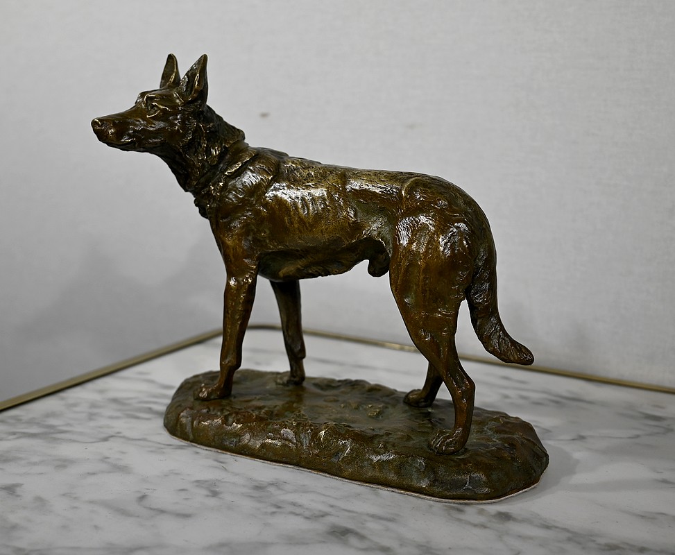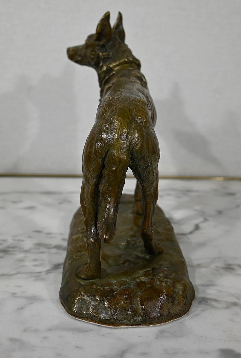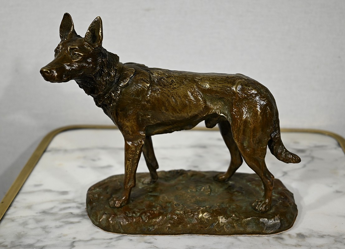 Épreuve en bronze à patine mordorée d’après Pierre-Albert Laplanche (1854-1935), représentant un chien berger allemand à l’arrêt.