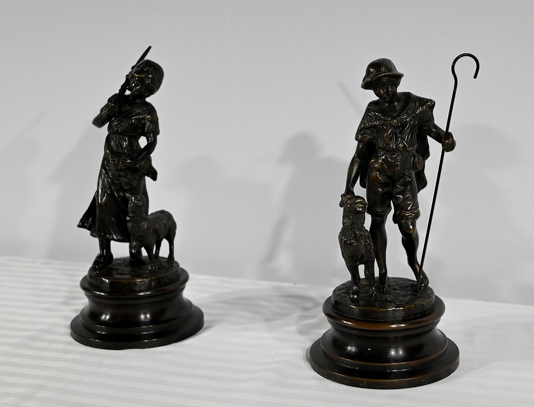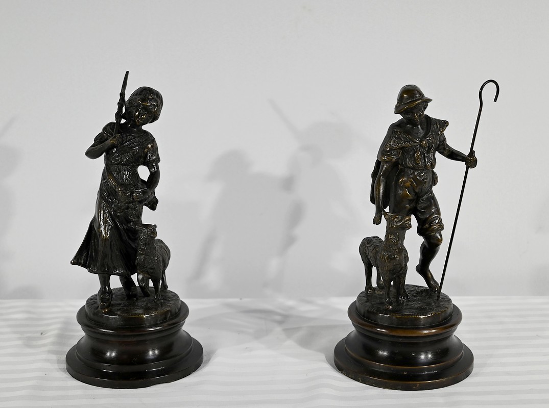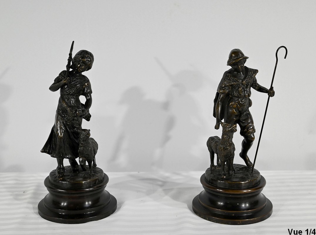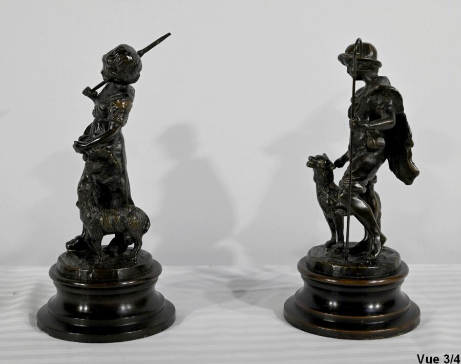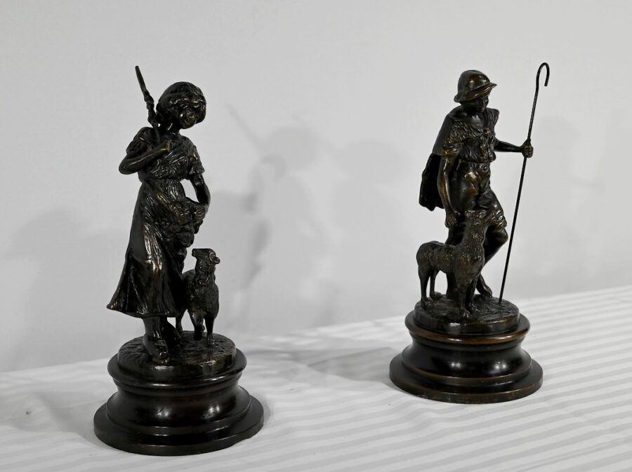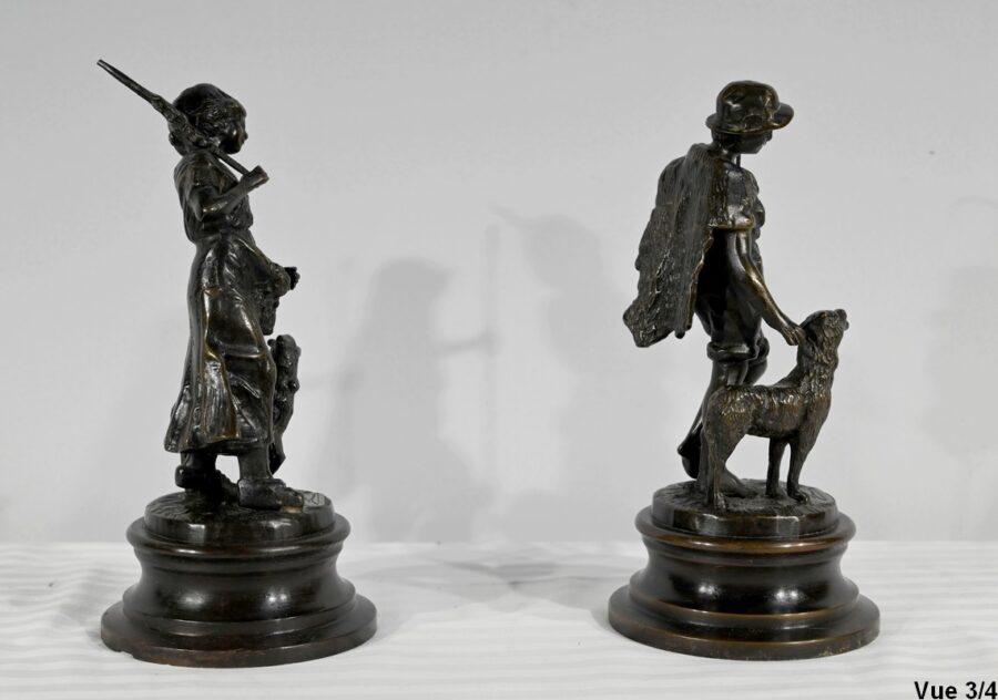 Couple de sujets en bronze à patine brune, signés Laurini sur la terrasse, d’après Louis et François Moreau. Respectivement connus sous les noms d’Auguste (1855-1919) et Hippolyte Moreau (1832-1926), ces sculpteurs français sont connus pour leurs travaux, maintes fois récompensés.