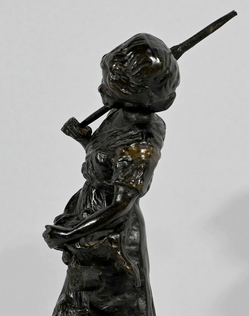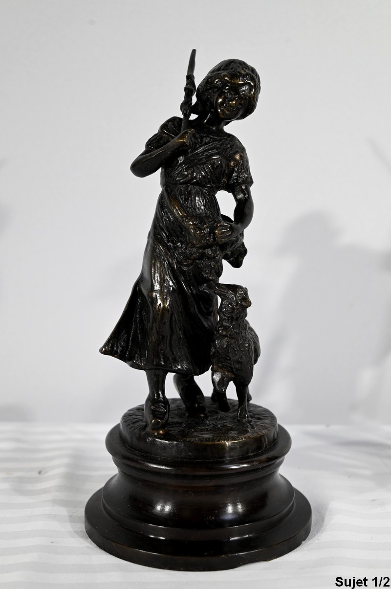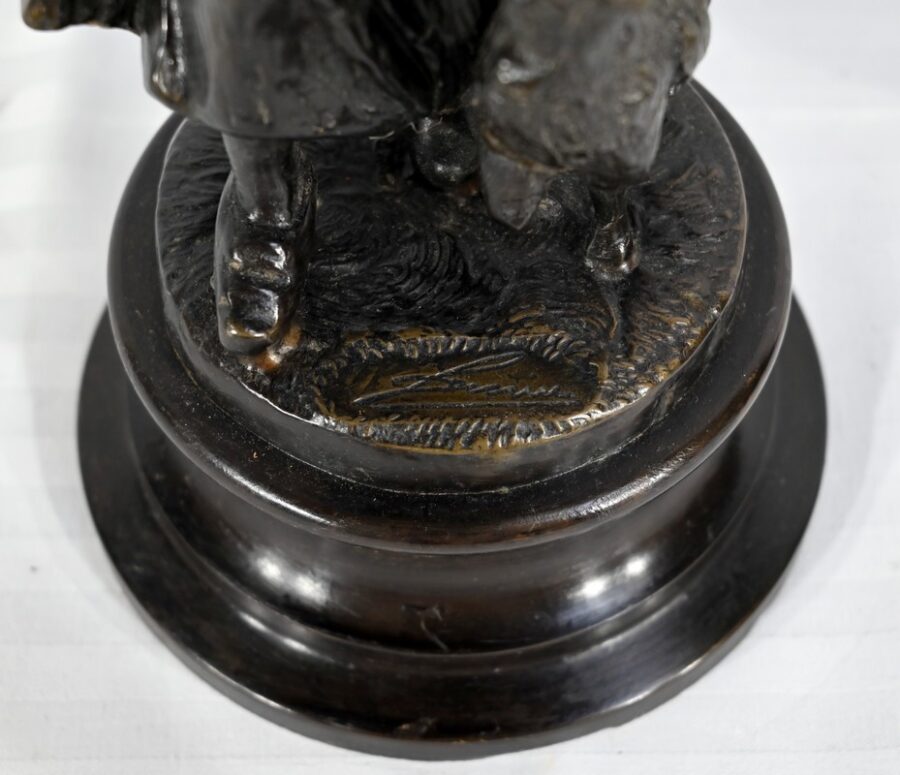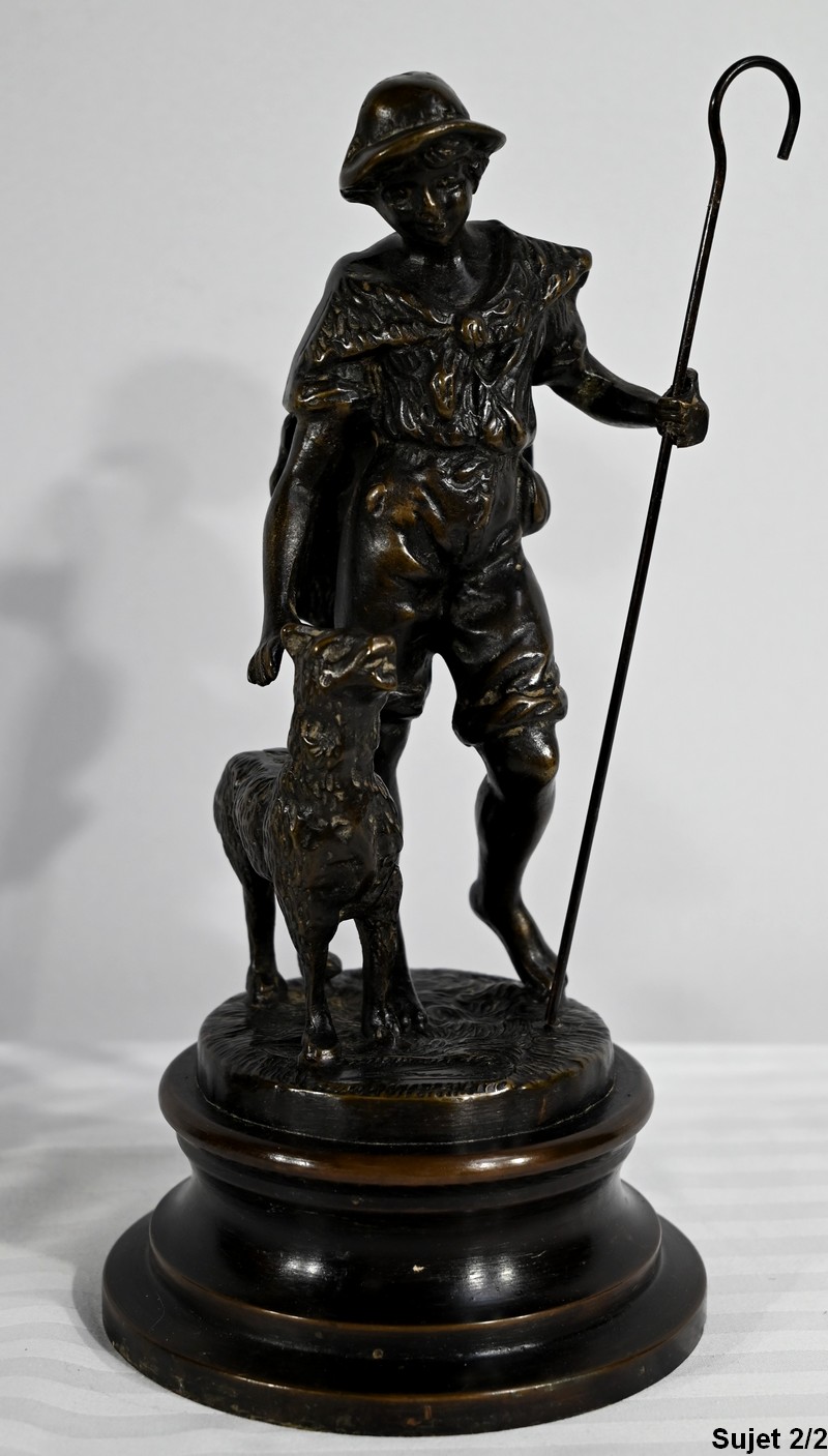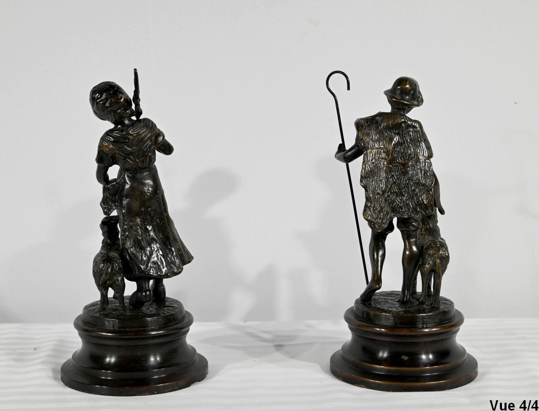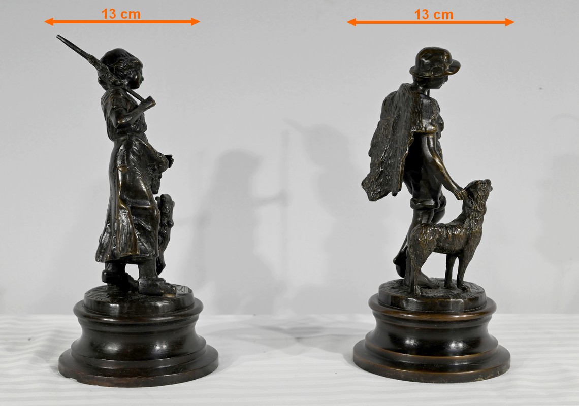 Couple de sujets en bronze à patine brune, signés Laurini sur la terrasse, d’après Louis et François Moreau. Respectivement connus sous les noms d’Auguste (1855-1919) et Hippolyte Moreau (1832-1926), ces sculpteurs français sont connus pour leurs travaux, maintes fois récompensés.