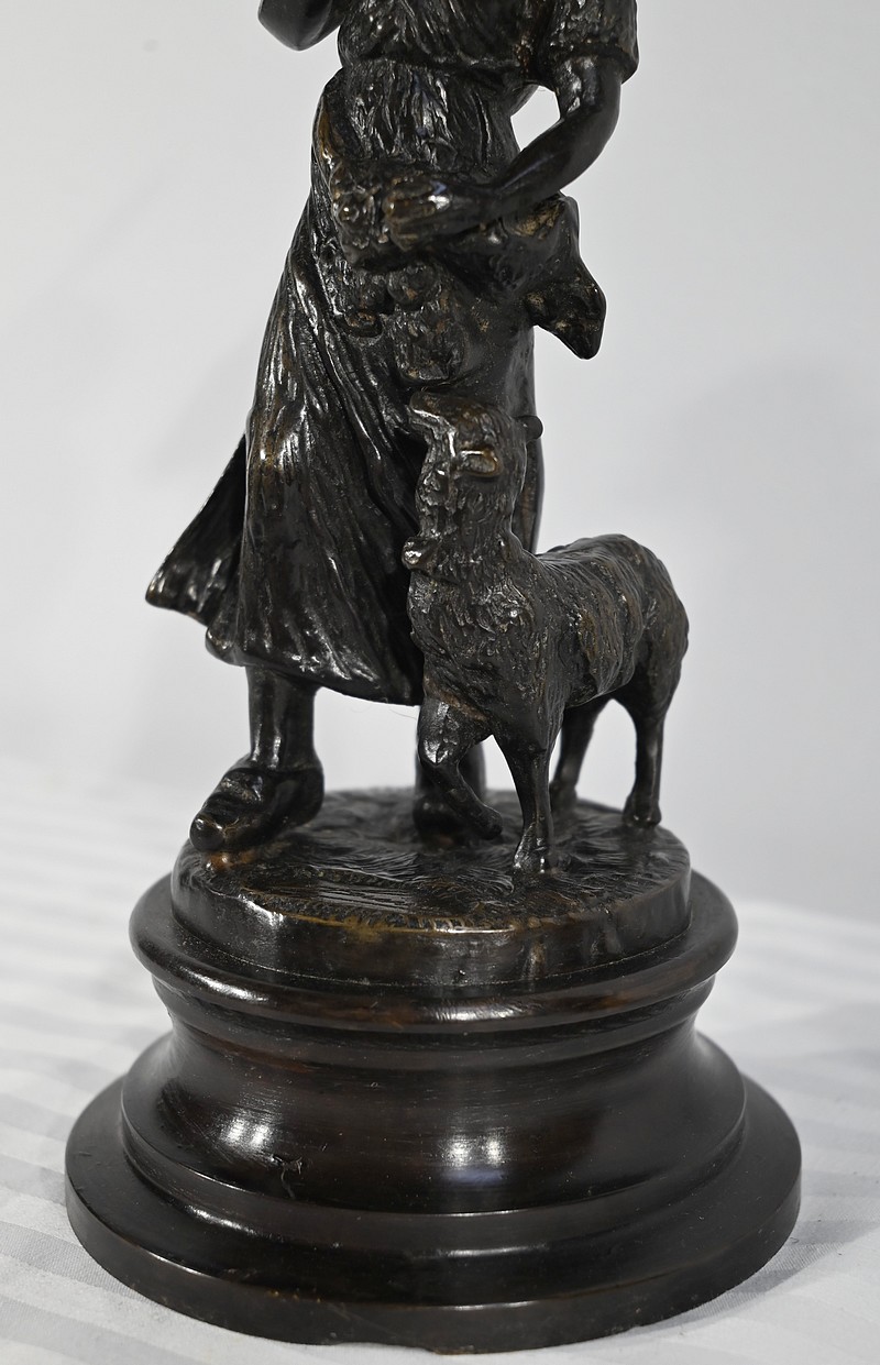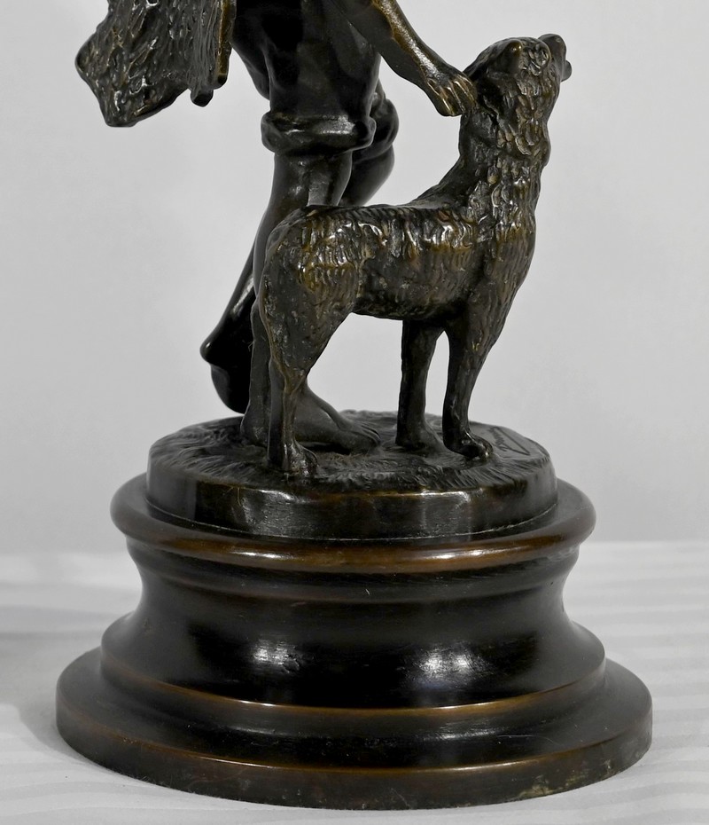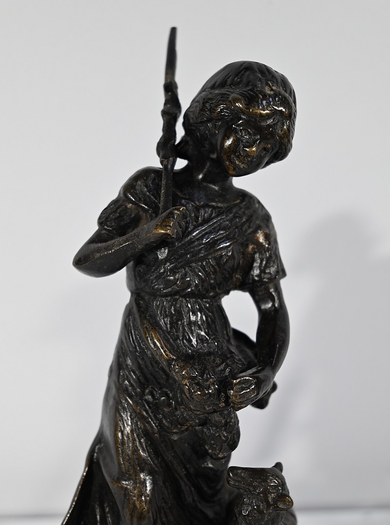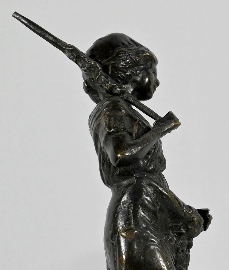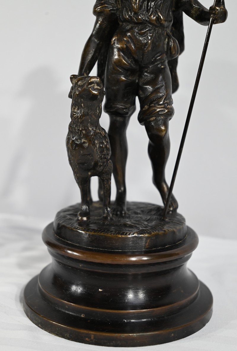 Couple de sujets en bronze à patine brune, signés Laurini sur la terrasse, d’après Louis et François Moreau. Respectivement connus sous les noms d’Auguste (1855-1919) et Hippolyte Moreau (1832-1926), ces sculpteurs français sont connus pour leurs travaux, maintes fois récompensés.