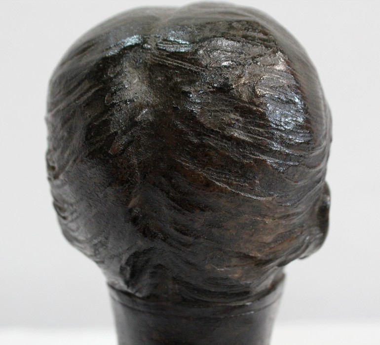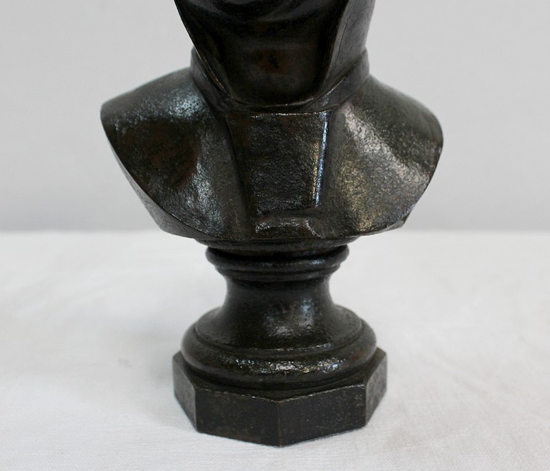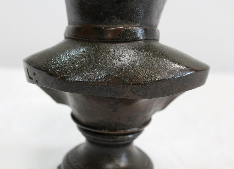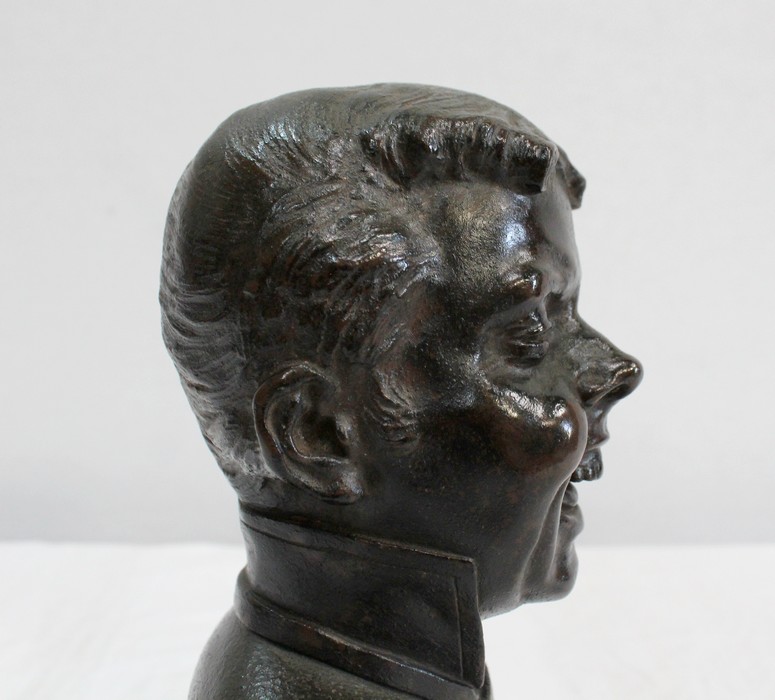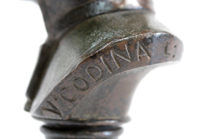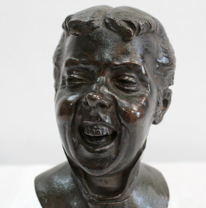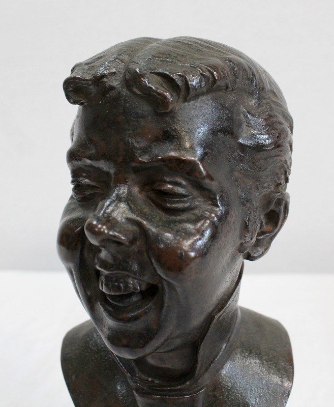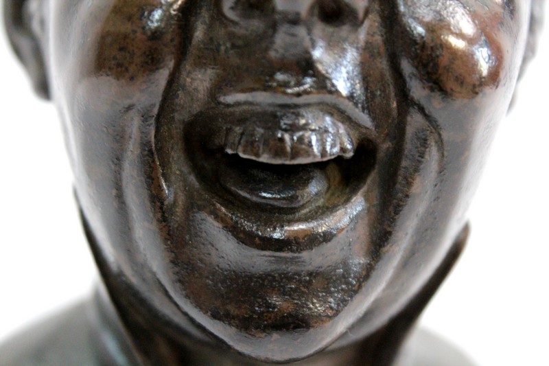 Buste en Bronze à patine brune reposant sur un piédouche de forme hexagonale, ayant pour thème un jeune homme en plein fou rire. Le sujet, soigneusement coiffé, le col de son vêtement remontant sur son cou, porte toutes les caractéristiques de l’hilarité sur son visage aux joues rebondies : un large sourire figé sur sa bouche, ouverte, nous laisse penser qu’il rit à gorge déployée. Les rides d’expression et les fossettes du personnage renforcent cette impression. A noté l’apposition de la marque de la fonderie espagnole CODINA sur le côté gauche.